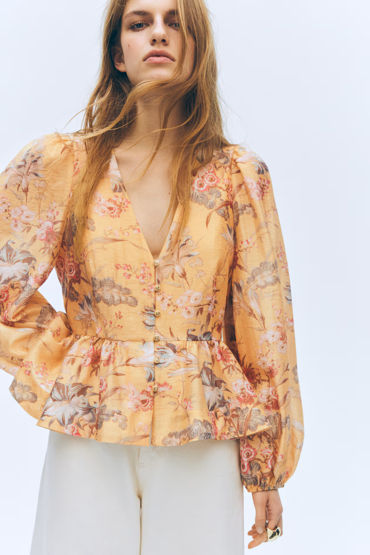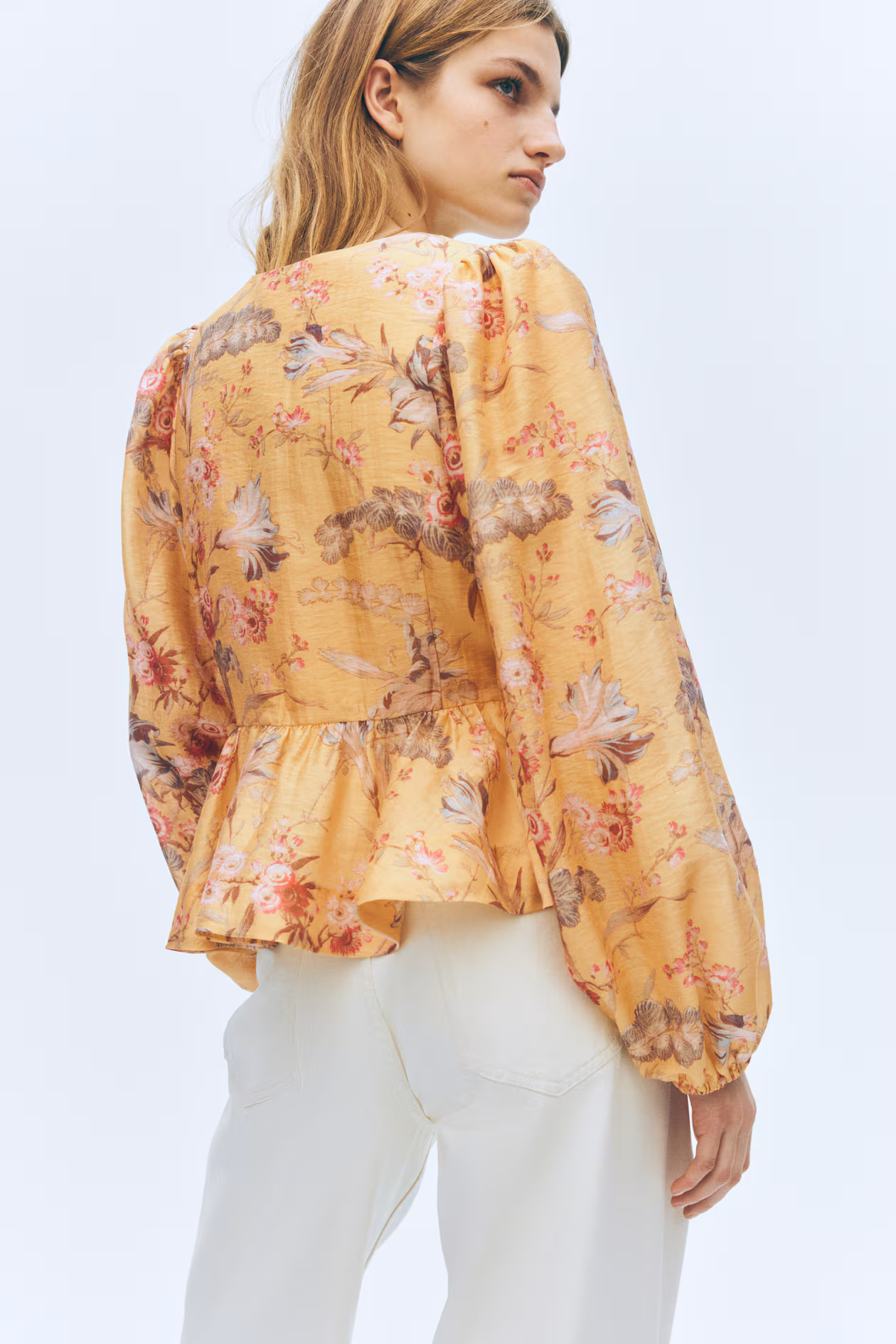Short, fitted blouse in a woven linen blend. Low-cut V-neck, buttons at front, long balloon sleeves with narrow elastic at cuffs, and a peplum. Partially lined.