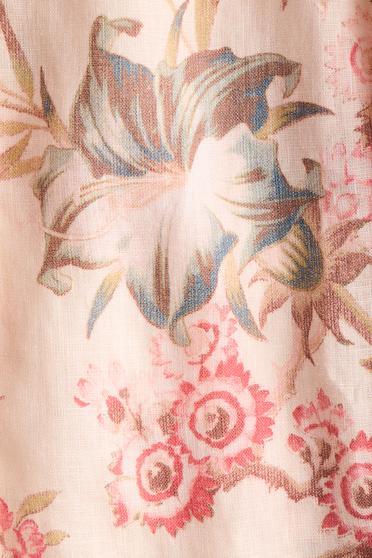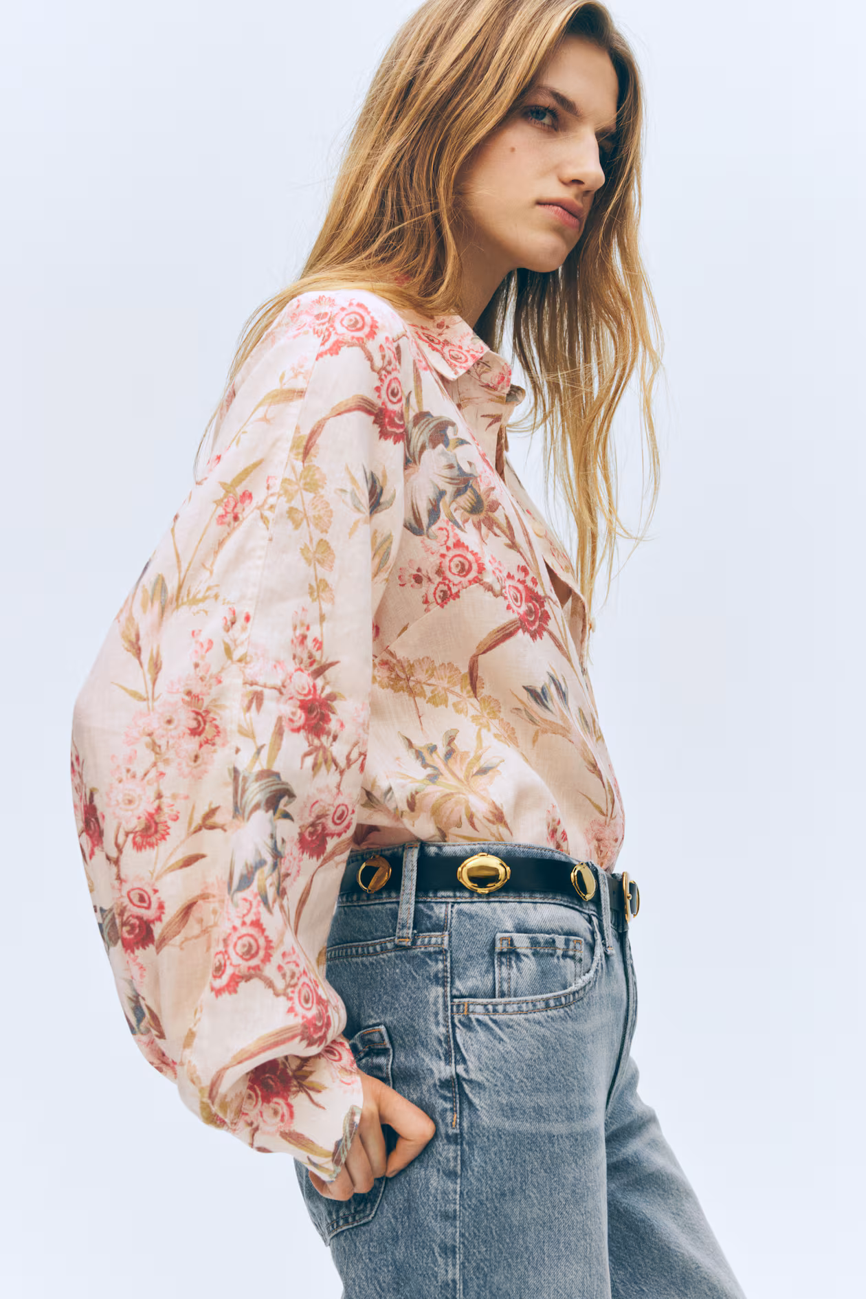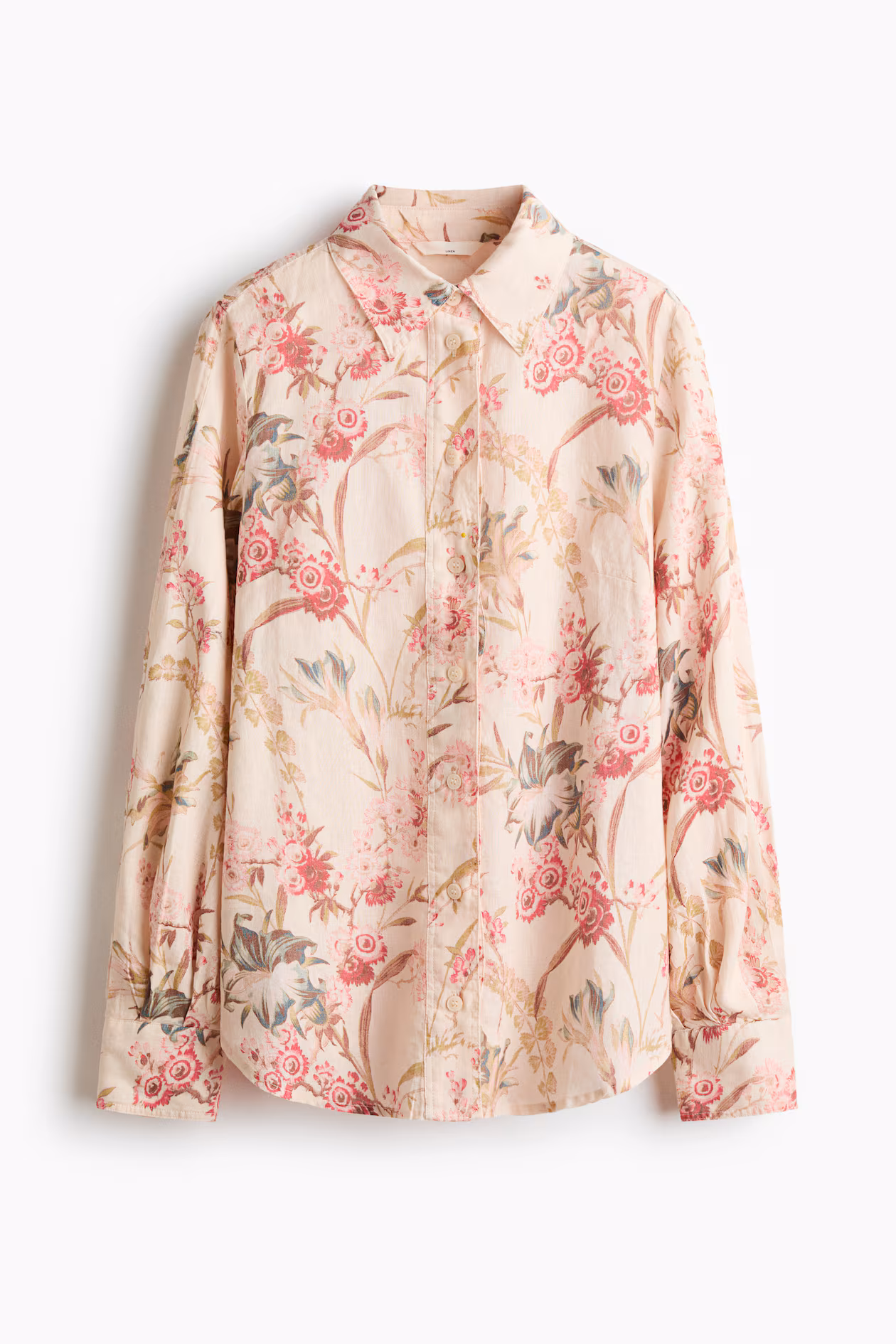 Shirt in airy woven linen. Collar, buttons at front, and a yoke at back with box pleat. Long sleeves with pleats for added volume, and button at cuffs. Rounded hem.