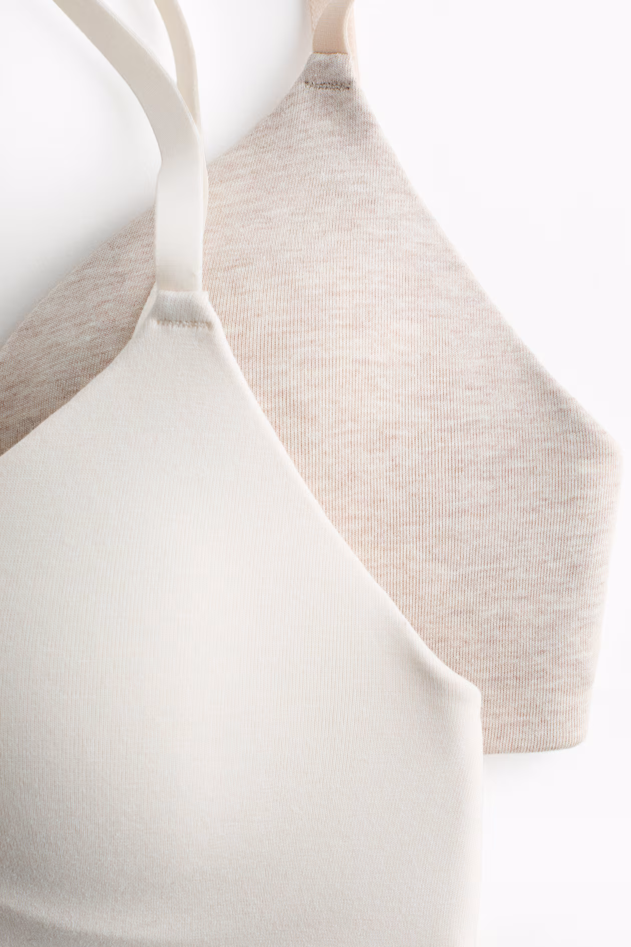 Soft-cup bras in cotton jersey. Adjustable shoulder straps, padded cups for shaping and good support, and hook-and-eye fasteners at back.