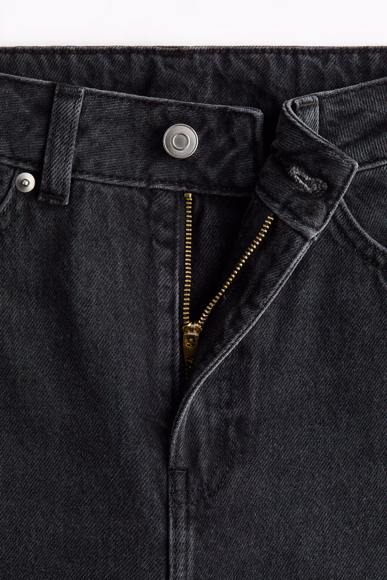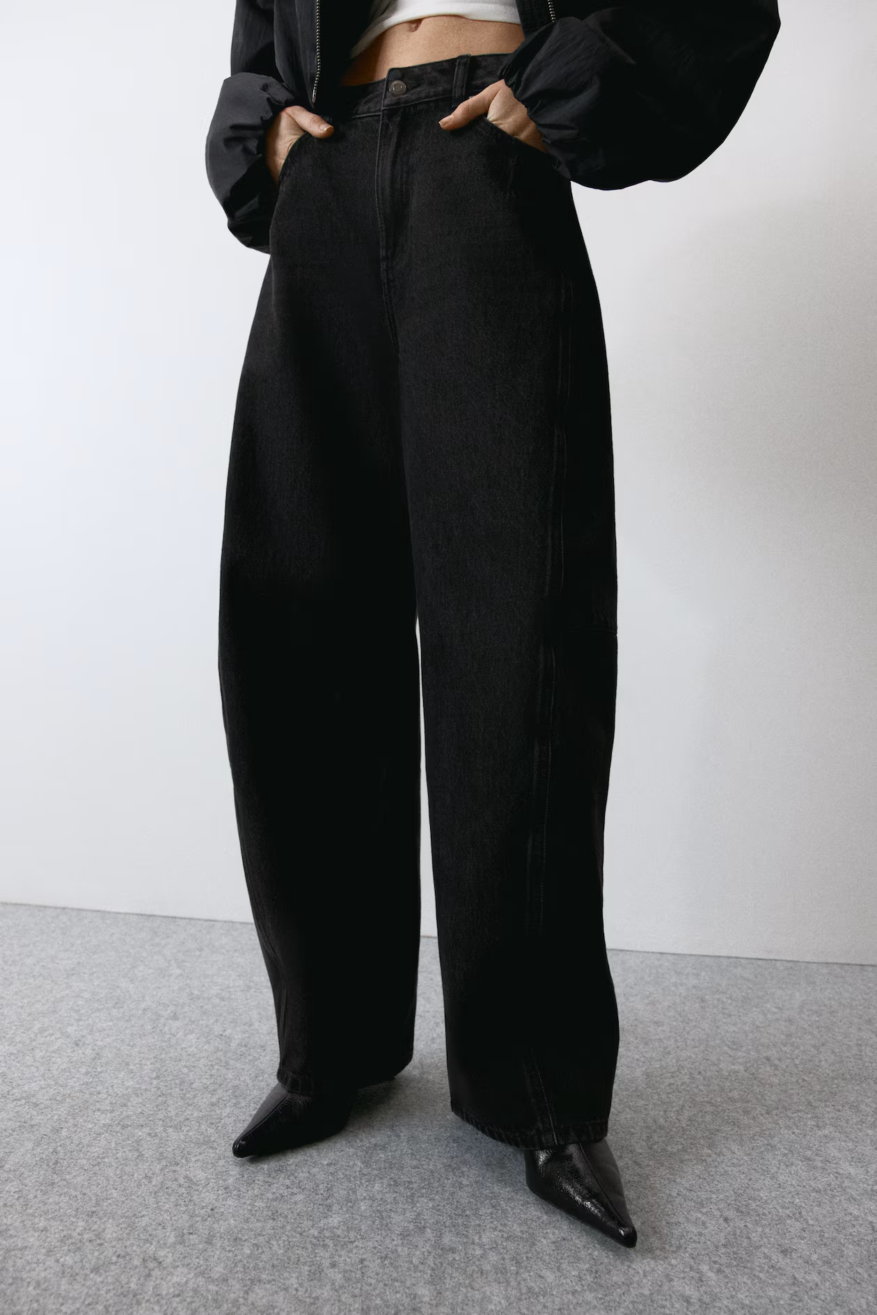 5-pocket jeans in rigid cotton denim that feels firm at first, softening and relaxing with wear. Regular fit from hip to thigh. High waist, zip fly with button, and voluminous, curved legs, tapered to hems. Regular length, designed to fall at top of foot with little or no stacking. Style with an oversized blazer for a modern look.