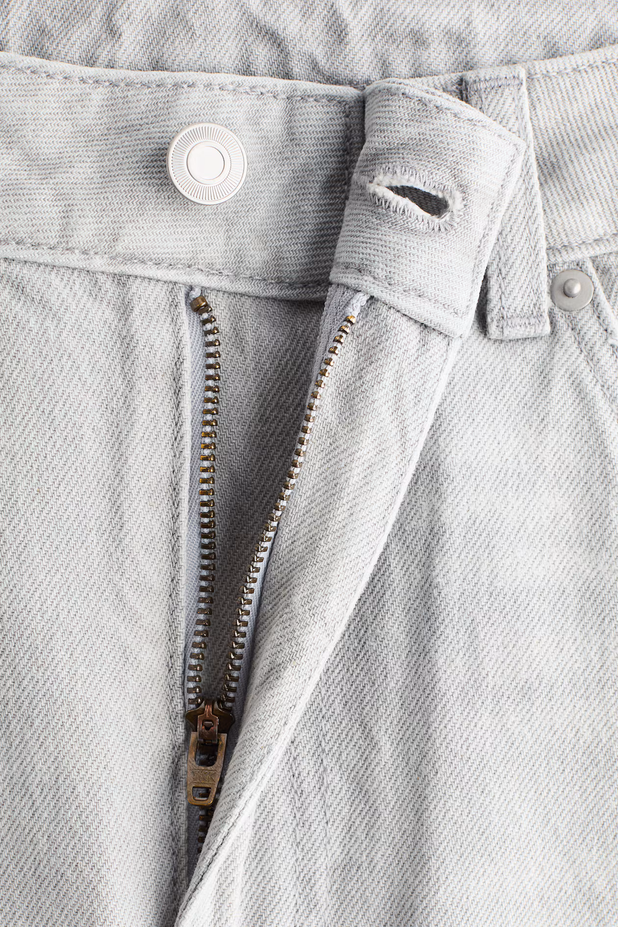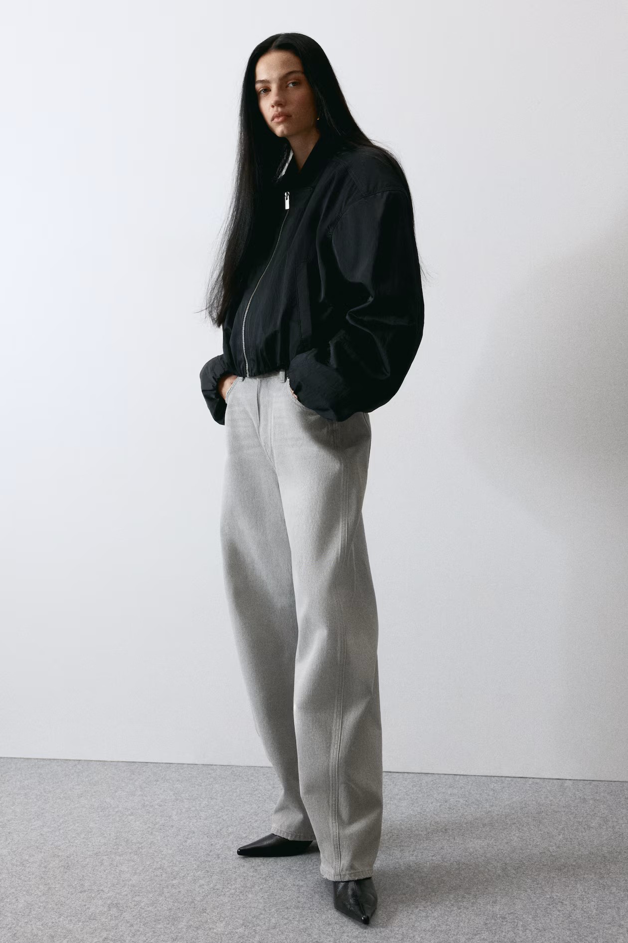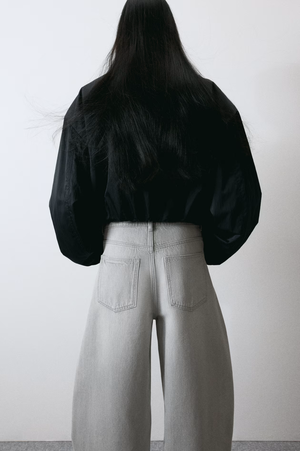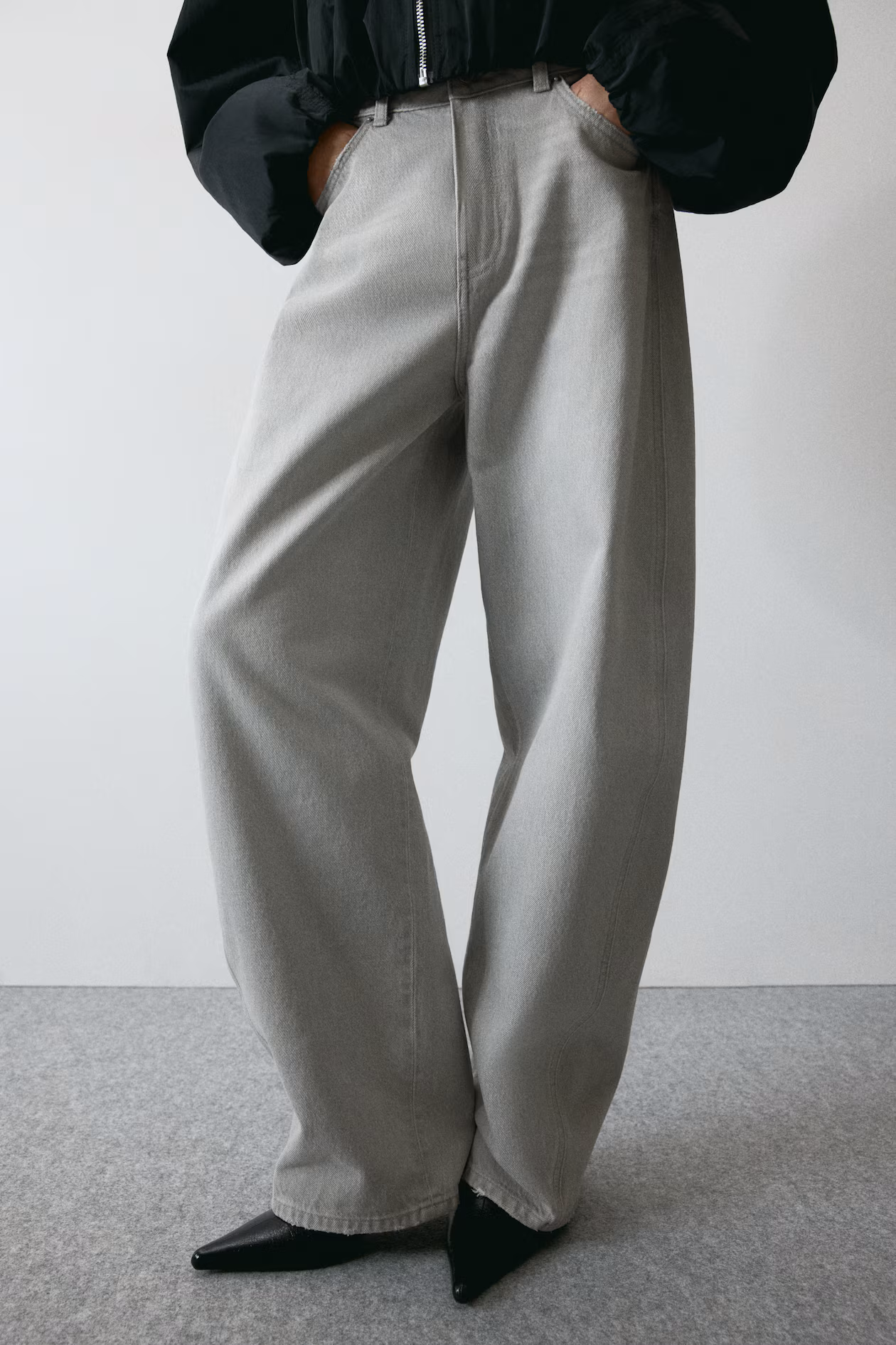 5-pocket jeans in rigid cotton denim that feels firm at first, softening and relaxing with wear. Regular fit from hip to thigh. High waist, zip fly with button, and voluminous, curved legs, tapered to hems. Regular length, designed to fall at top of foot with little or no stacking. Style with an oversized blazer for a modern look.