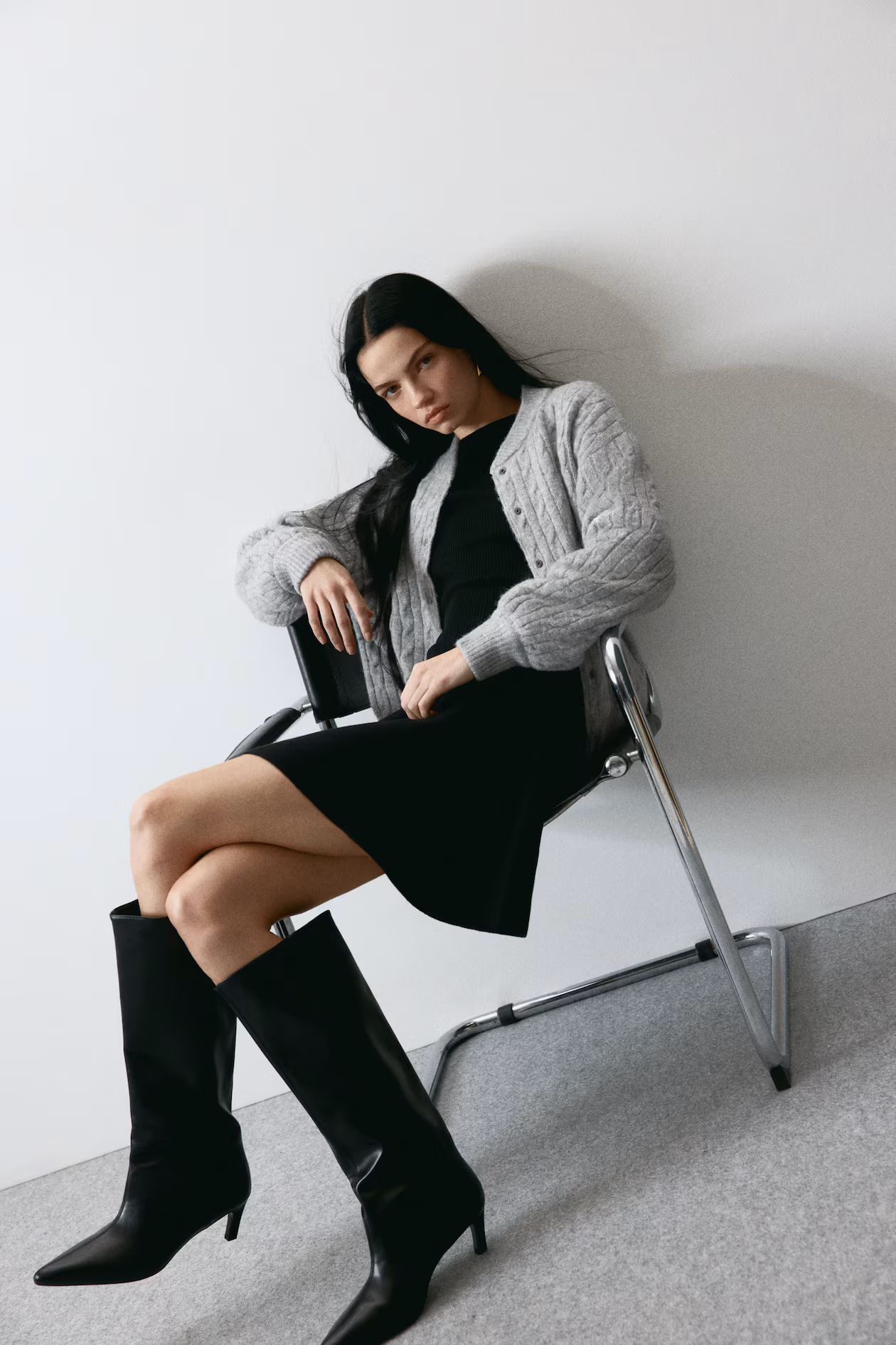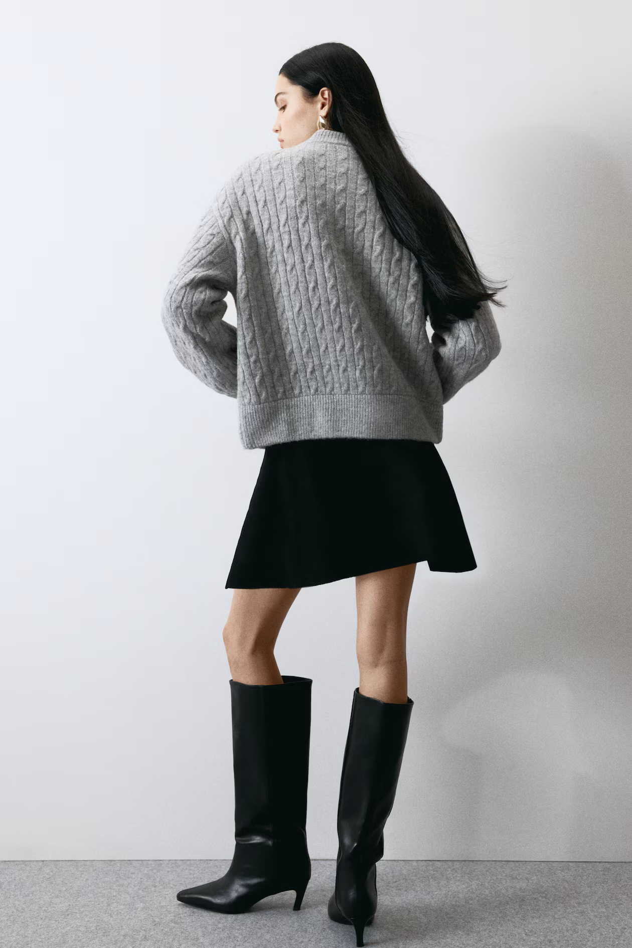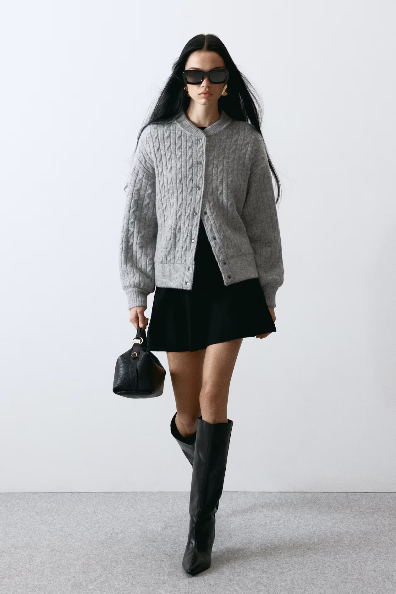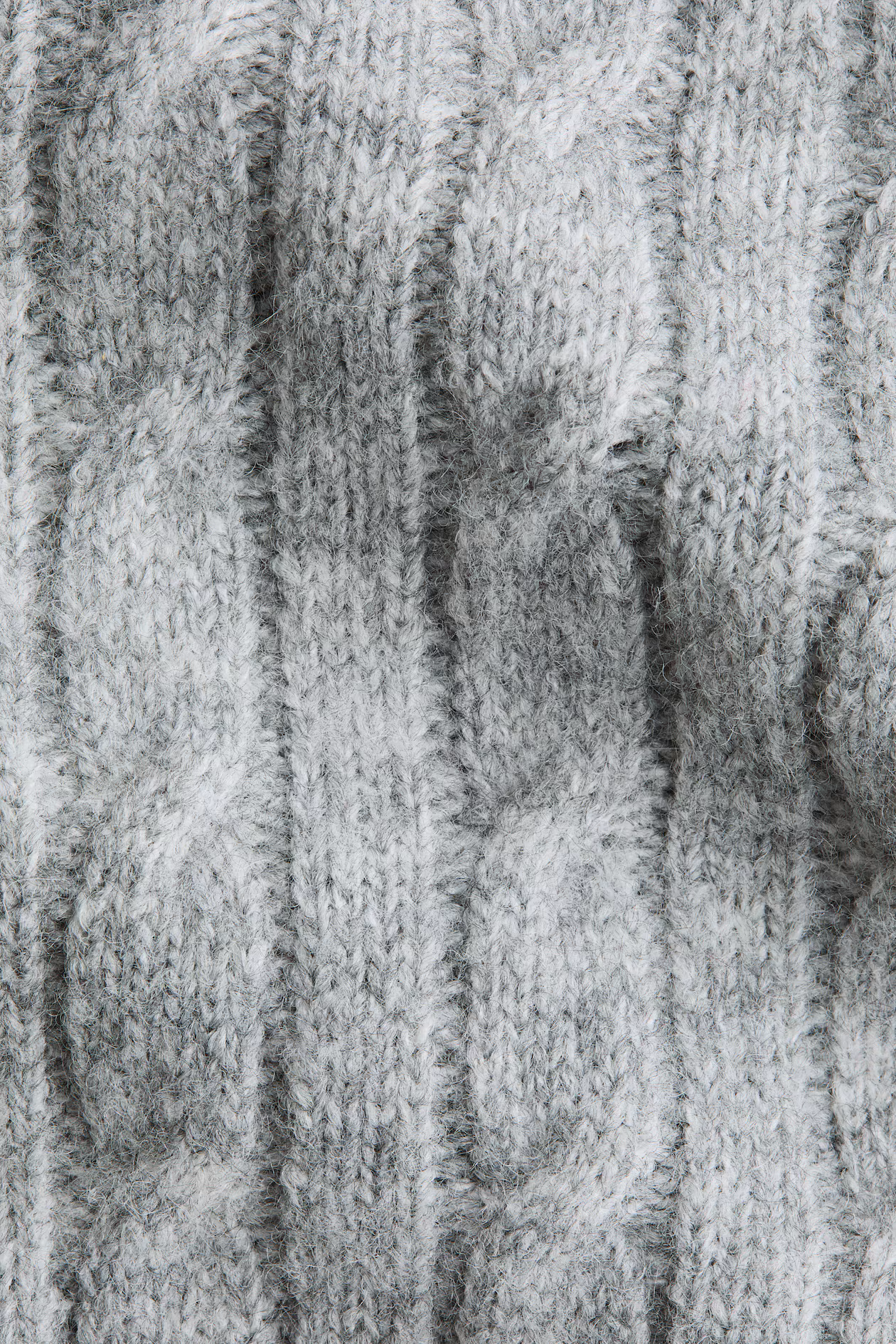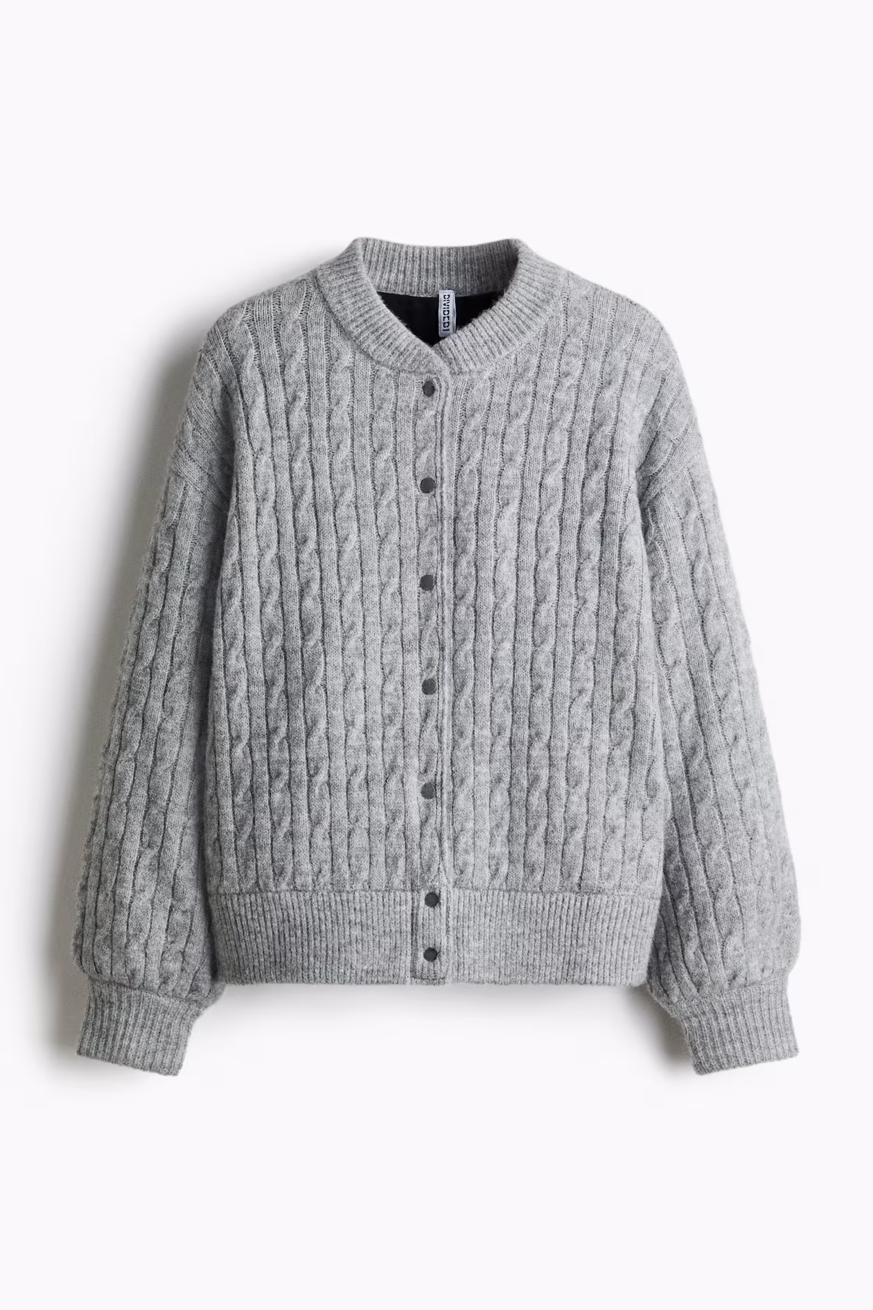 Loose-fit jacket in a soft cable knit with wool content. Stand-up collar, snap fasteners at front, dropped shoulders, and long sleeves. Ribbing at collar, cuffs, and hem. Lined.
