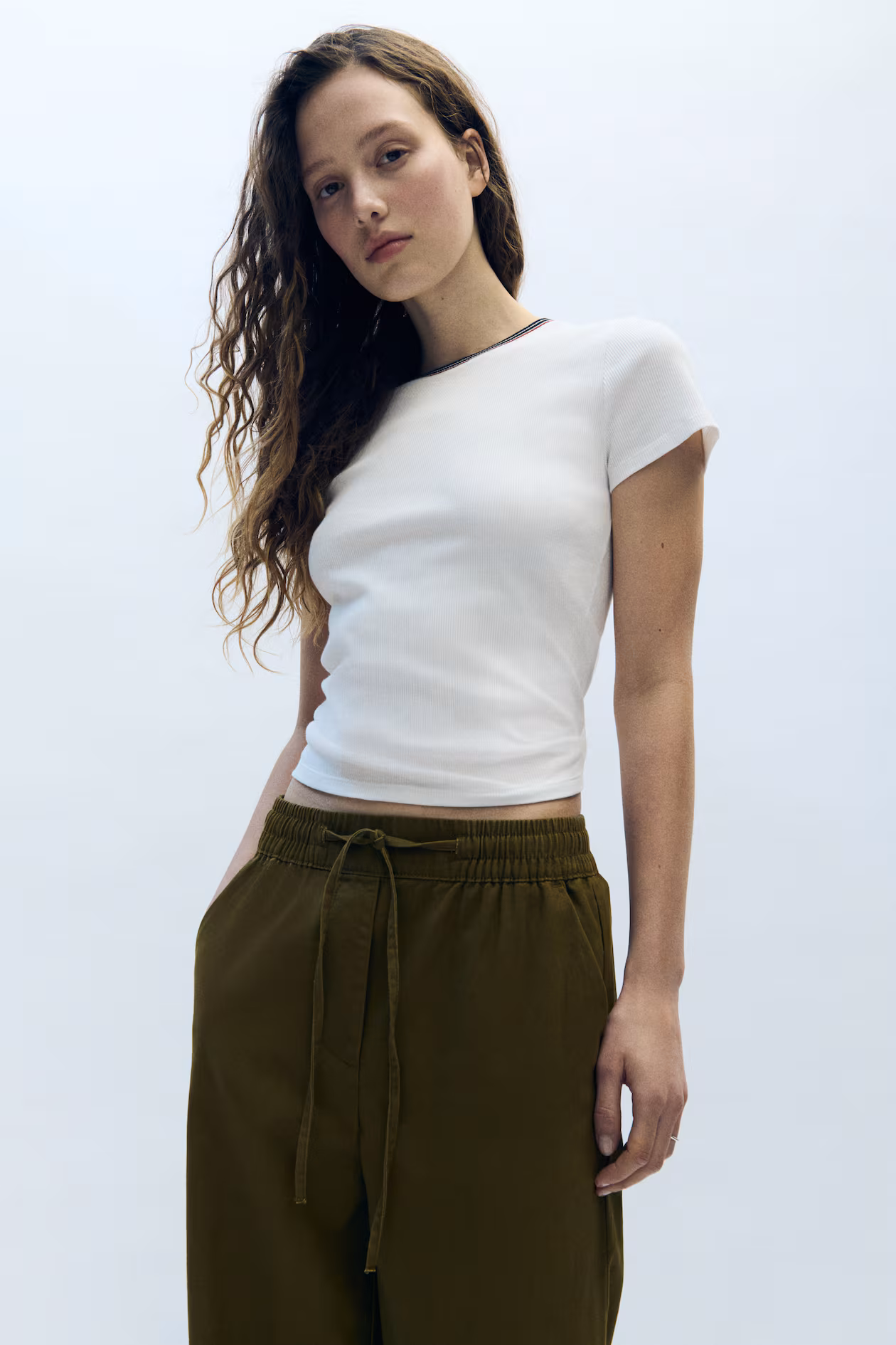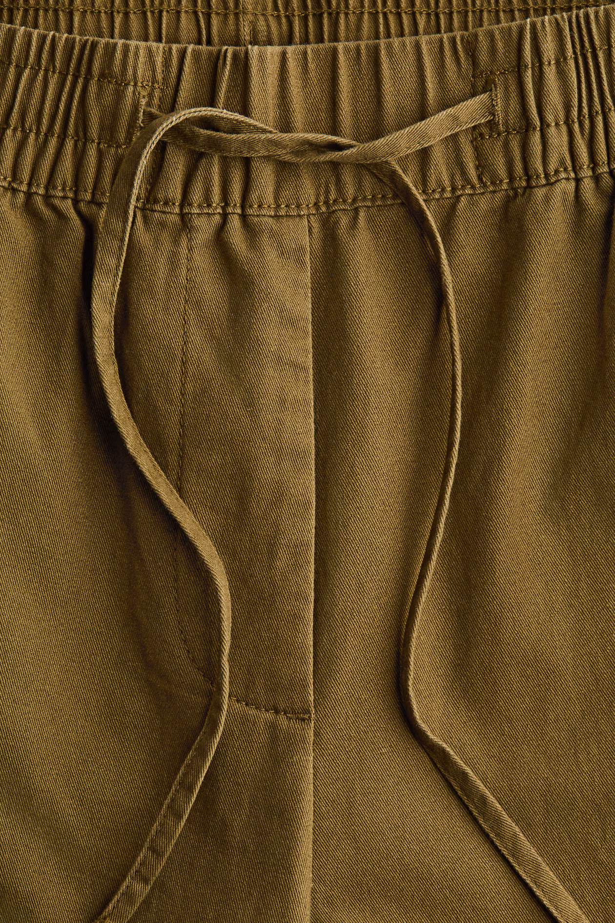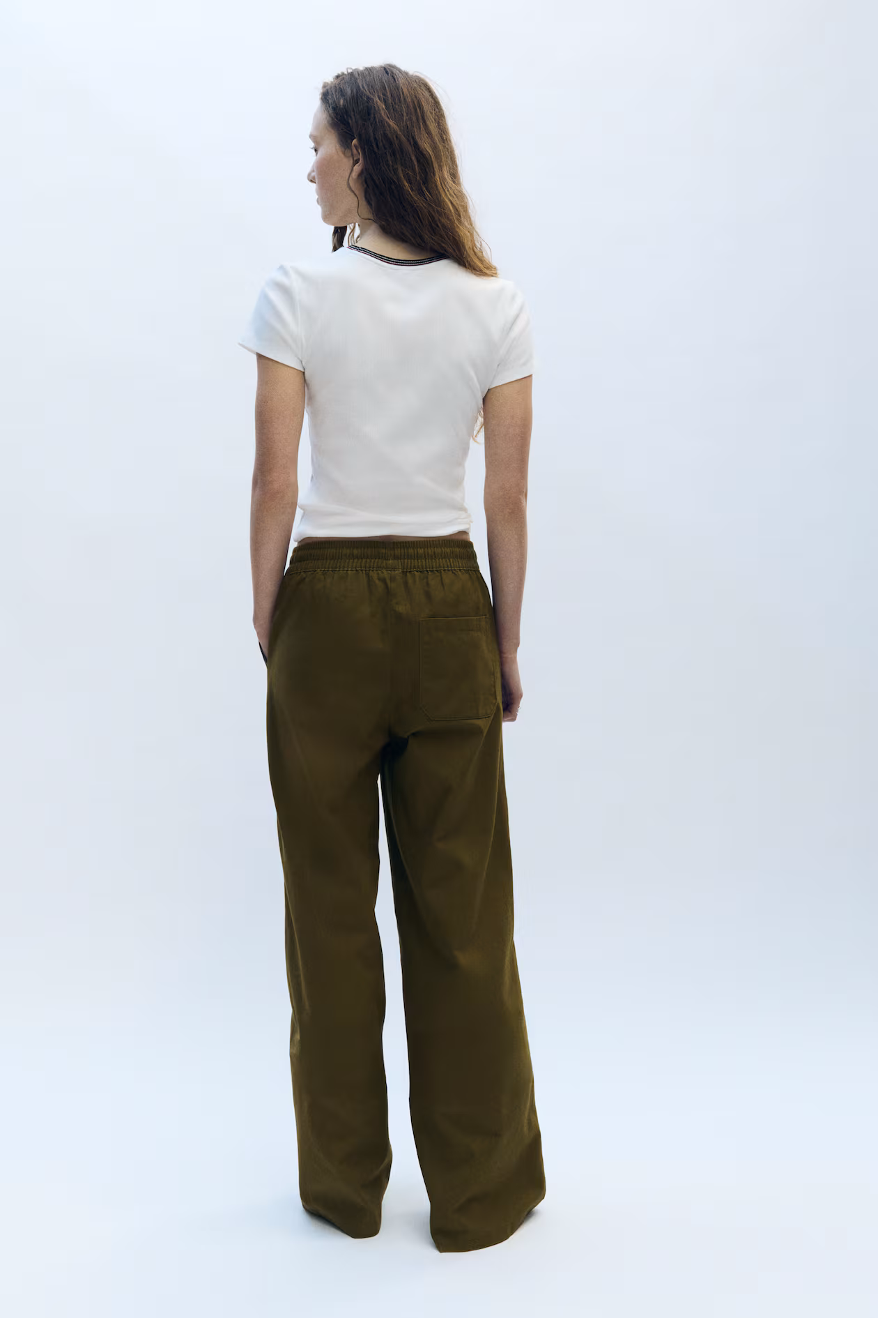 Relaxed-fit pants in cotton twill. Elasticized, drawstring waistband, diagonal front pockets, and a patch back pocket. Wide legs.