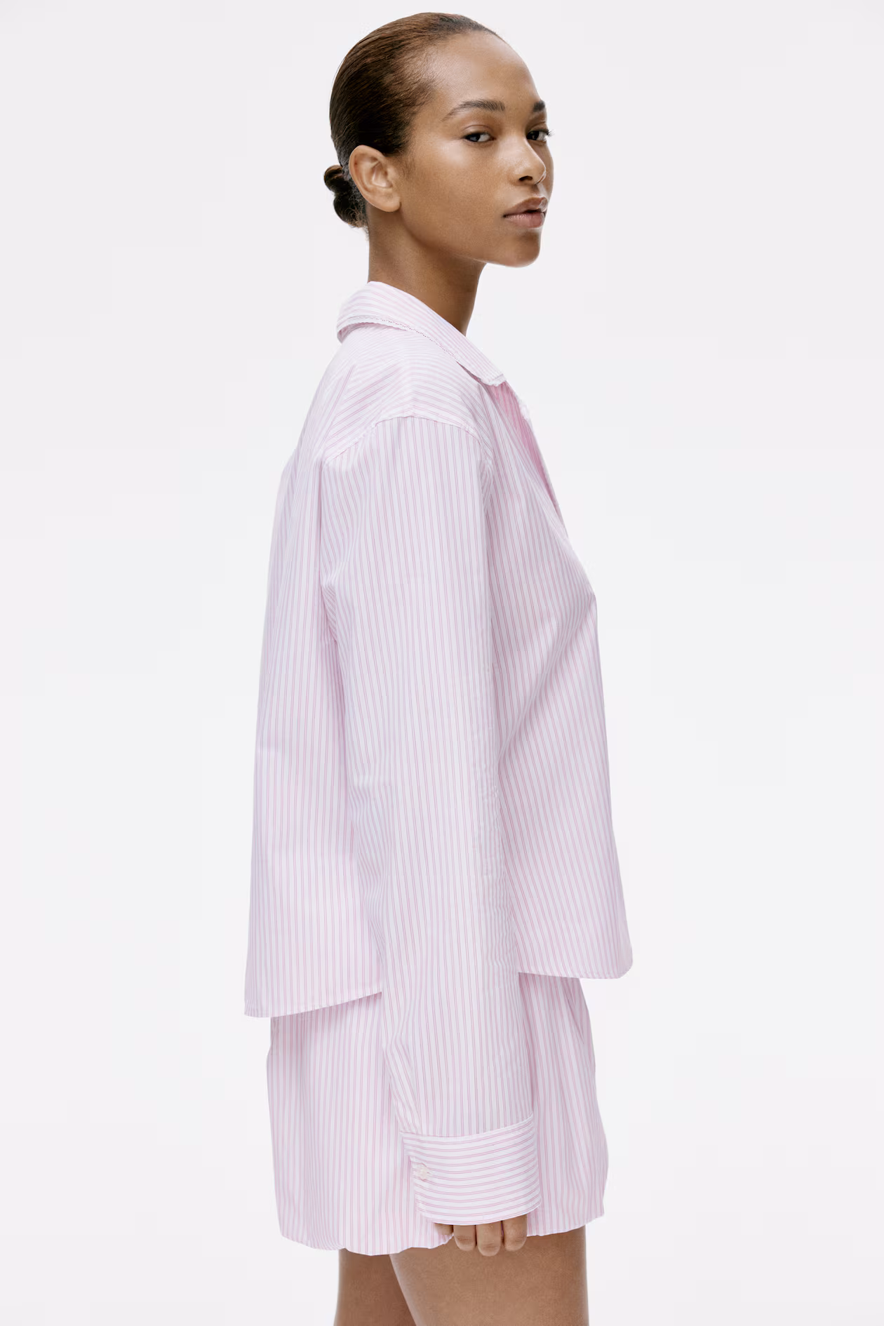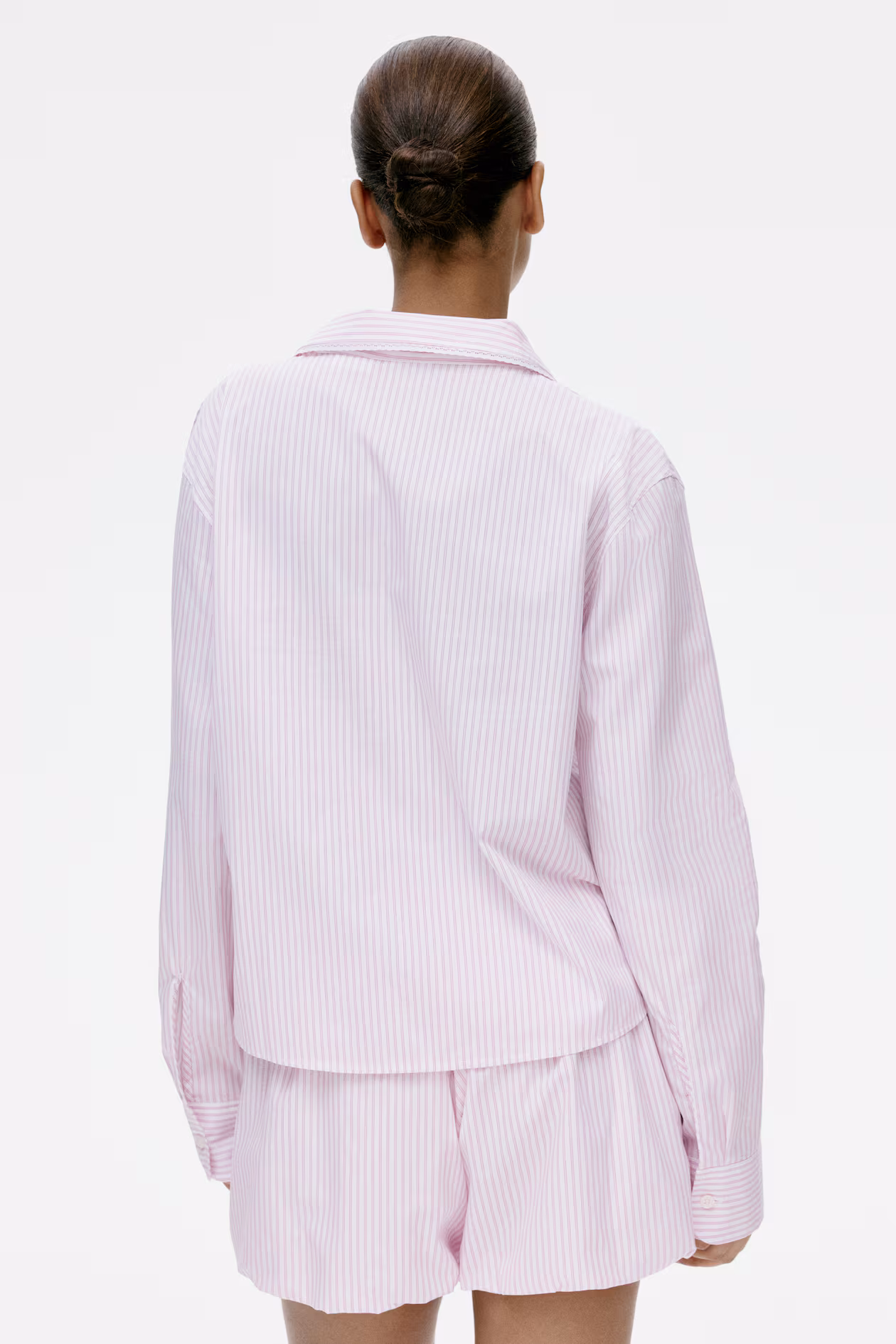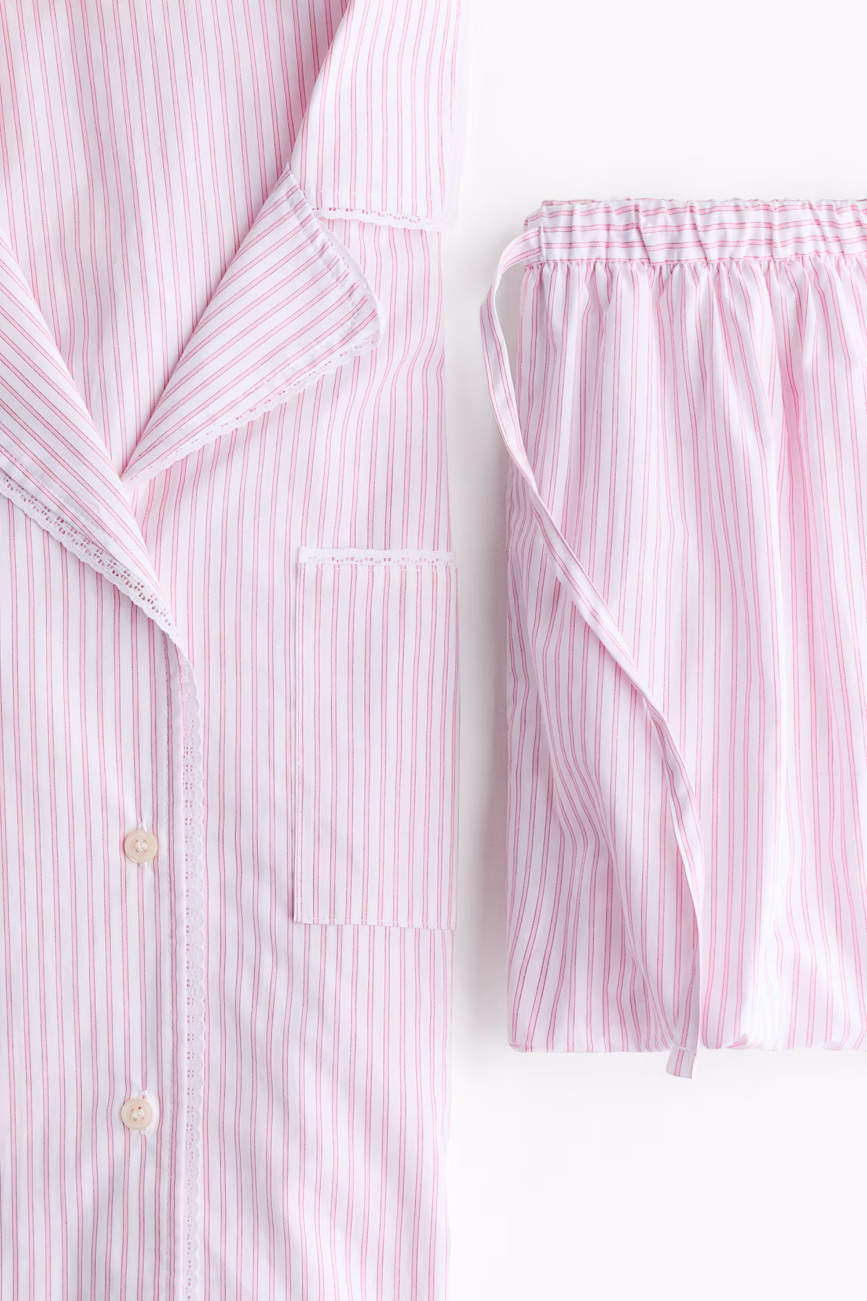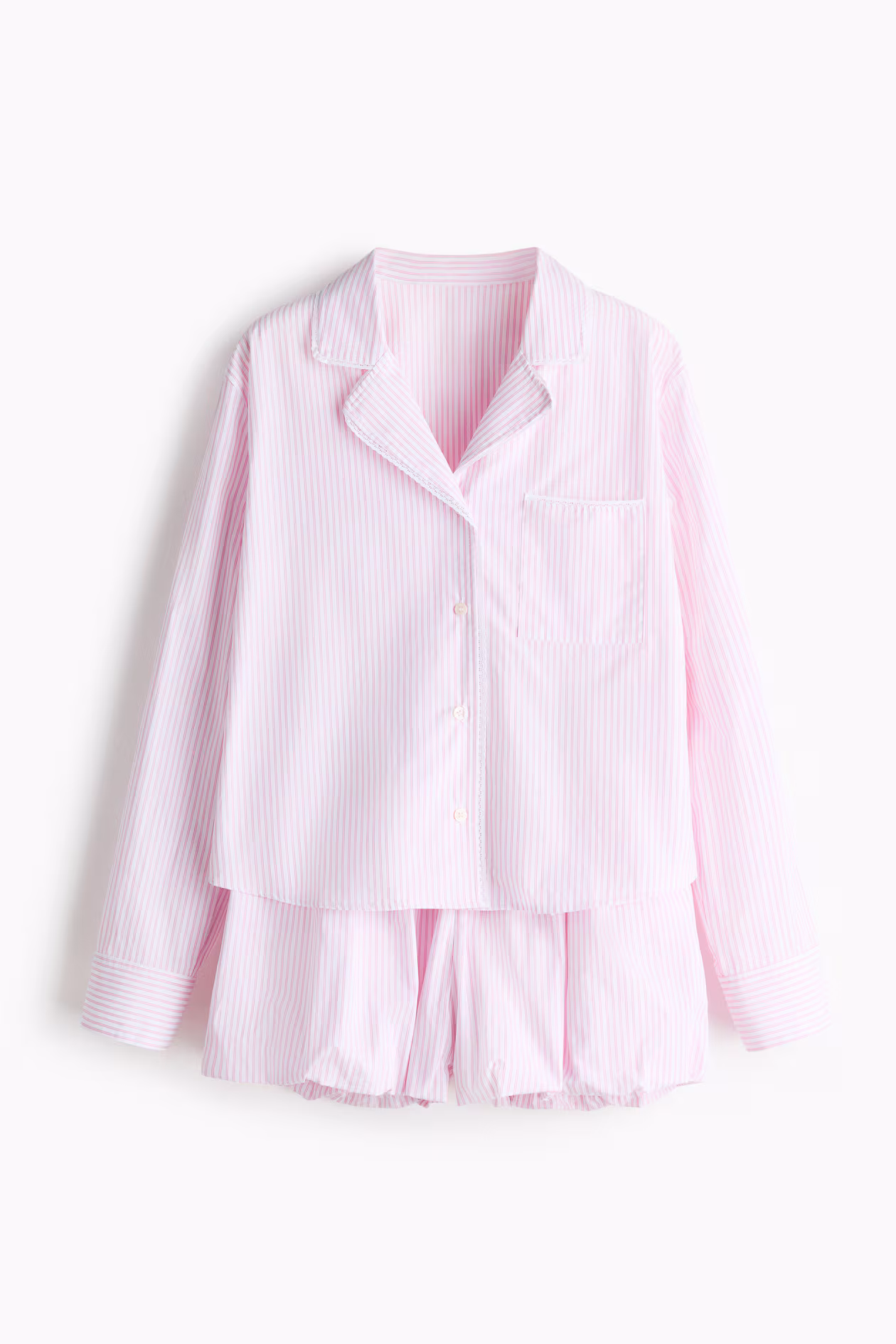 Pajamas in soft woven cotton with a shirt and shorts. Shirt with a collar, buttons at front, a patch chest pocket, scalloped lace trim extending from collar to front, gently dropped shoulders, and long sleeves with button at cuffs. Shorts with a drawstring at waistband and voluminous bubble hems.