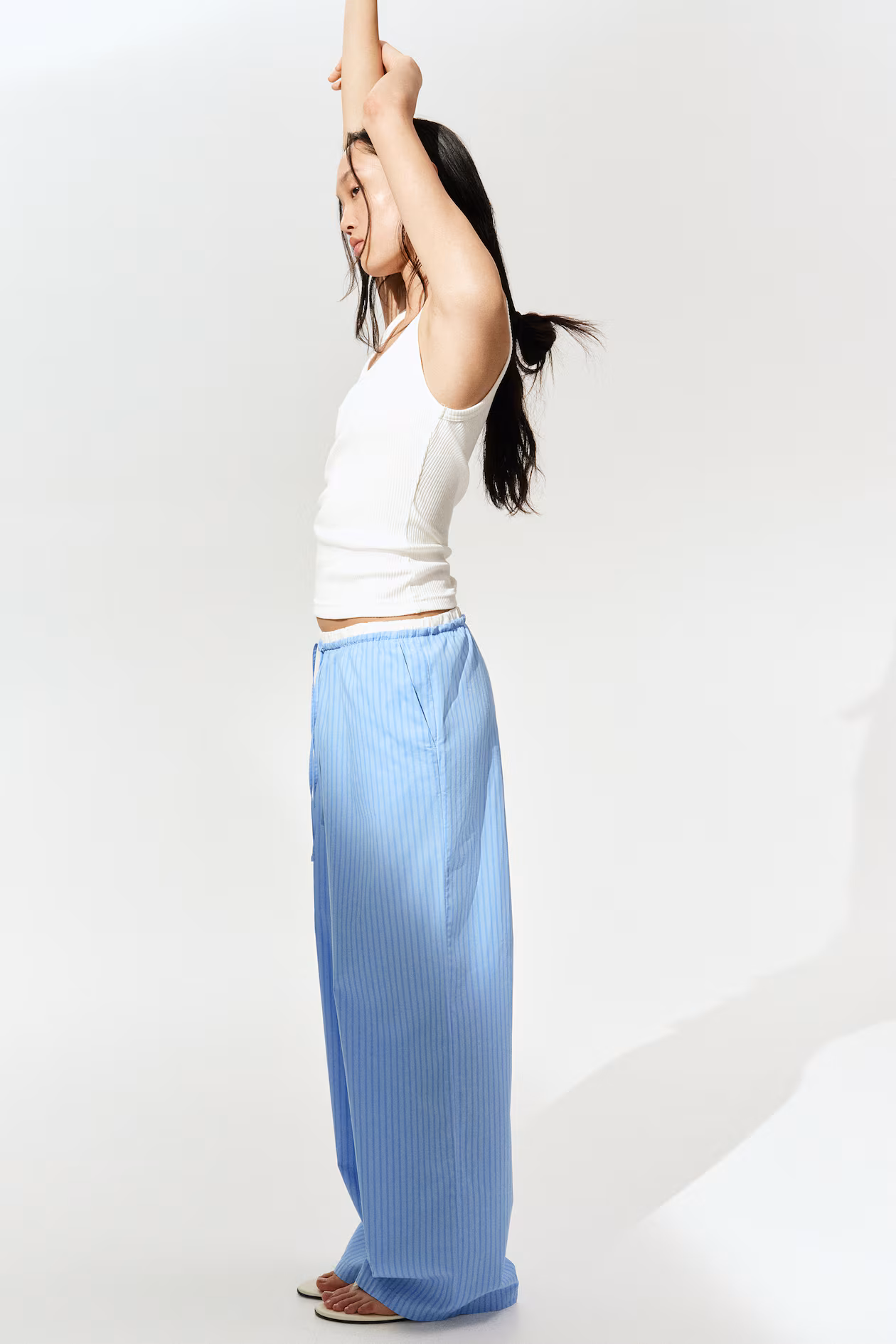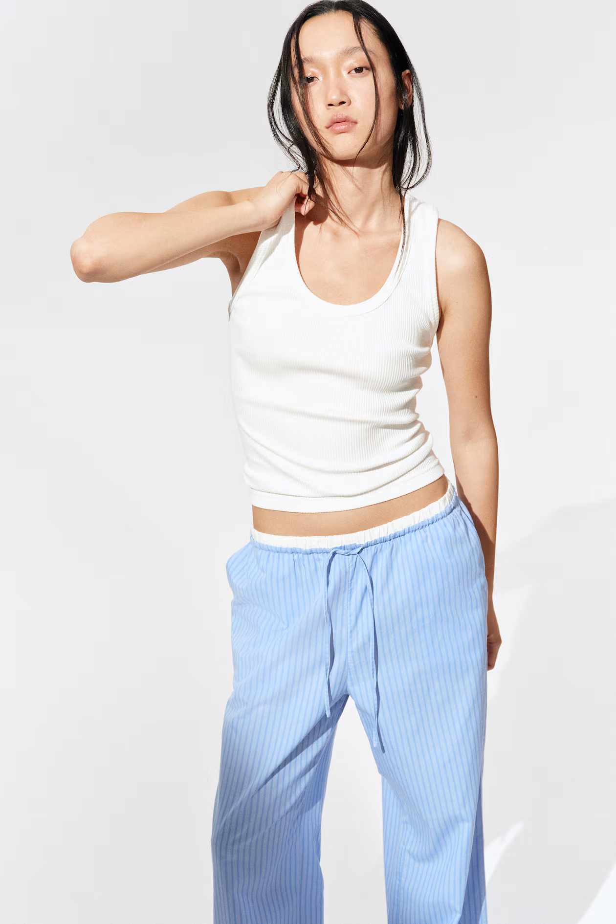 Pants in crisp cotton poplin. Elasticized, drawstring waistband and an extended, accent-colored waistband section with covered elastic. Diagonal side pockets and wide legs.