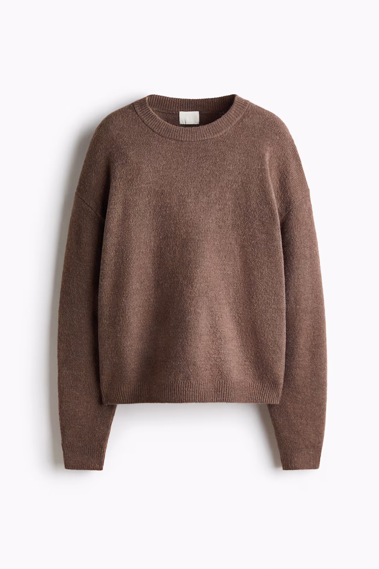 Soft, knit sweater with wool content. Round neckline, dropped shoulders, and long sleeves. Ribbing at neckline, cuffs, and hem.