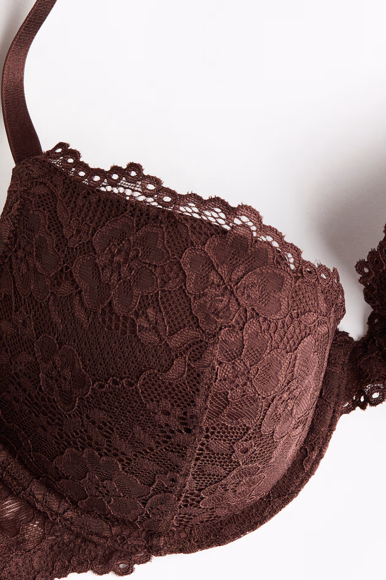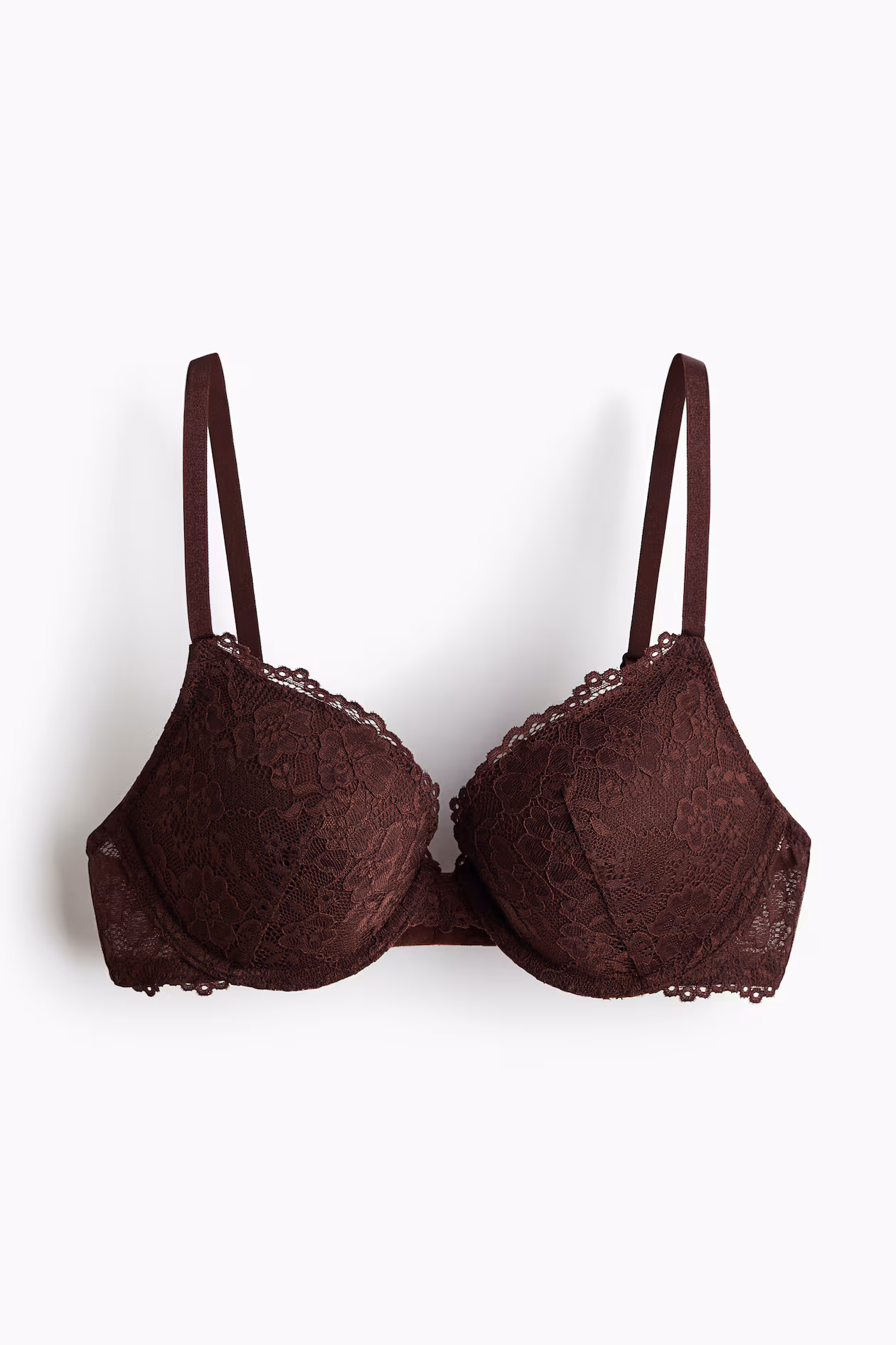 Push-up bra in lace. Adjustable shoulder straps, padded, underwire cups to maximize bust and cleavage, and hook-and-eye fasteners at back.