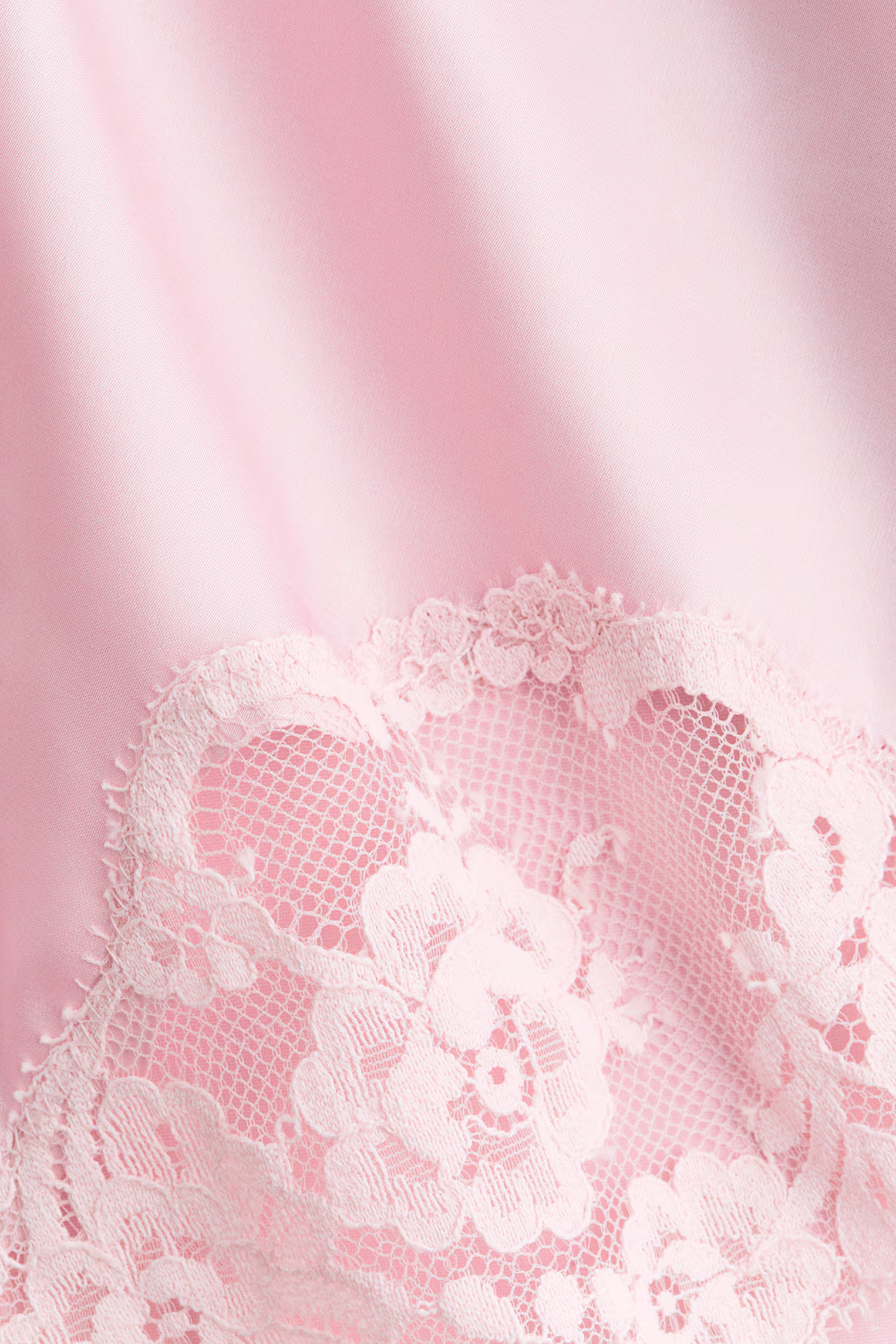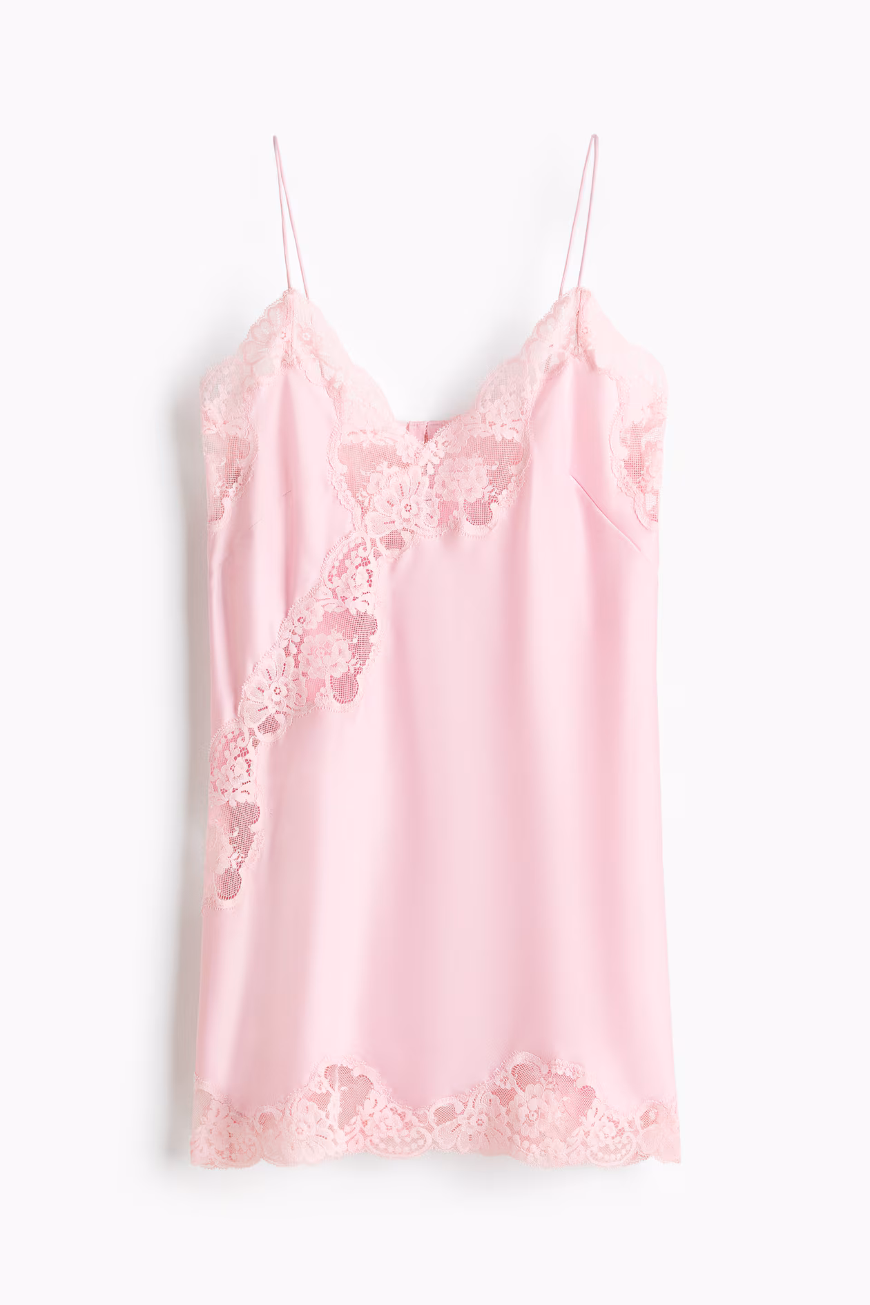 Short, fitted nightgown in softly draped satin with lace trim and insets. Extra-narrow shoulder straps, V-neck at front, and an opening at back with covered buttons.