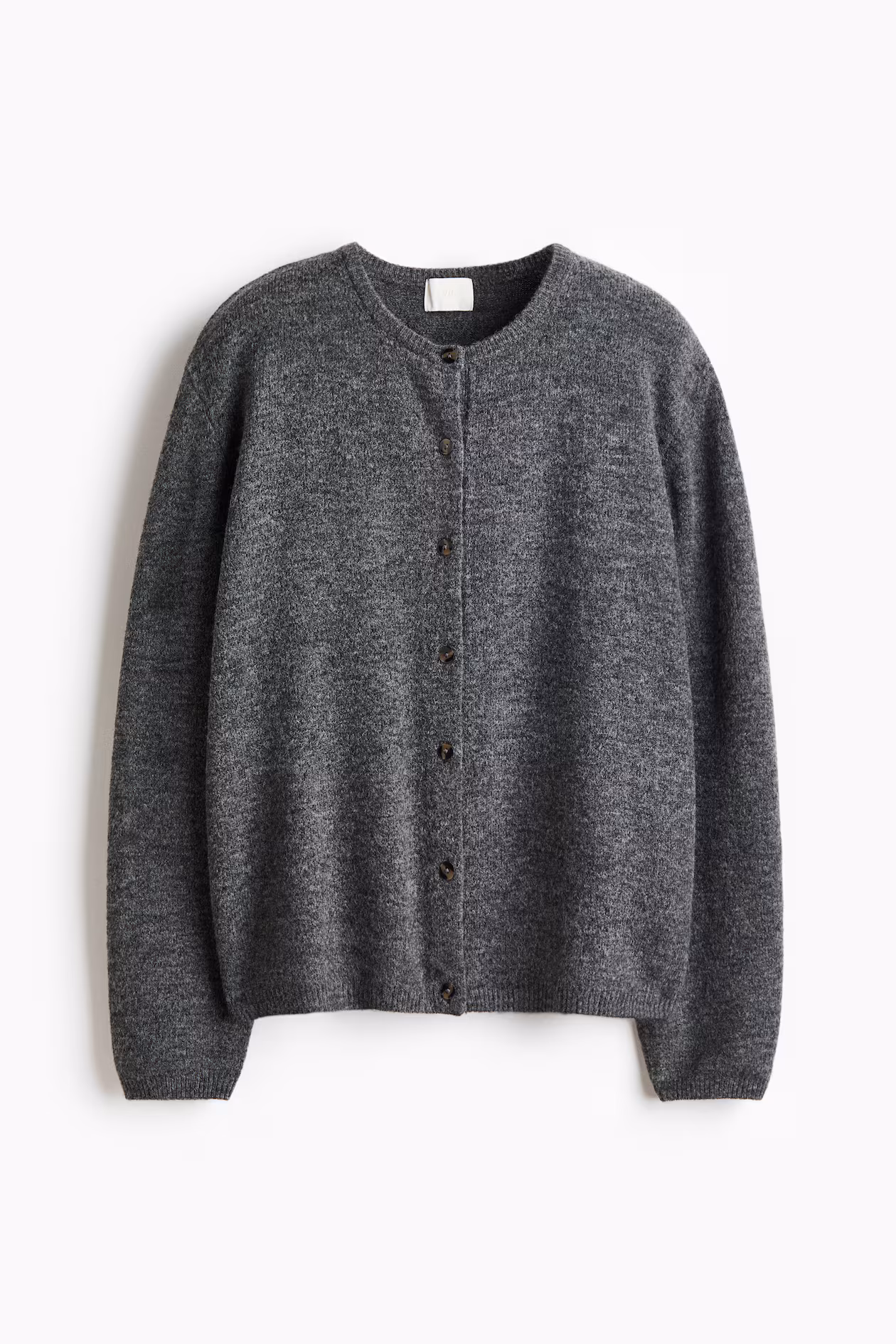 Loose-fit cardigan in a soft knit with wool content. Round neckline, buttons at front, gently dropped shoulders, and long sleeves. Narrow ribbing at neckline, cuffs, and hem.