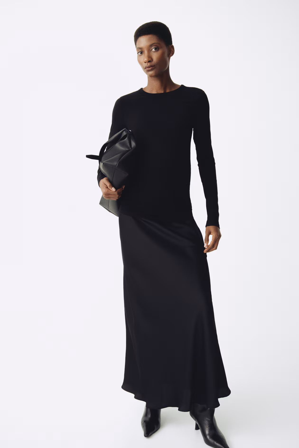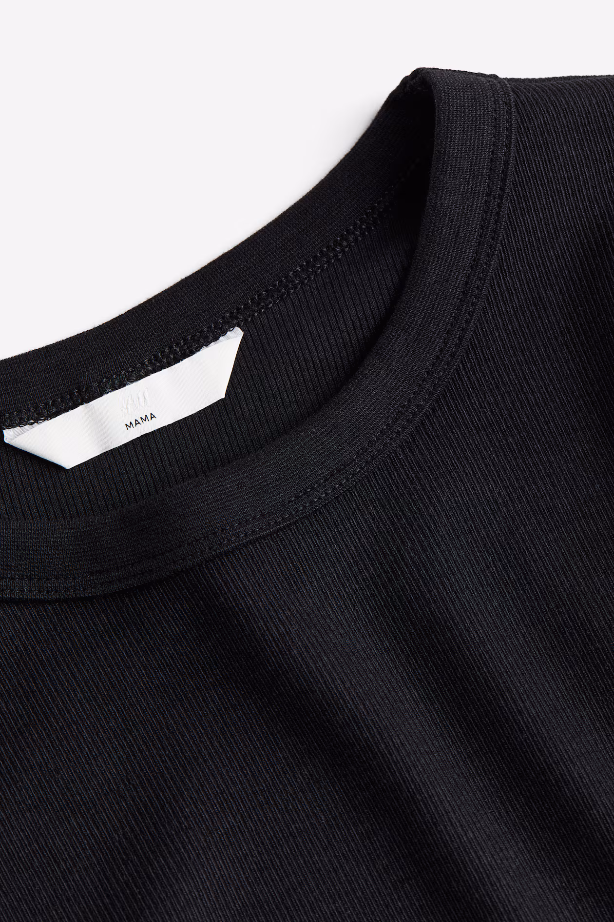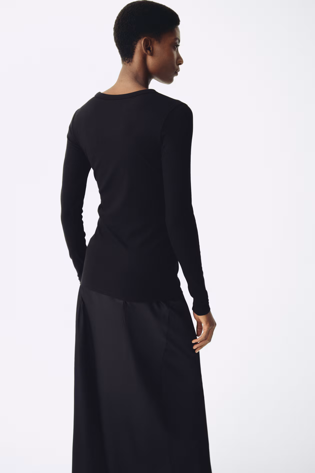 Fitted top in ribbed jersey made from a cotton and viscose blend. Round neckline and long sleeves.