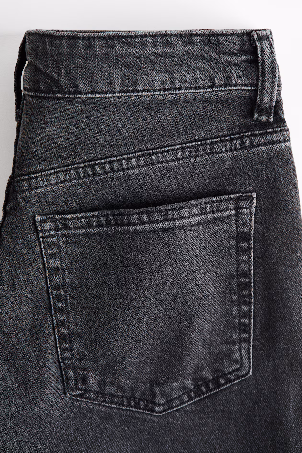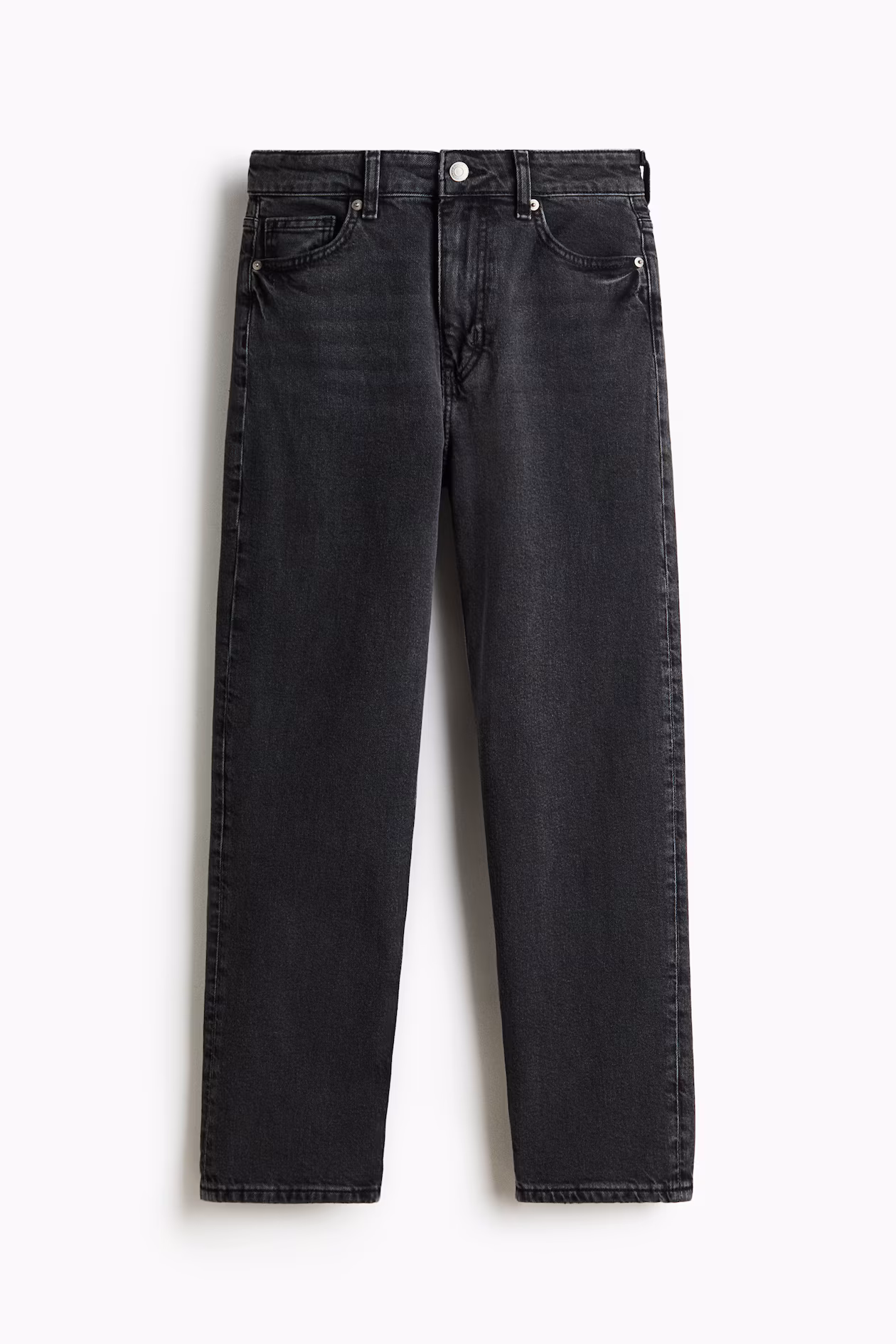 5-pocket jeans in denim with gentle stretch for good comfort. Slim fit from hip to thigh. High waist, zip fly with button, and ankle-length straight legs, tapered at hem.