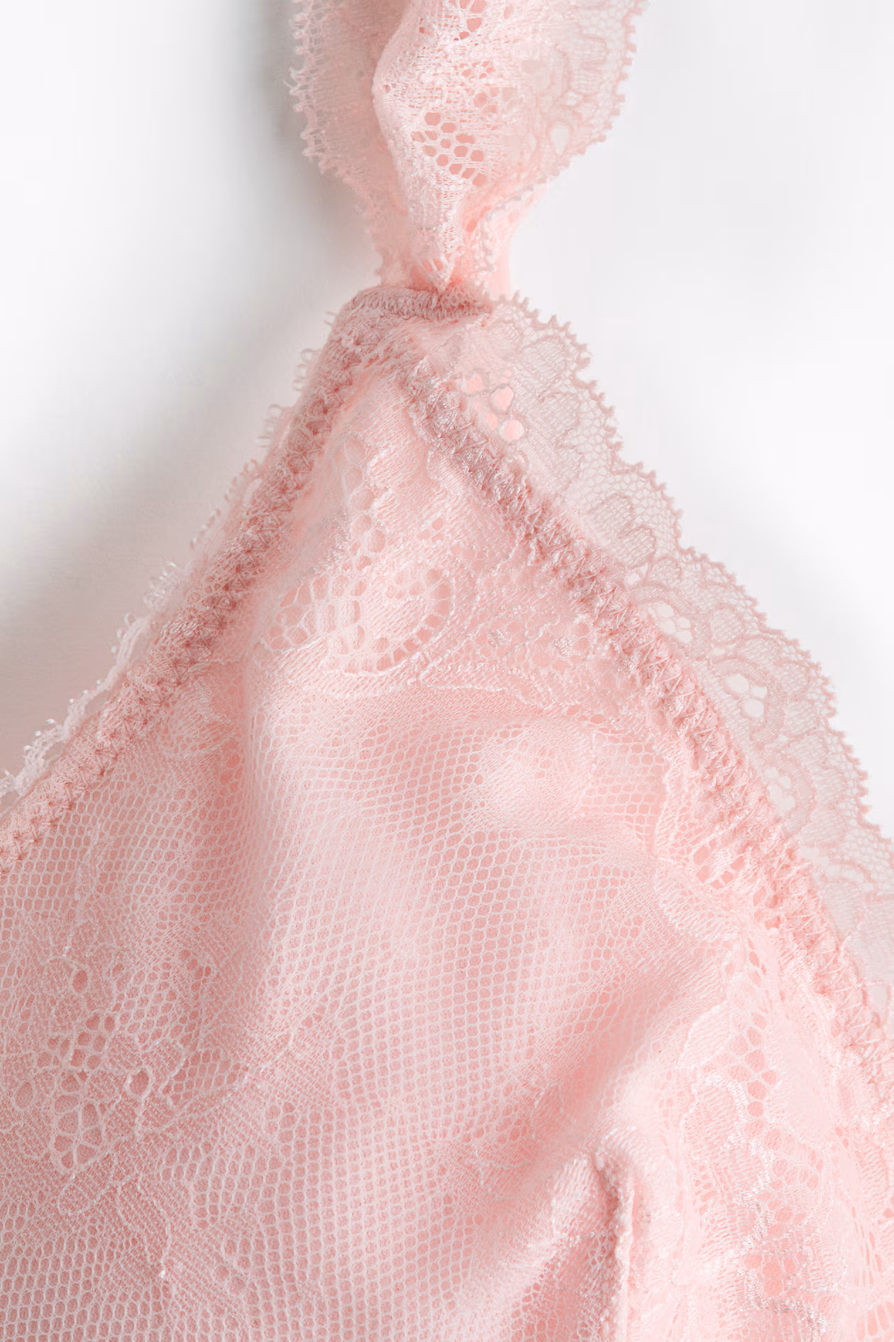 Soft-cup bra in lace. Adjustable shoulder straps, lined cups with removable inserts for shaping and good support, and a small bow at front. Hook-and-eye fastening at back.
