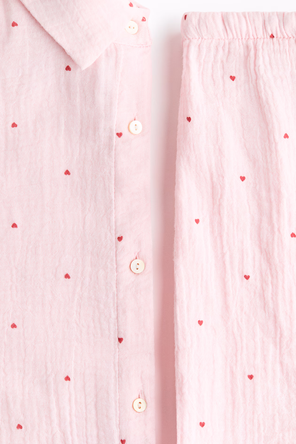 Pajama shirt and shorts in soft cotton muslin. Long-sleeved shirt with a collar, buttons at front, and a patch chest pocket. Shorts with elasticized, drawstring waistband.