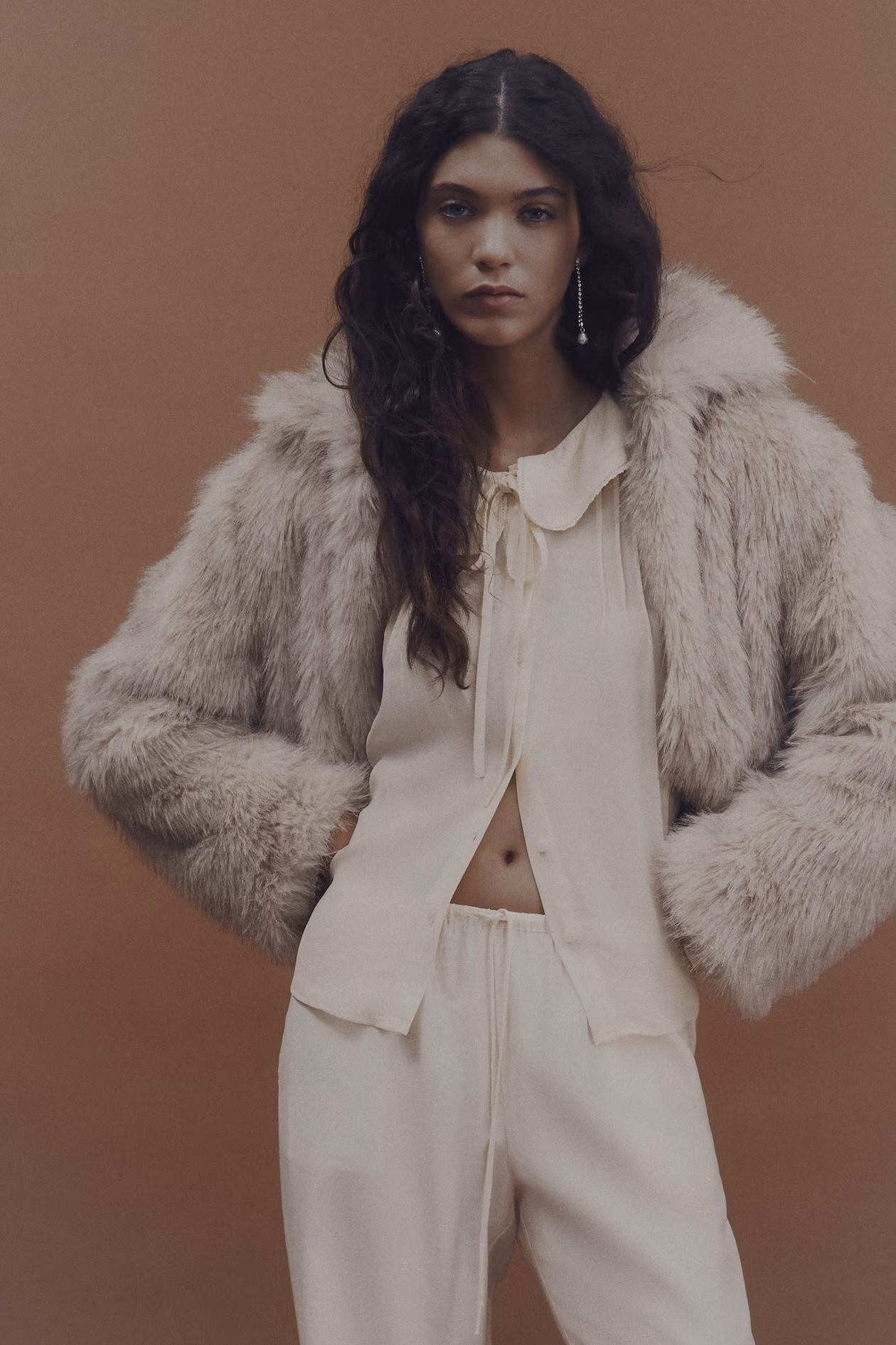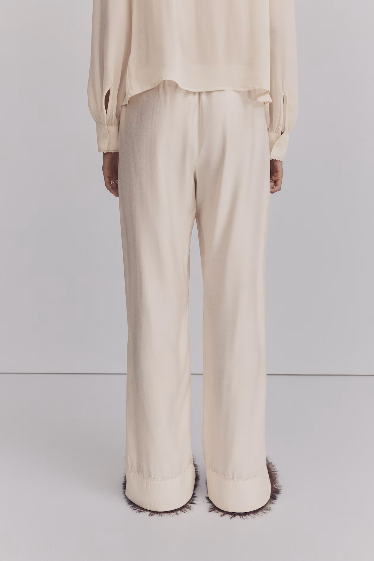 Loose-fit pants in woven fabric. Elasticized, drawstring waistband, discreet side pockets, and straight legs with lace-trimmed sewn foldover cuffs.