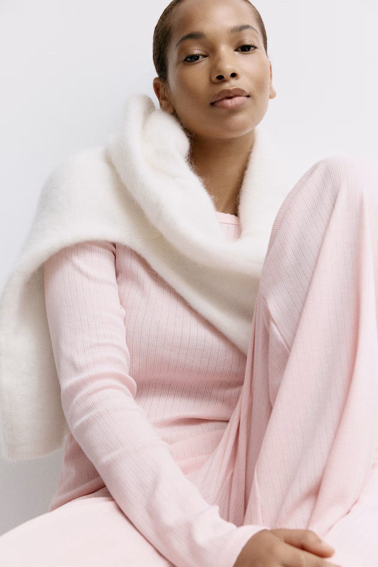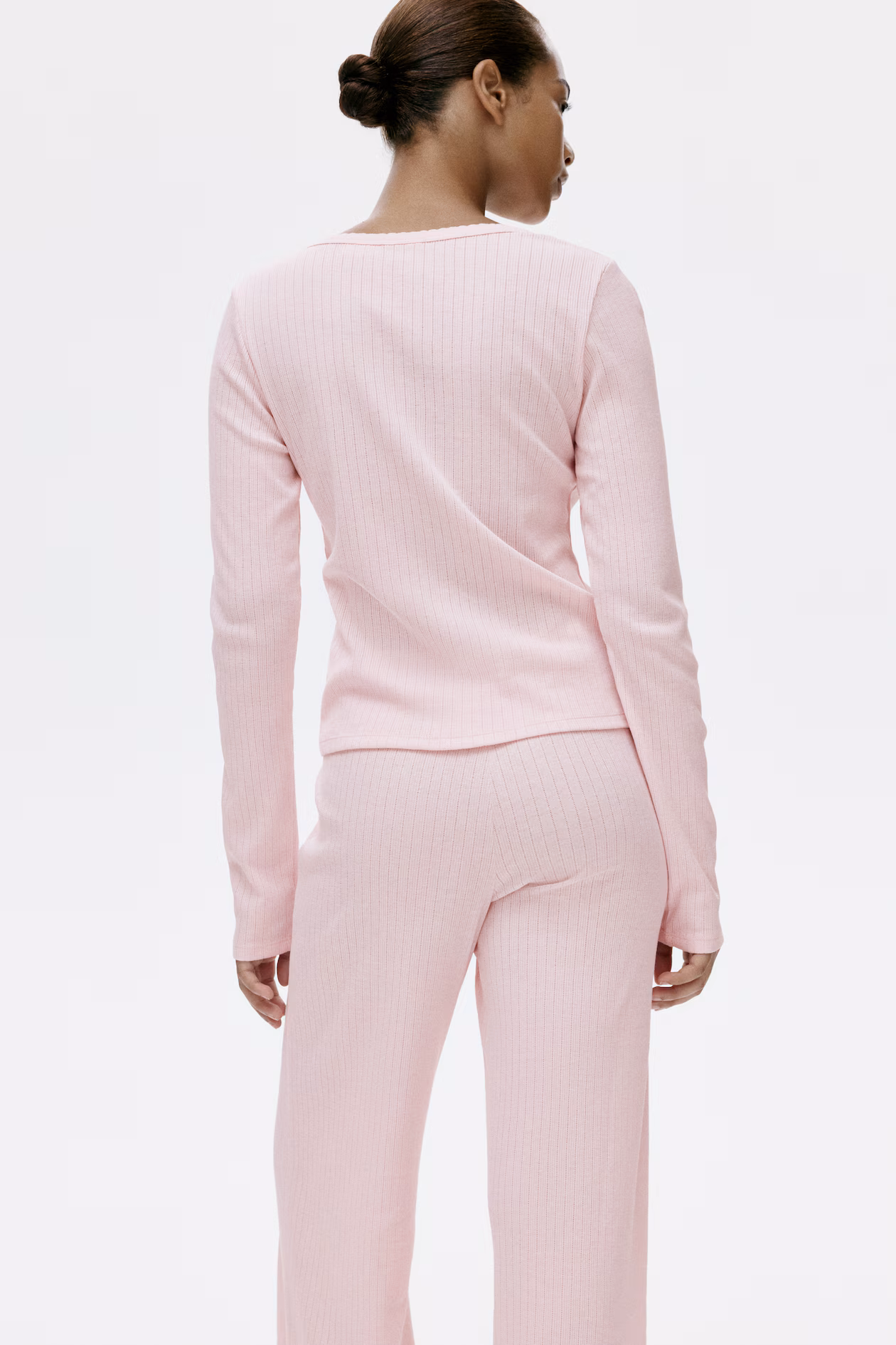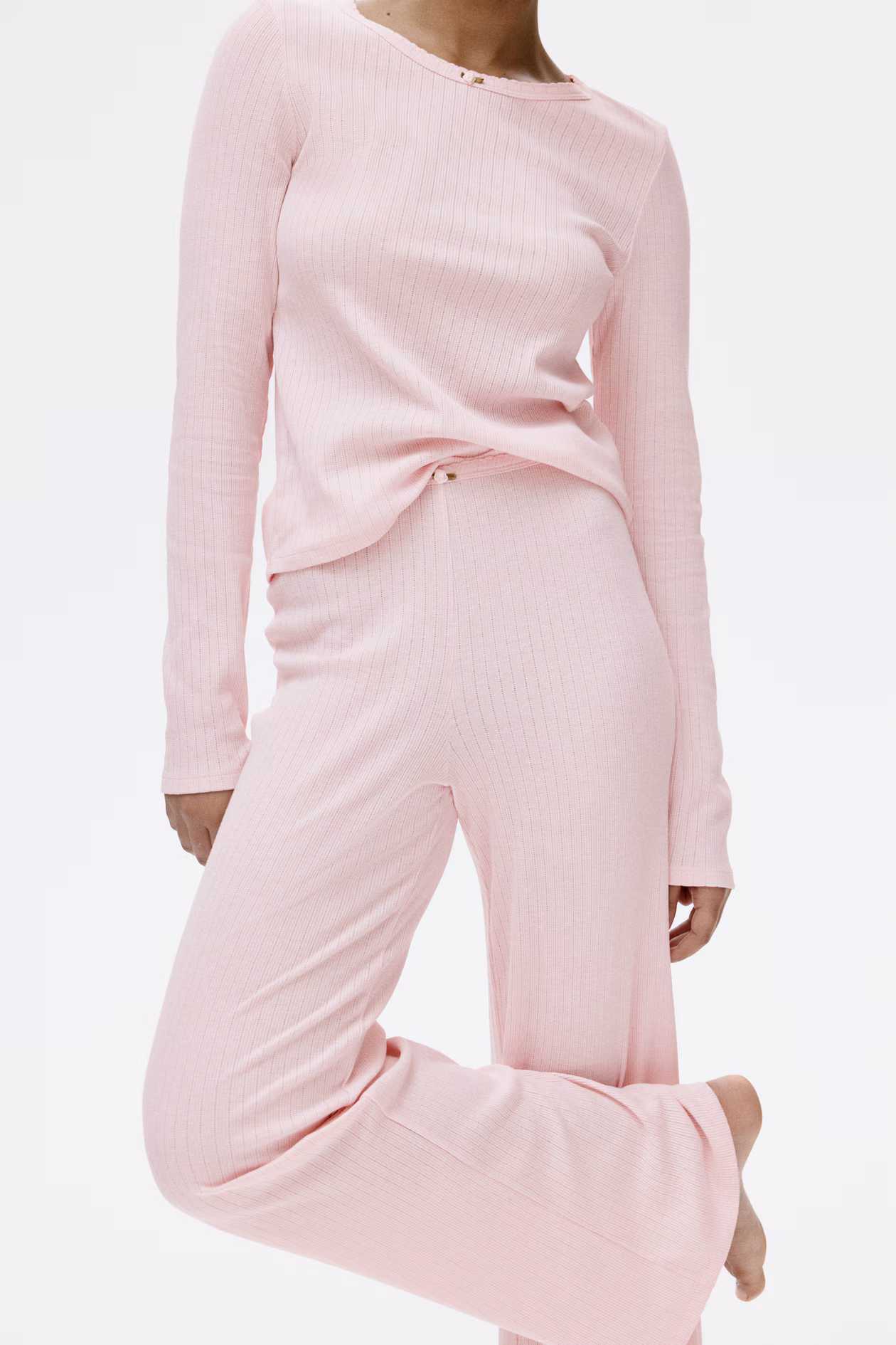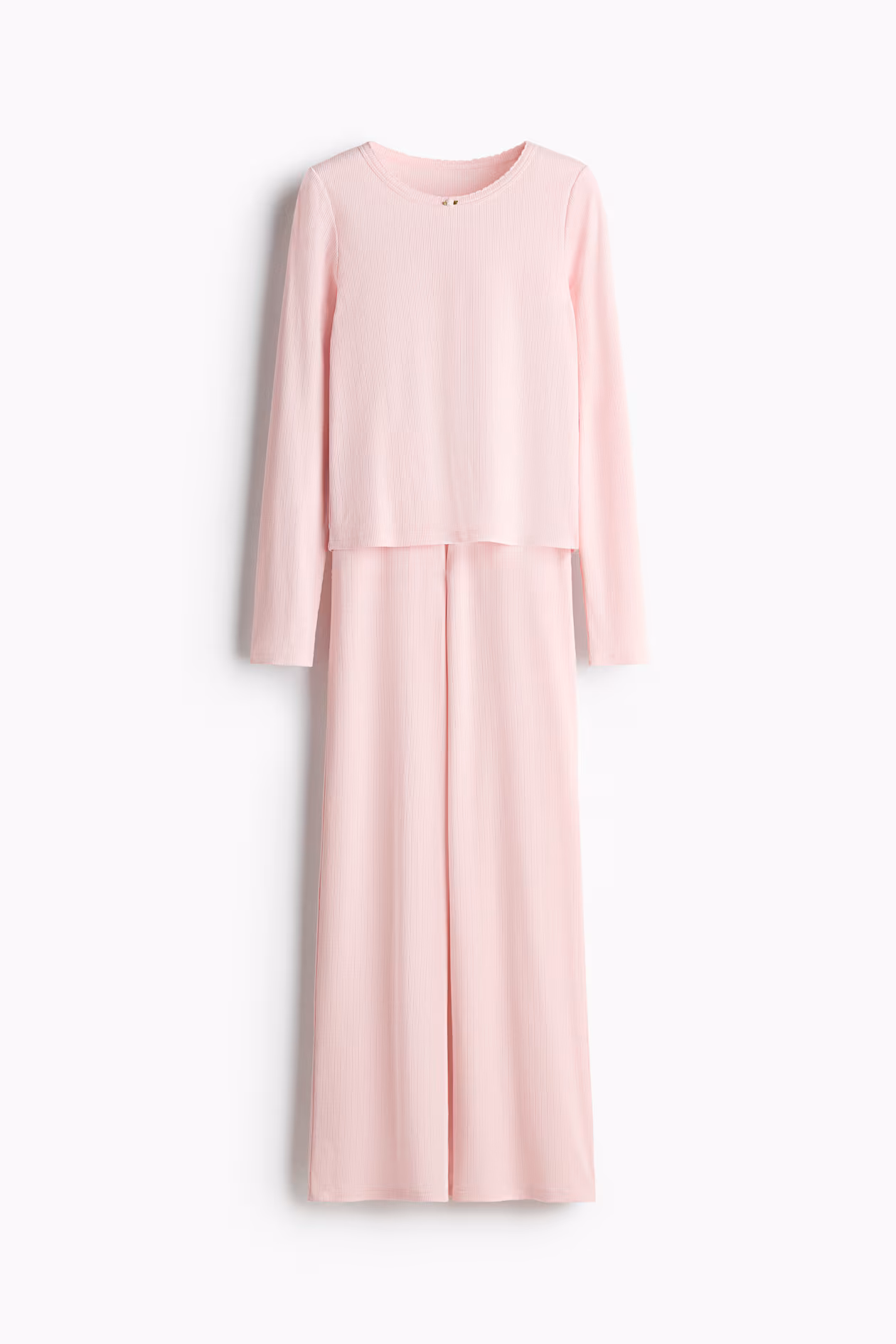Pajamas in ribbed jersey with a top and pants, both with a small rose appliqué at front. Long-sleeved top with a round neckline and pants with an elasticized waistband.