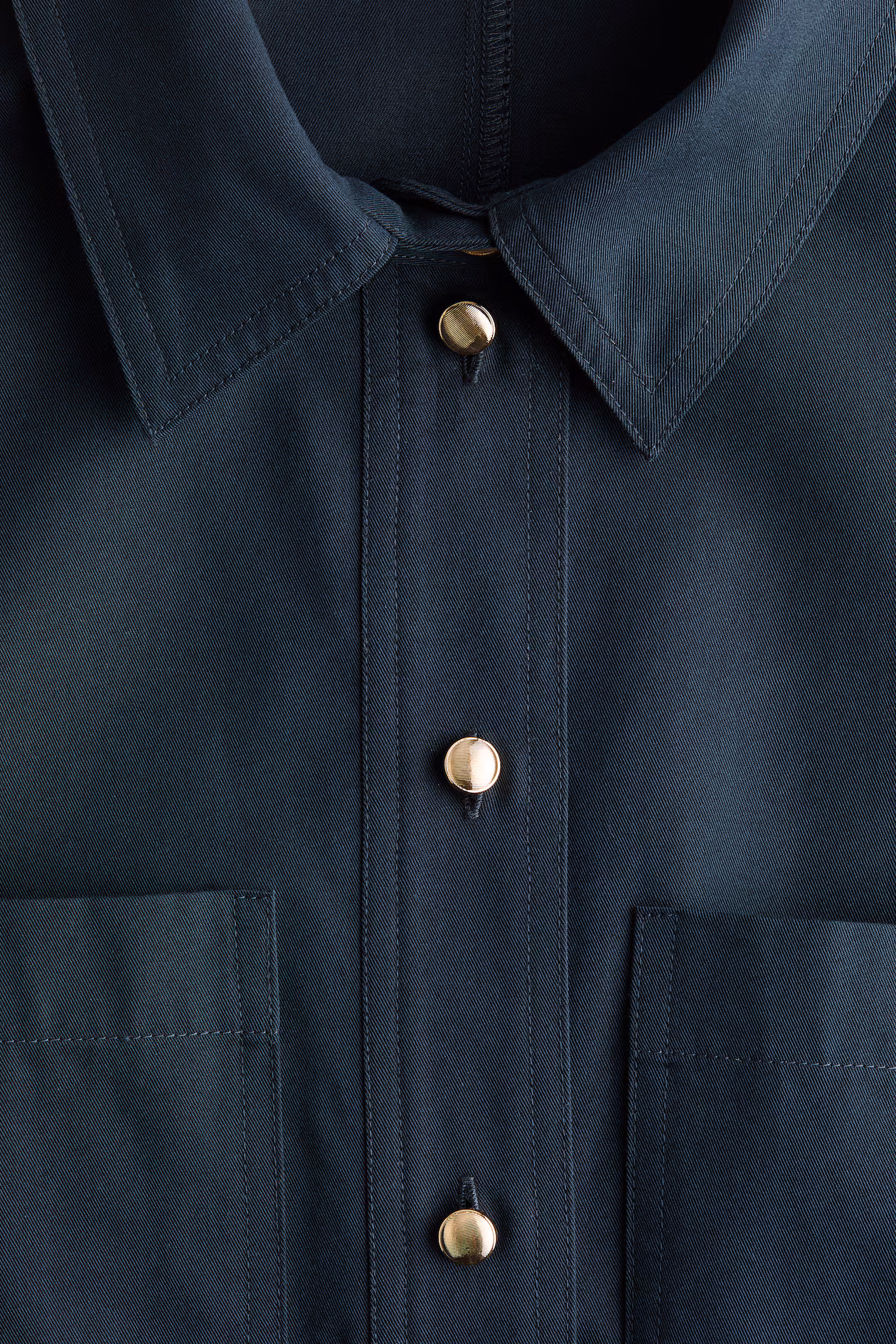 Calf-length dress in twill made from a cotton and lyocell blend. Collar, buttons at front, and patch chest pockets. Short sleeves, tie belt at waist, and a gently flared skirt. Unlined.