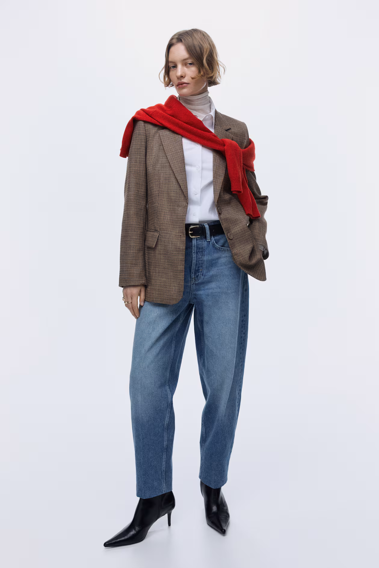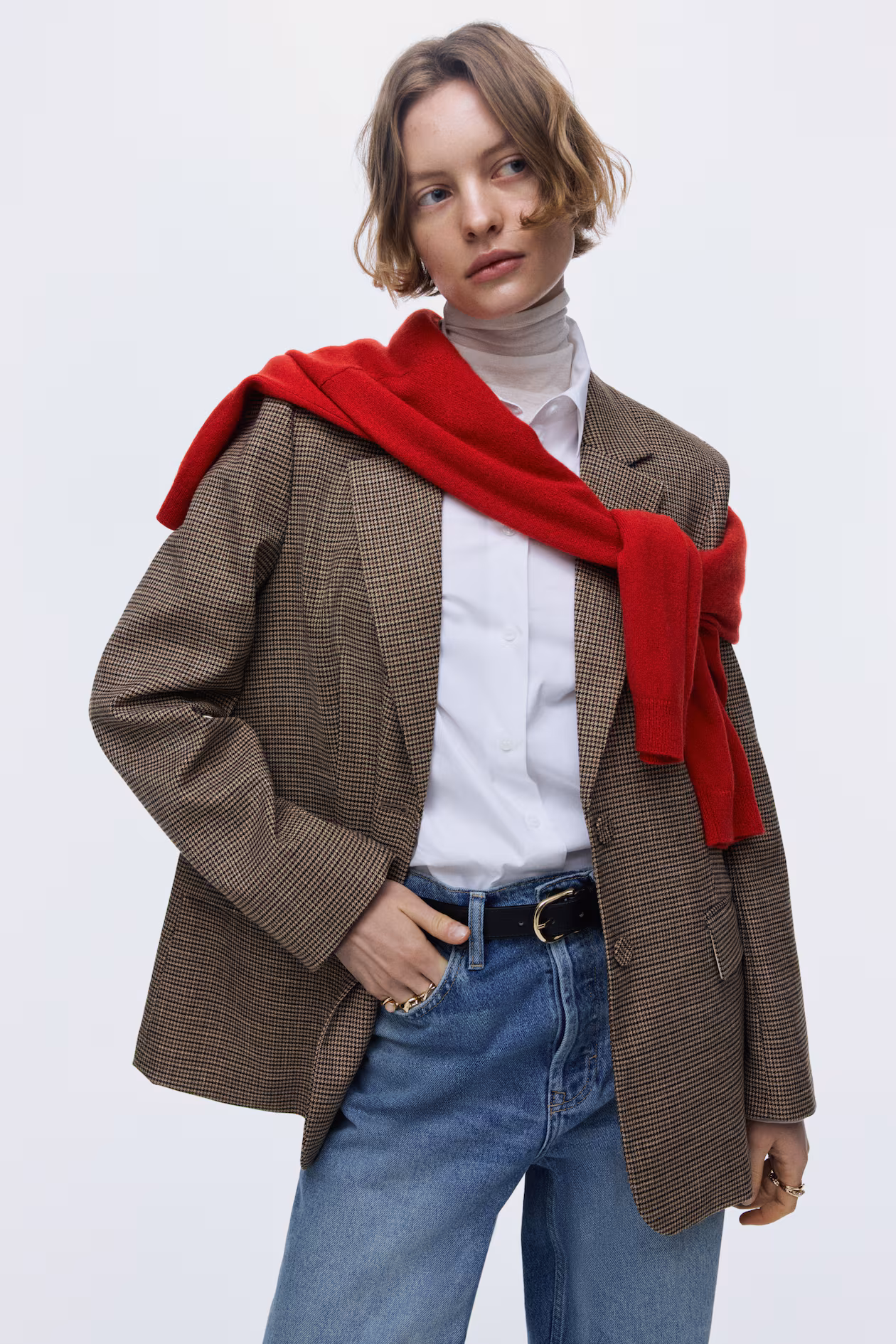 Single-breasted blazer in woven fabric. Notched lapels, covered buttons at front, shoulder pads, and welt front pockets with flap. Vent at back. Lined.
