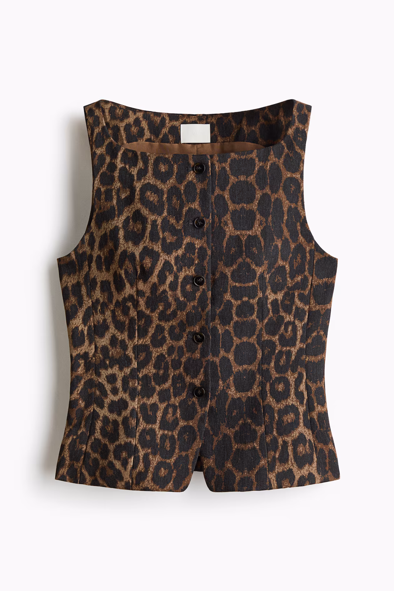Fitted vest in woven fabric. Wide shoulder straps, square neckline, and buttons at front. Shaping seams at front and back for a tailored look. Lined.