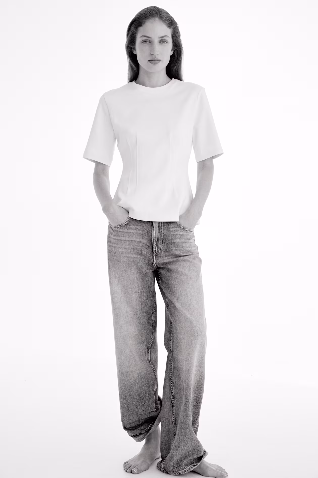Long T-shirt in thick interlock jersey. Shaping darts at front of waist for a tapered silhouette. Round neckline.