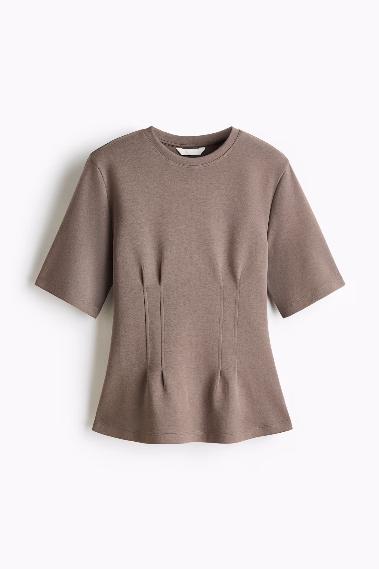 Long T-shirt in thick interlock jersey. Shaping darts at front of waist for a tapered silhouette. Round neckline.