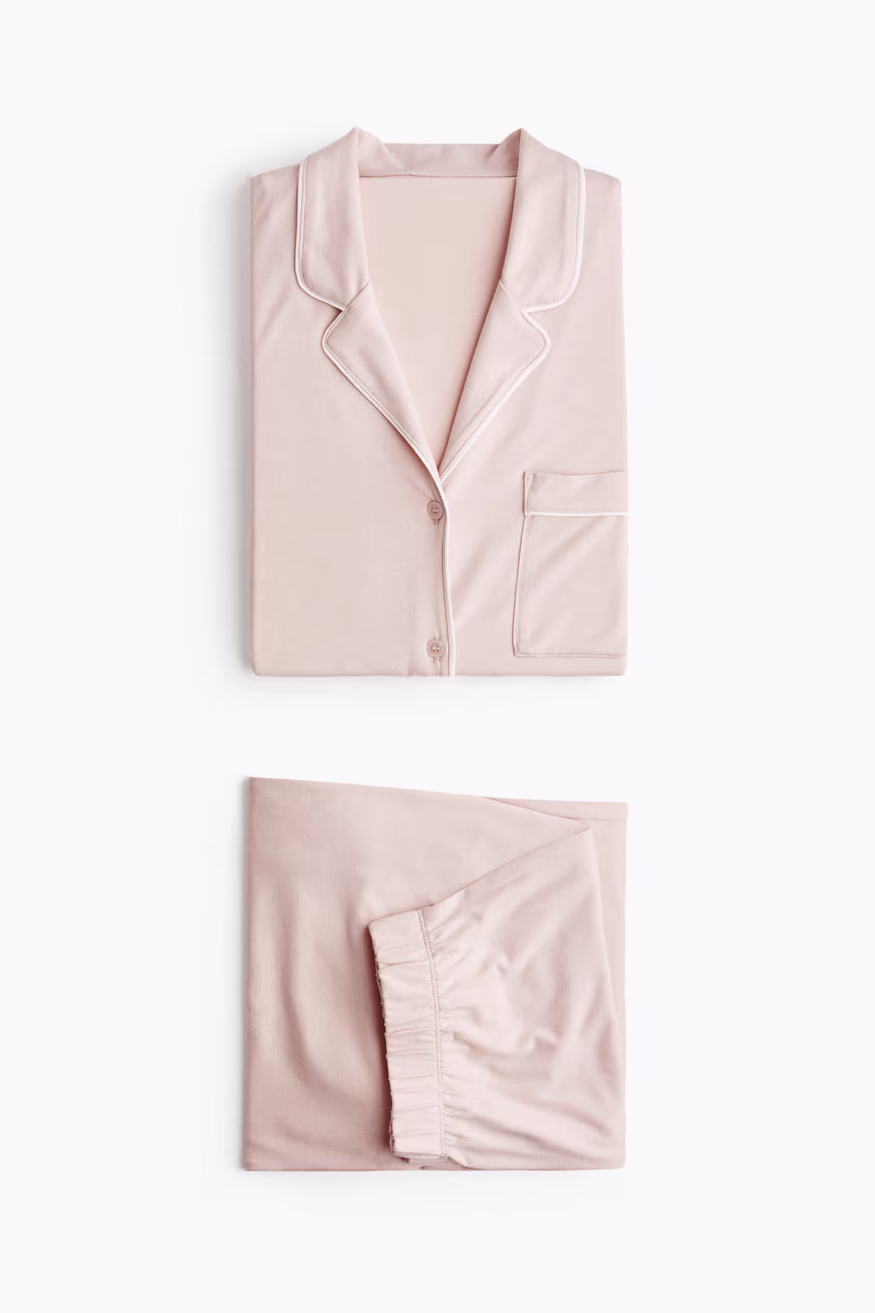 Pajamas in soft, viscose-blend jersey with a shirt and pants. Shirt with notched lapels, buttons at front, and long sleeves. Pants with covered elastic at waistband and straight, wide legs.