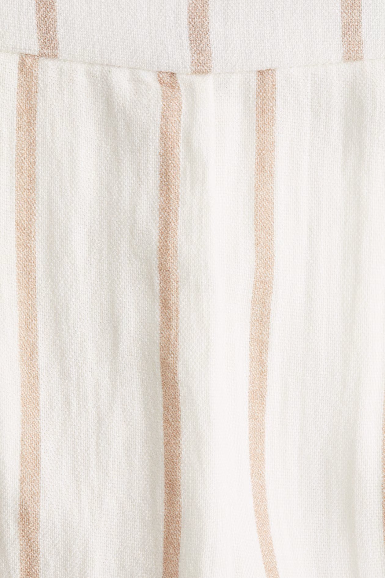 Pants in twill with creases at front and back. High waist, concealed zipper at one side with hook-and-eye fastener, and discreet side pockets. Wide legs.