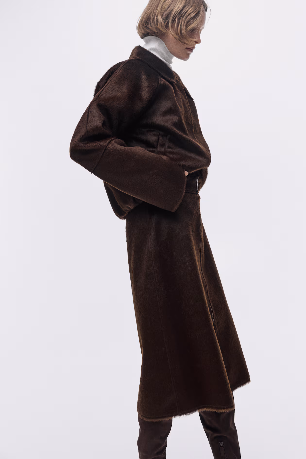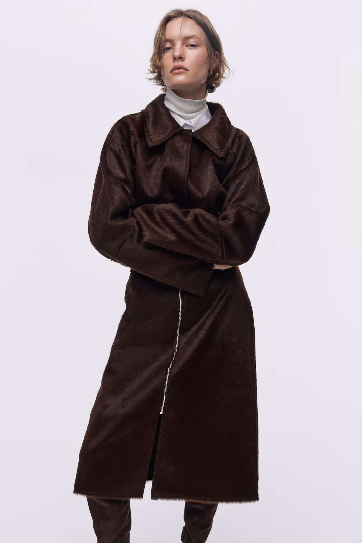 Calf-length skirt with a textured, napped finish. Regular waist, zipper full length of front, and a slit at front of hem. Lined.