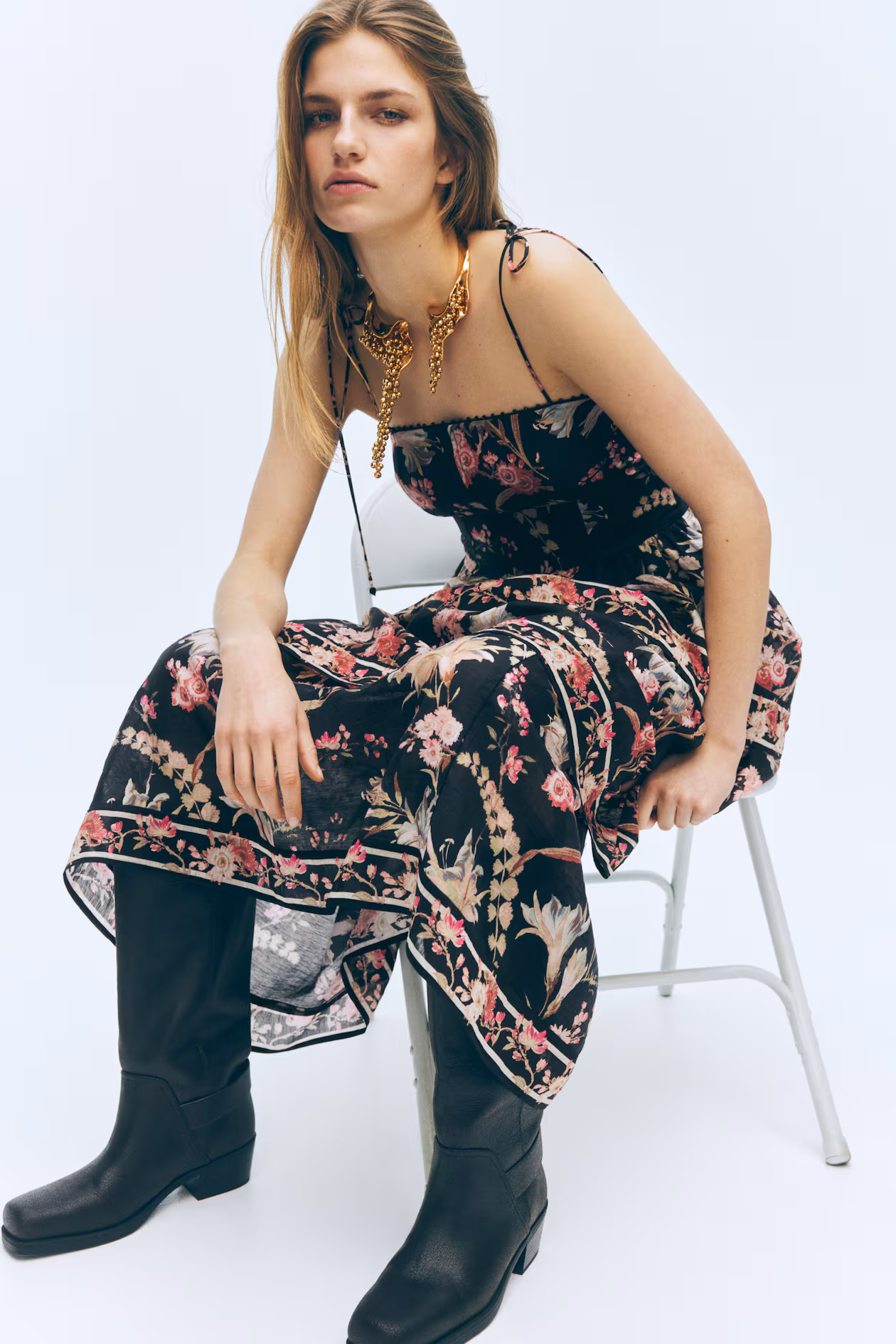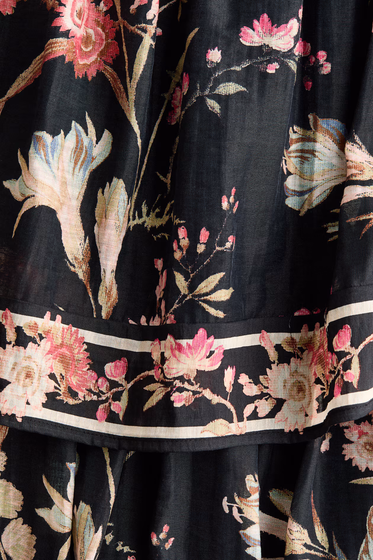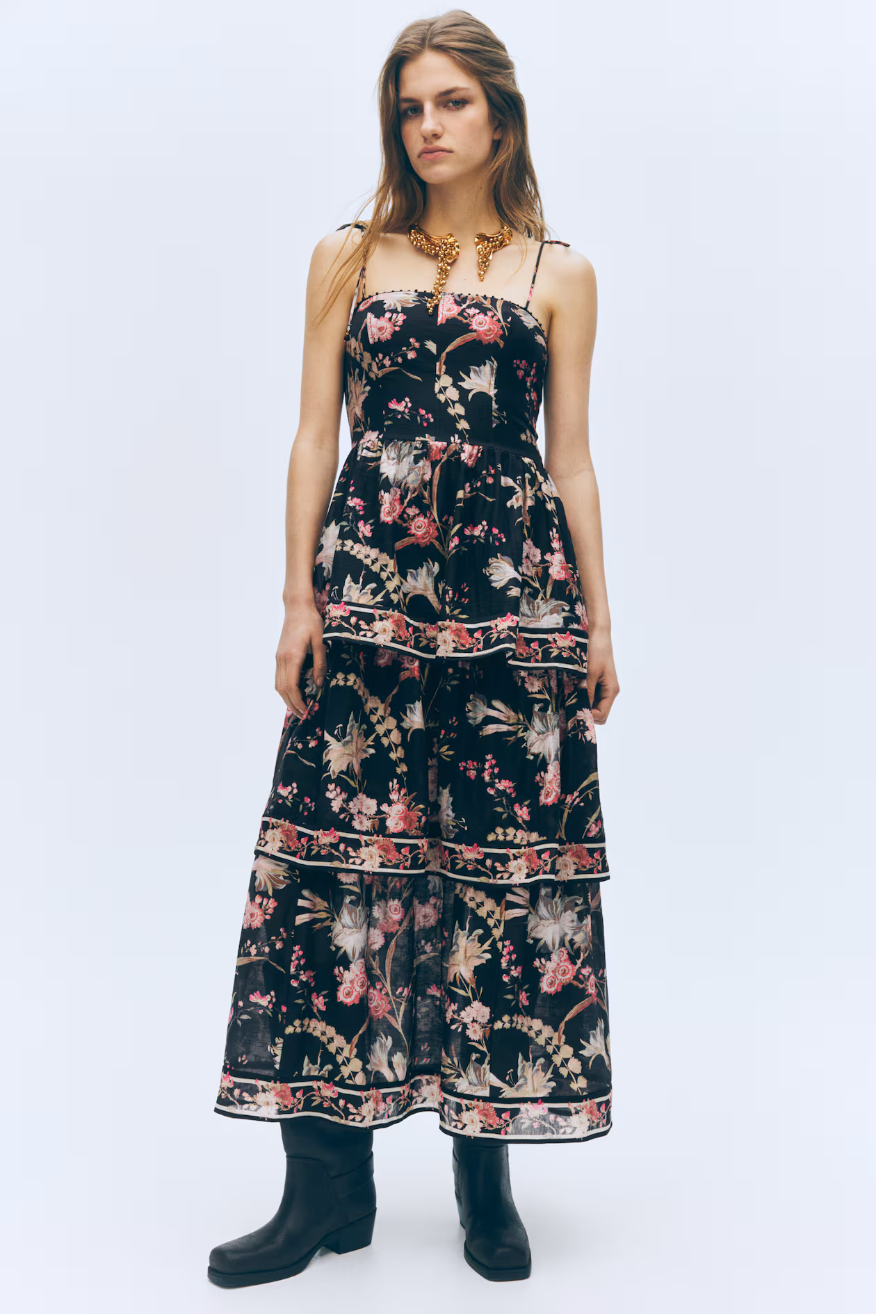 Long dress in a woven linen blend with a printed pattern. Fitted bodice and a flared skirt with gathered tiers for added volume. Extra-narrow, tie-top shoulder straps with beaded ends, a bead-trimmed straight neckline, and a concealed zipper at back. Lined.