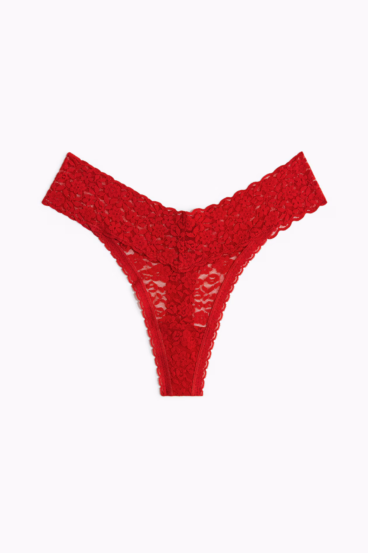 Thong briefs in lace with a low, V-cut waist. Lined gusset.
