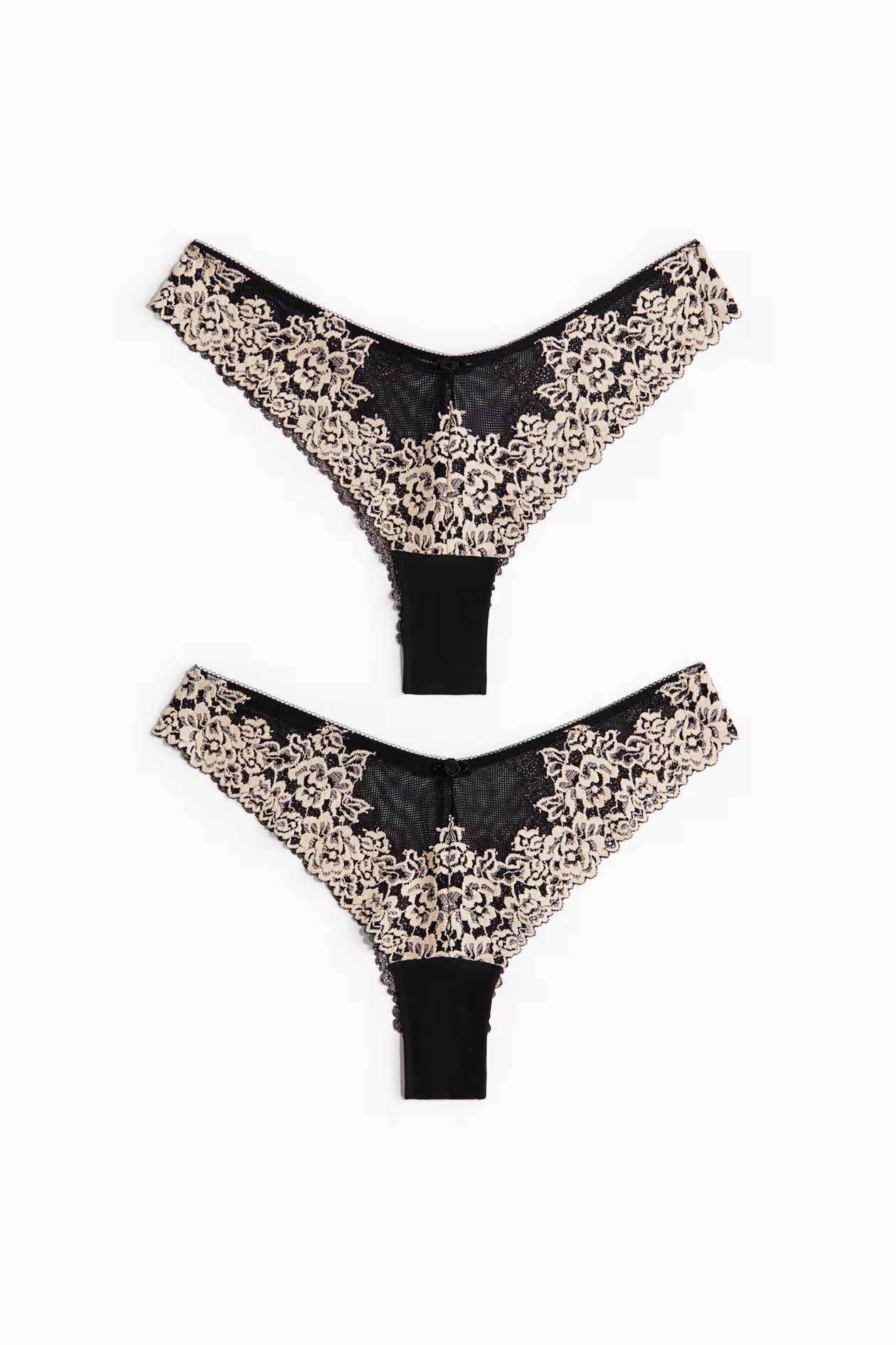 Briefs in lace and mesh. Low, V-cut waist, high-cut back, and lined gusset.