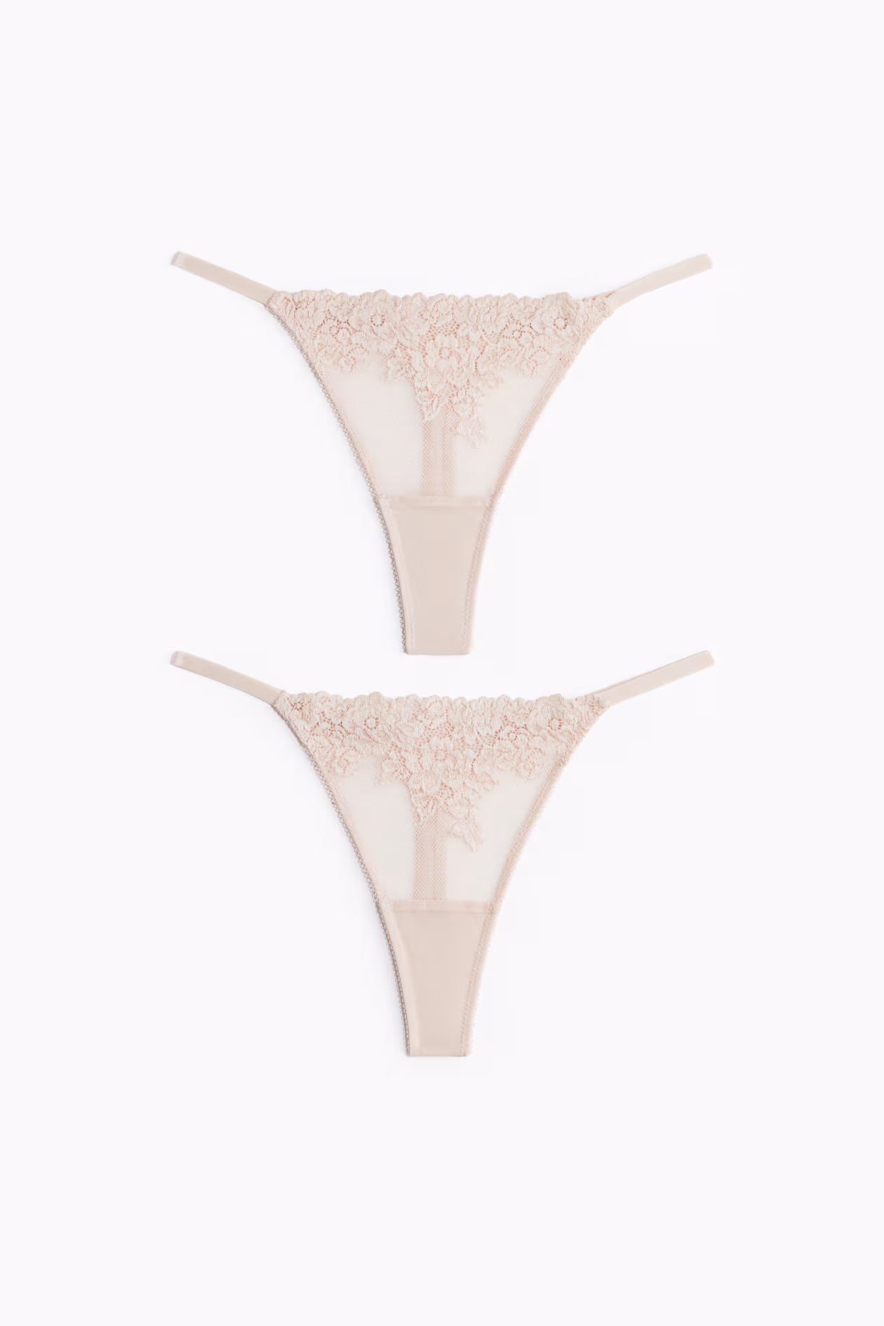 Thong briefs in mesh with lace trim. Low waist, narrow sides, and lined gusset.