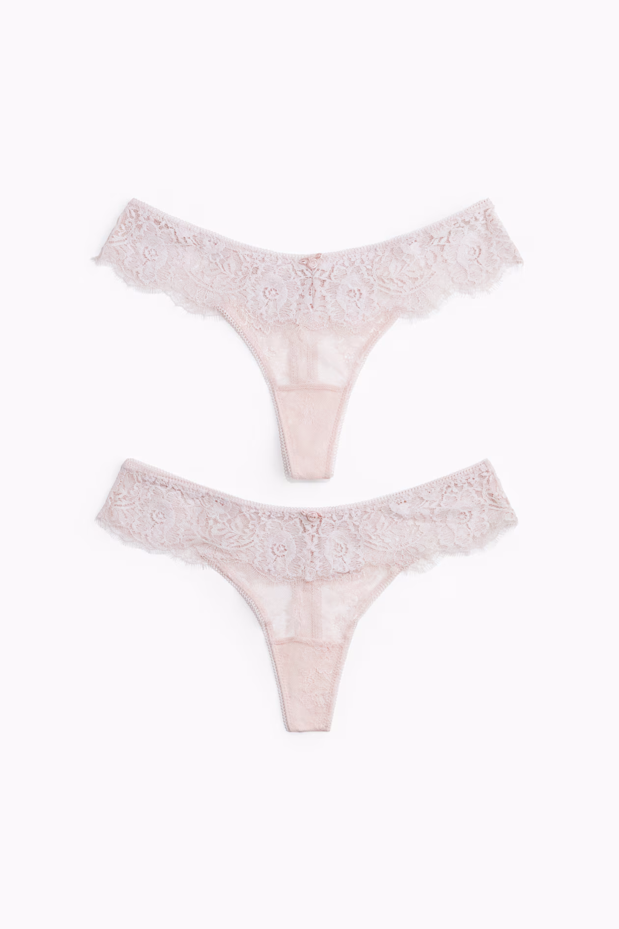 Thong briefs in lace with a low, V-cut waist. Lined gusset.