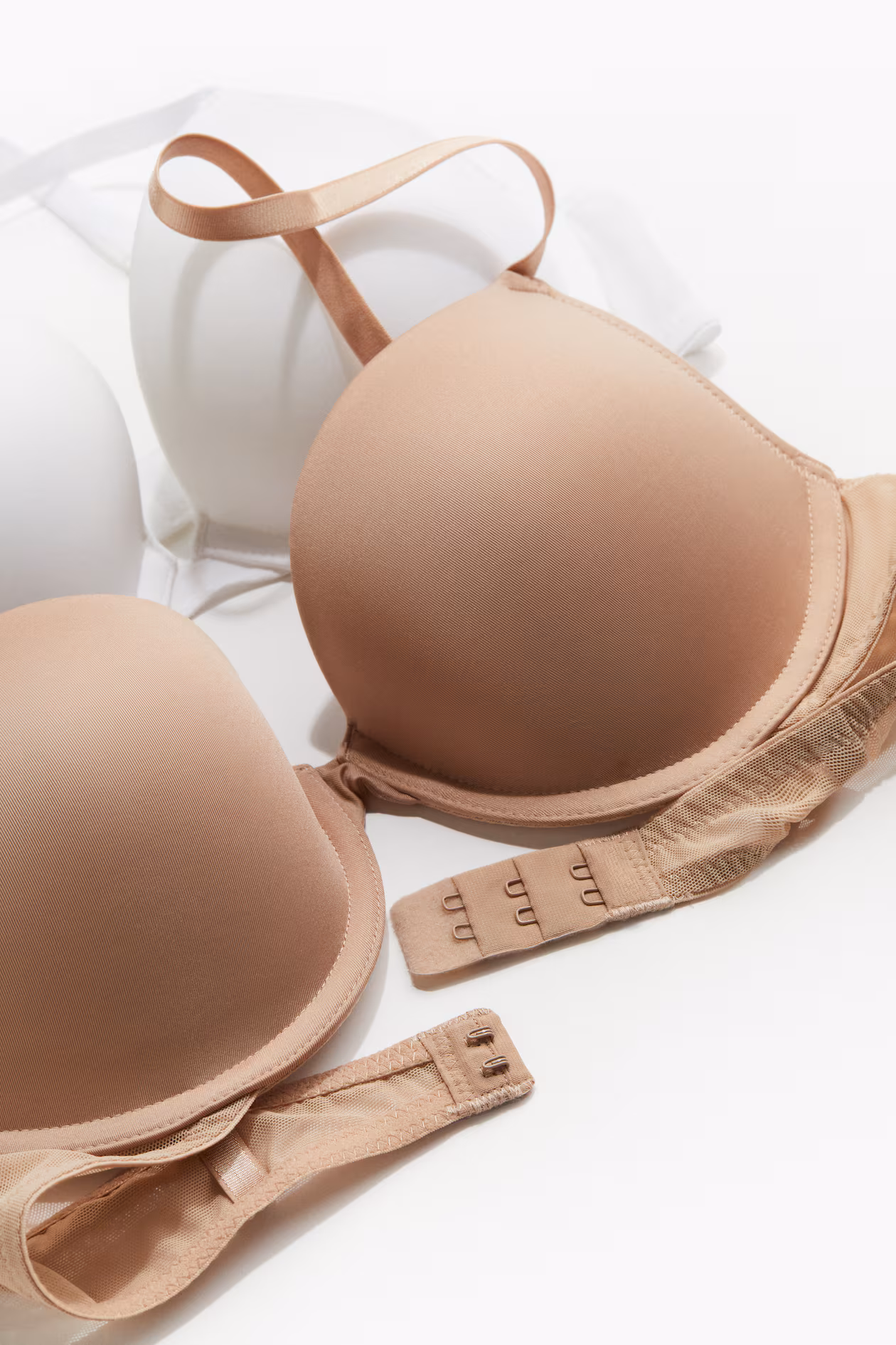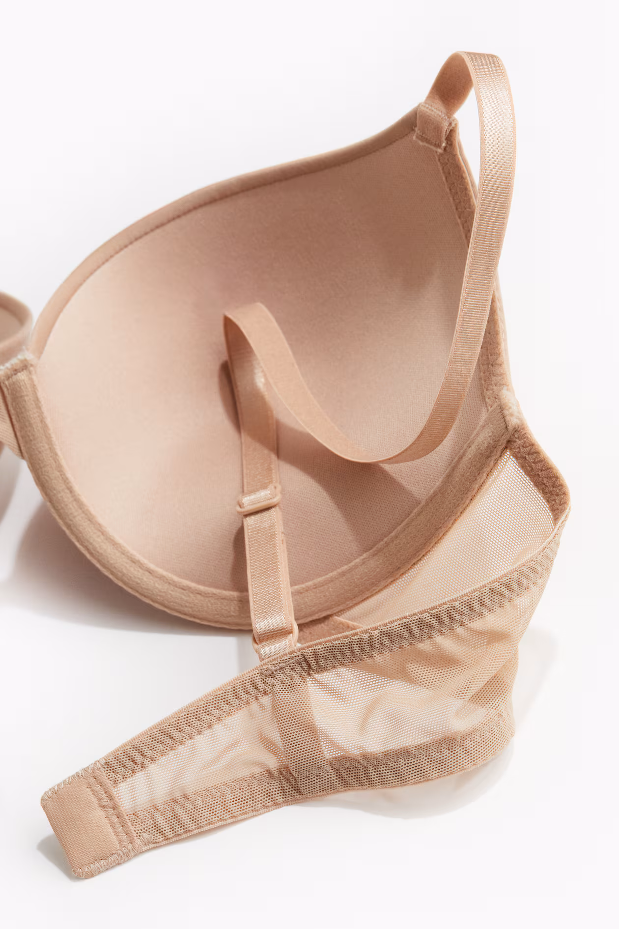 Push-up bras in microfiber with mesh details. Padded, underwire cups to maximize bust and cleavage. Adjustable shoulder straps. Hook-and-eye fastening at back.