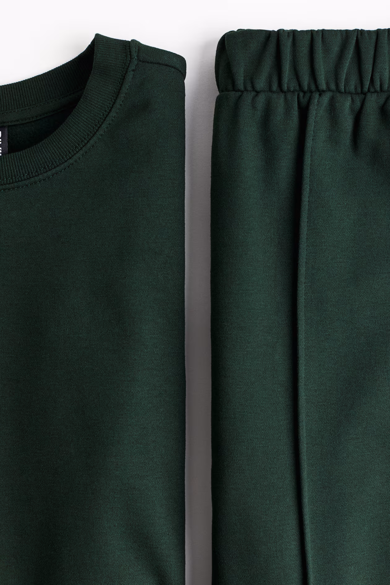 Sweatsuit with a sweatshirt and sweatpant joggers with a soft, brushed inside. Sweatshirt with a round neckline, dropped shoulders, and ribbing at neckline, cuffs, and hem. Joggers with covered elastic at waistband and wide legs with stitched creases at front.