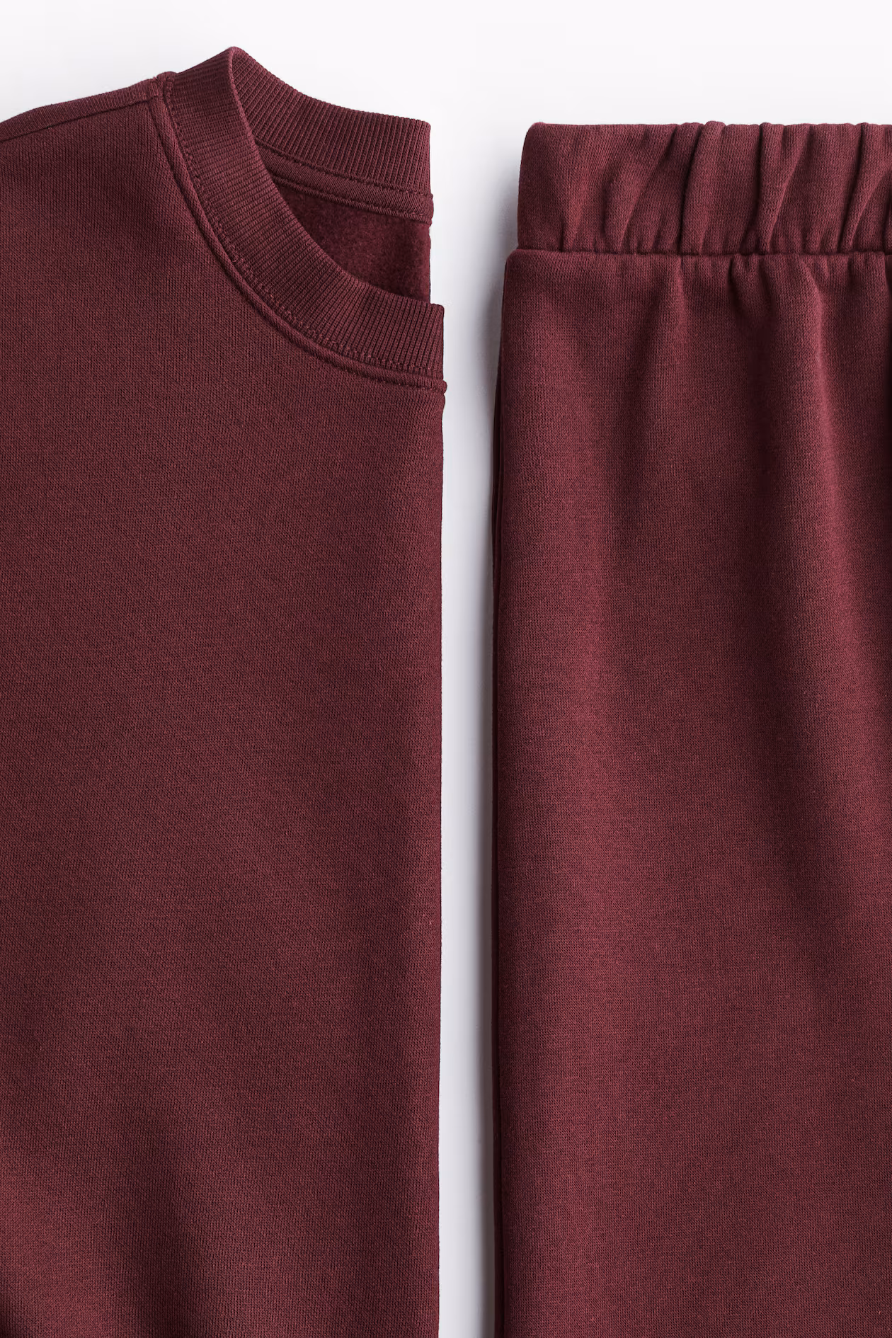 Sweatsuit with a sweatshirt and sweatpant joggers with a soft, brushed inside. Sweatshirt with a round neckline, dropped shoulders, and ribbing at neckline, cuffs, and hem. Joggers with covered elastic at waistband and wide legs with stitched creases at front.