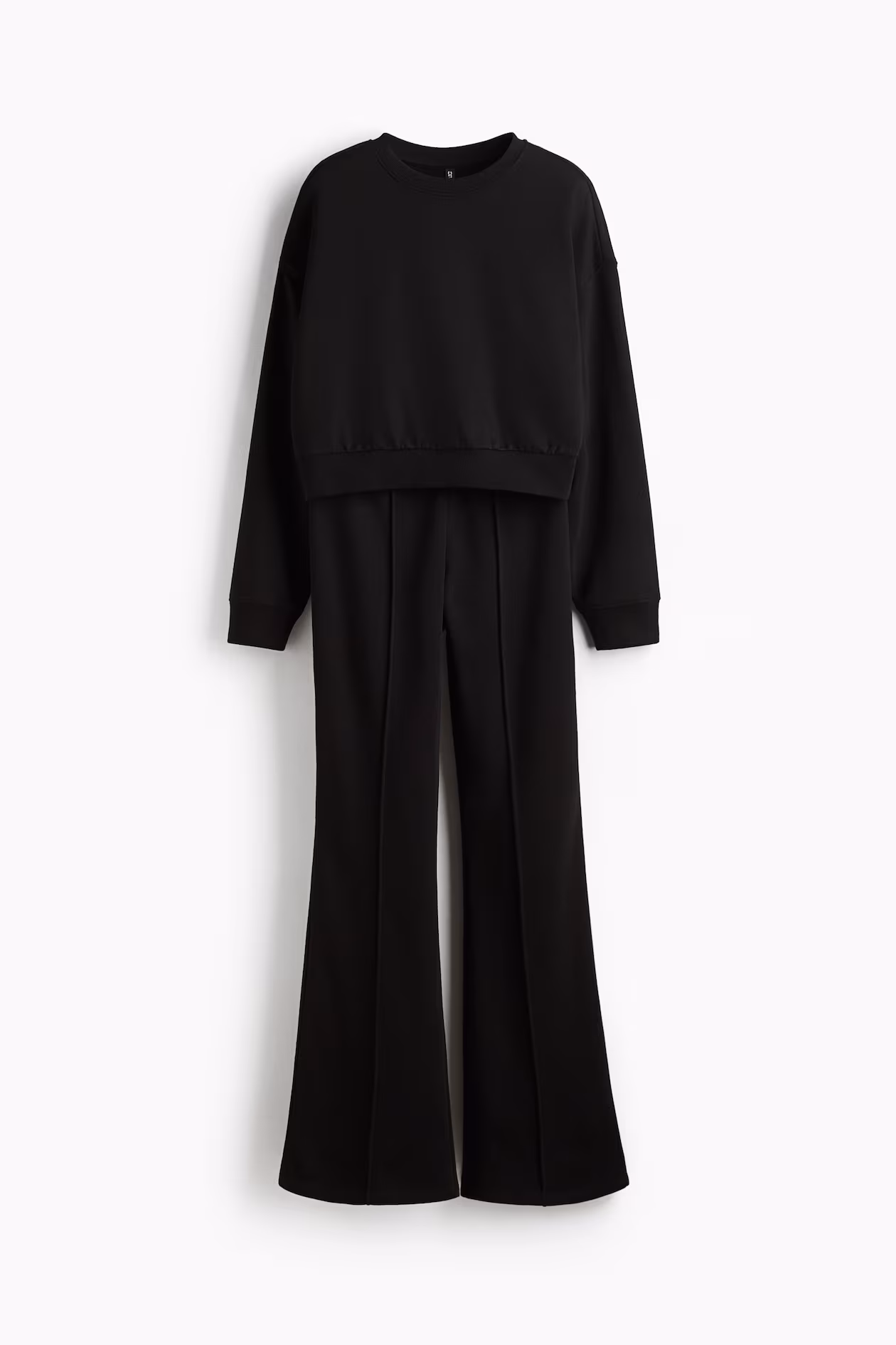 Sweatsuit with a sweatshirt and sweatpant joggers with a soft, brushed inside. Sweatshirt with a round neckline, dropped shoulders, and ribbing at neckline, cuffs, and hem. Joggers with covered elastic at waistband and wide legs with stitched creases at front.