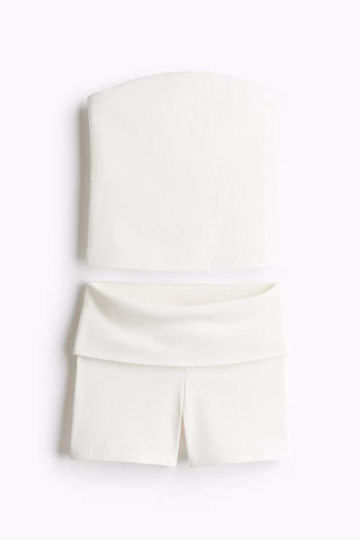 Set in ribbed cotton jersey with a tube top and shorts. Top with concealed elastic at upper edge and lining over bust. Shorts with a high waist and foldover waistband.