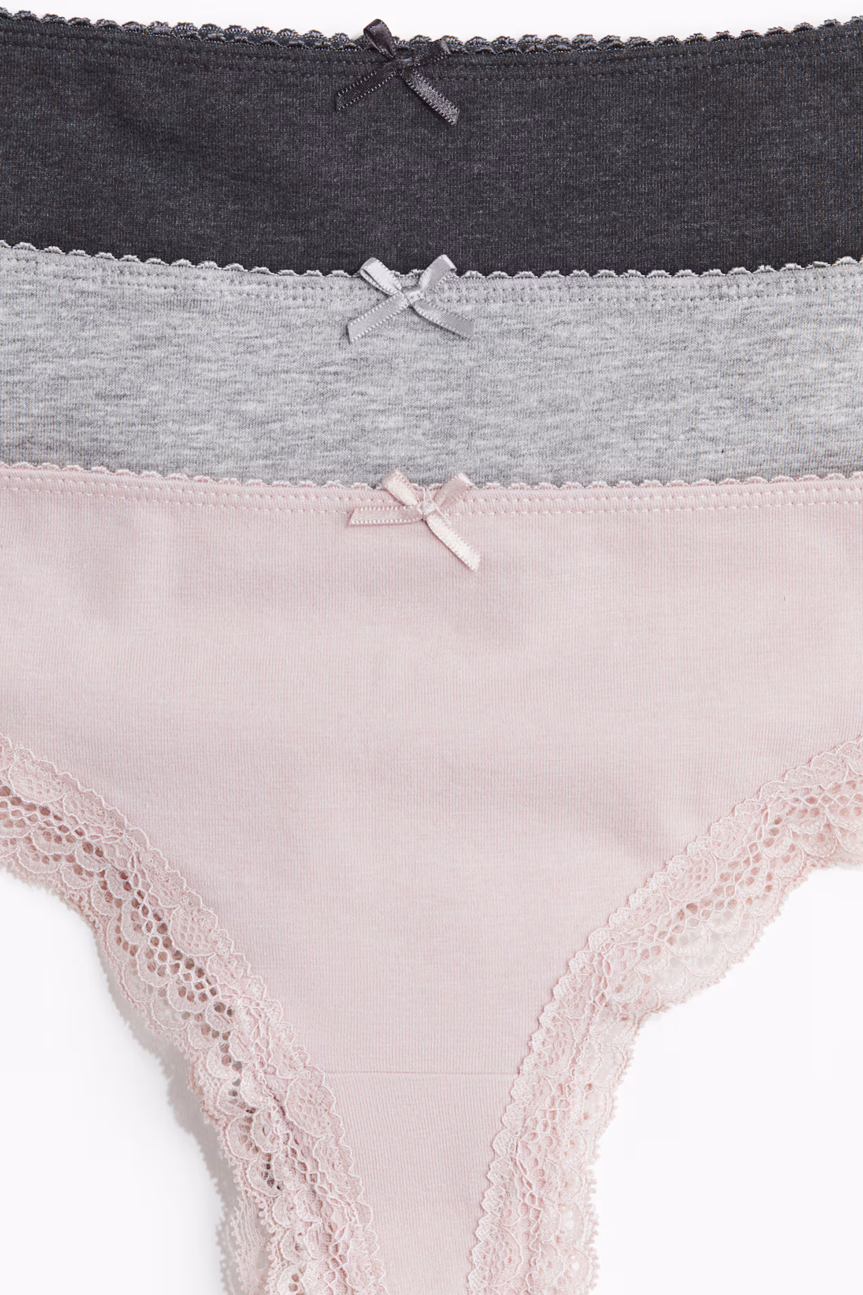 Brazilian briefs with lace trim. Low waist, high cut back, and lined gusset.