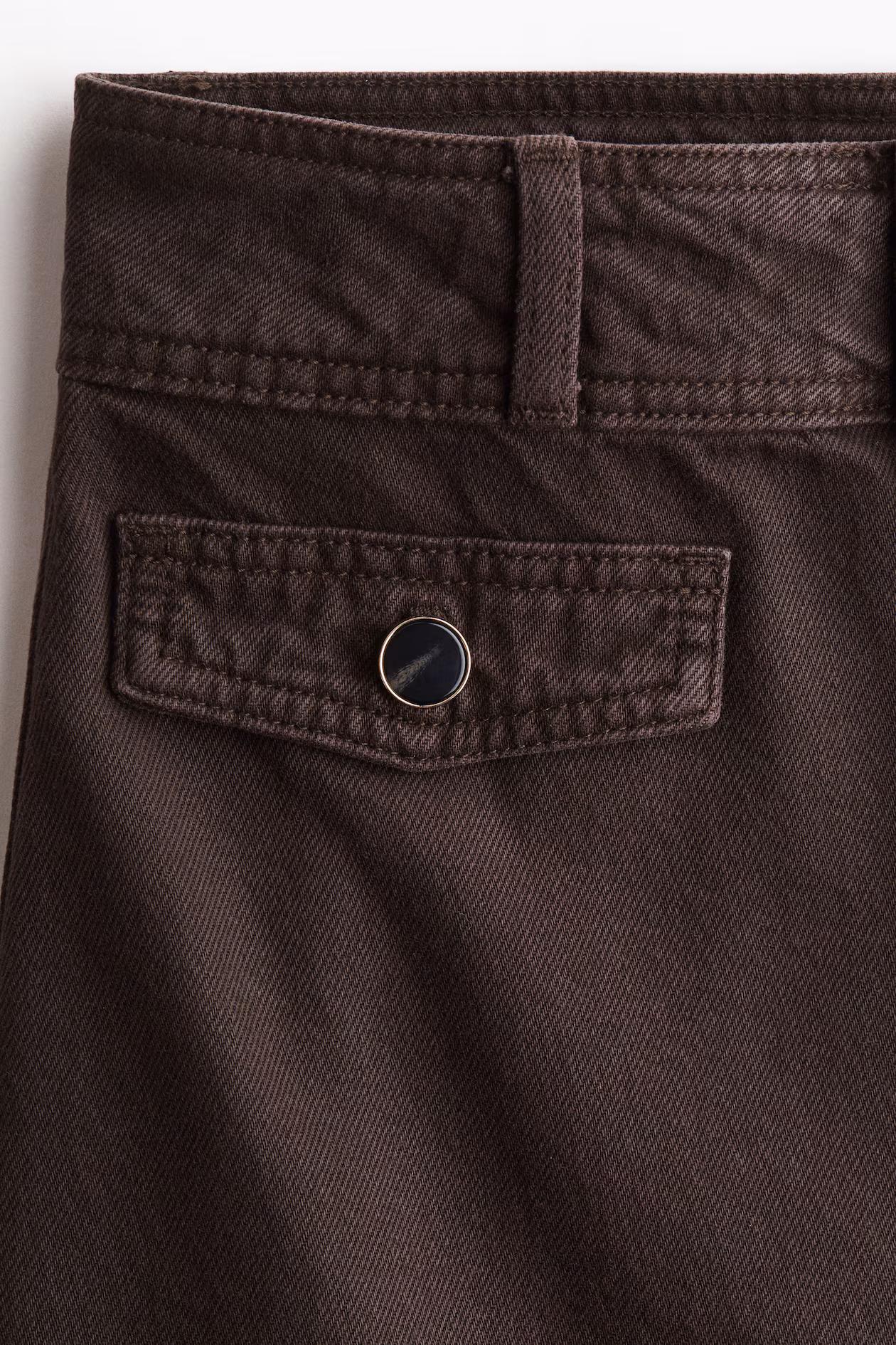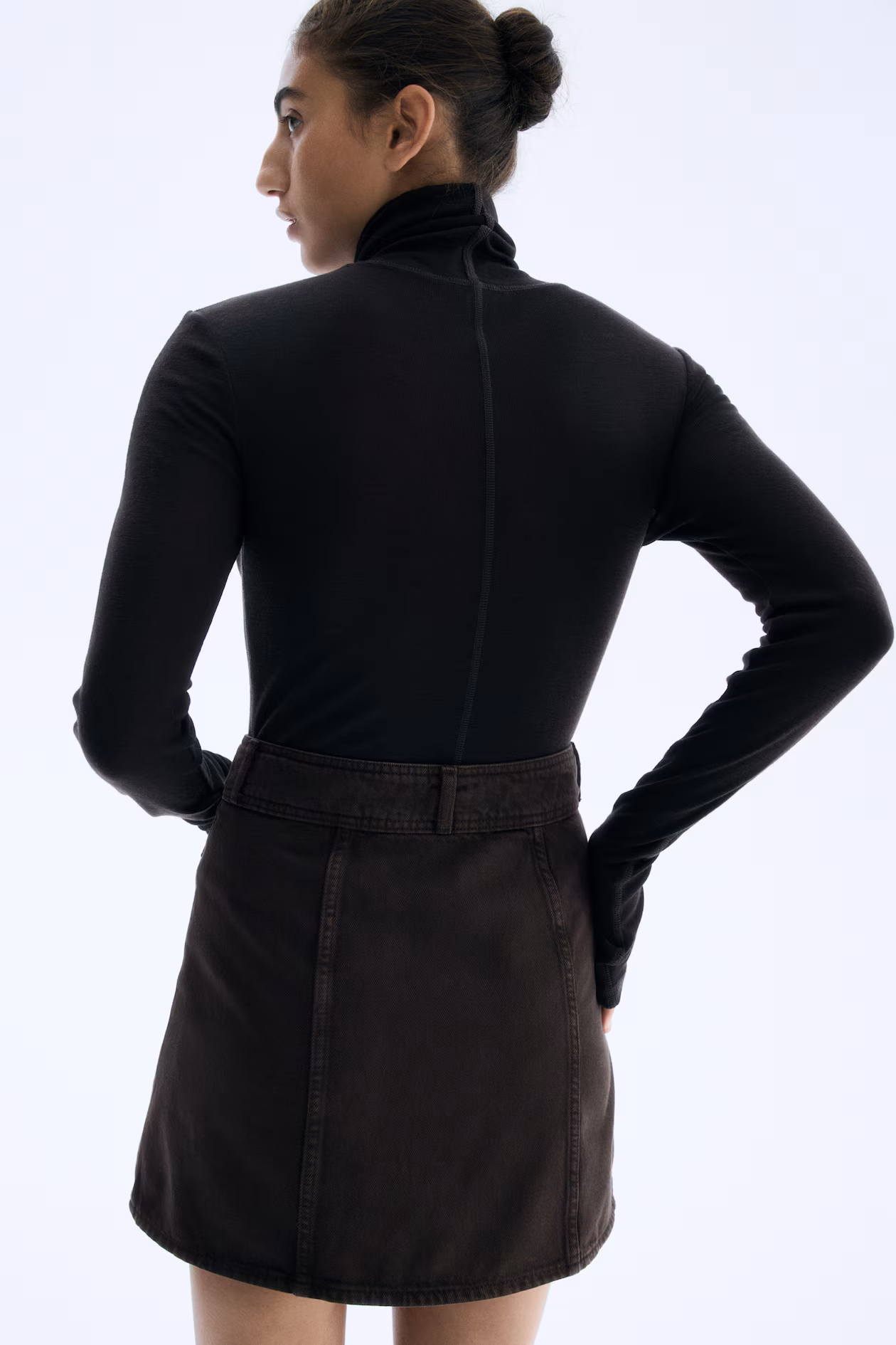 A-line mini skirt in rigid cotton denim. High waist, buttons full length of front, and decorative pocket flaps with button.