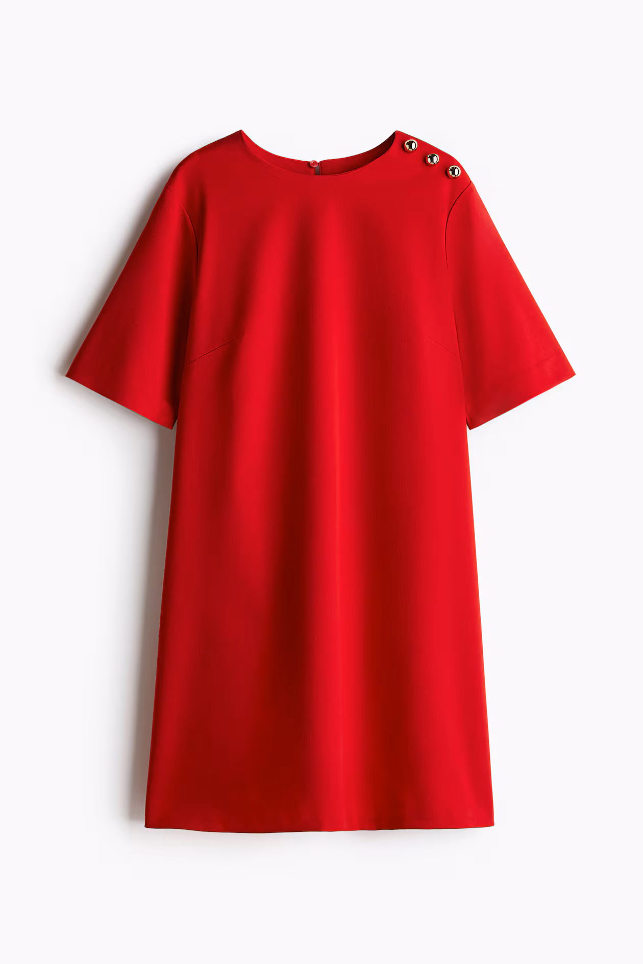 Short dress in woven fabric with darts at bust. Round neckline, keyhole opening at back of neck with concealed button, and short sleeves. Straight-cut hem. Unlined.