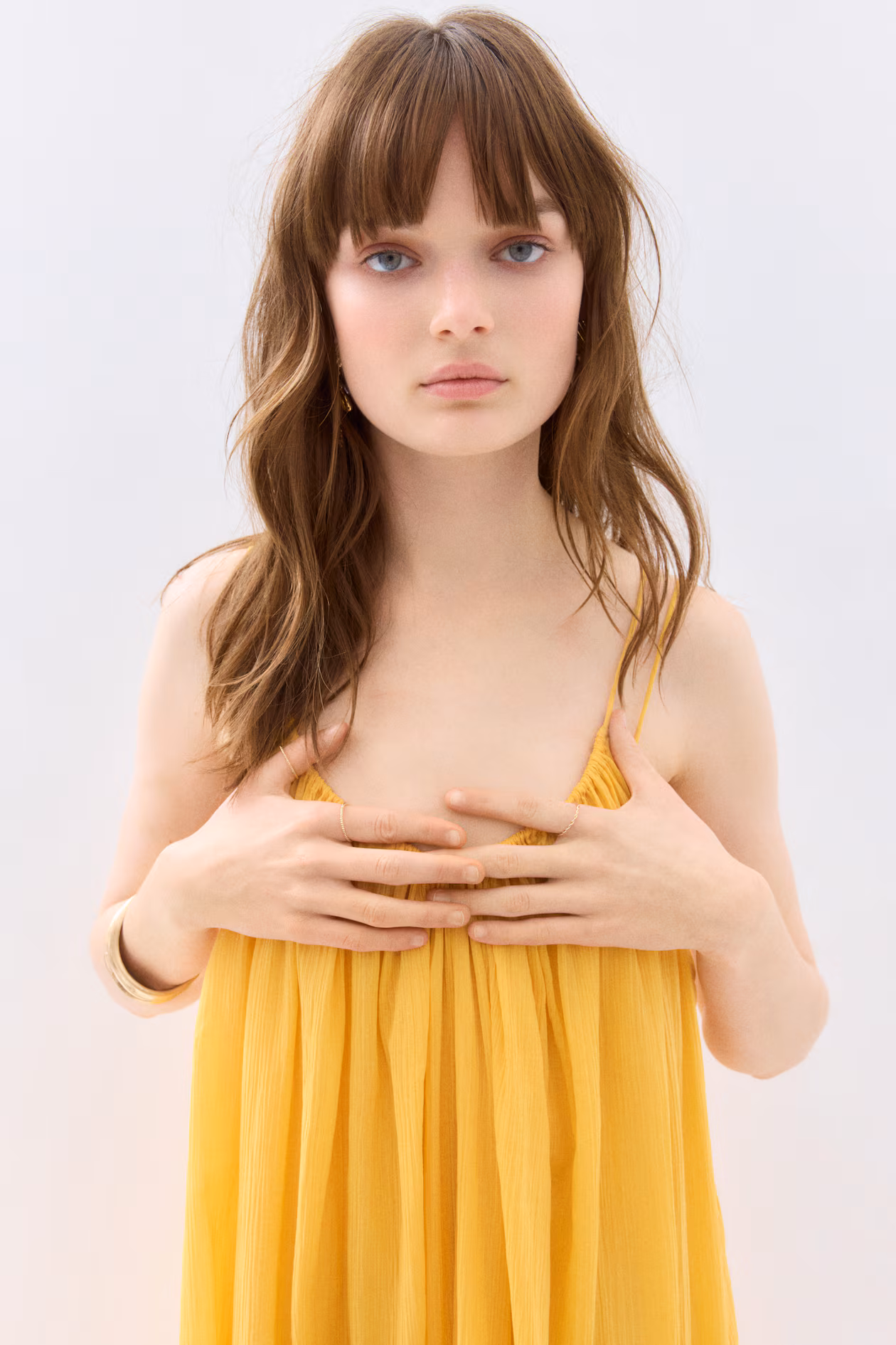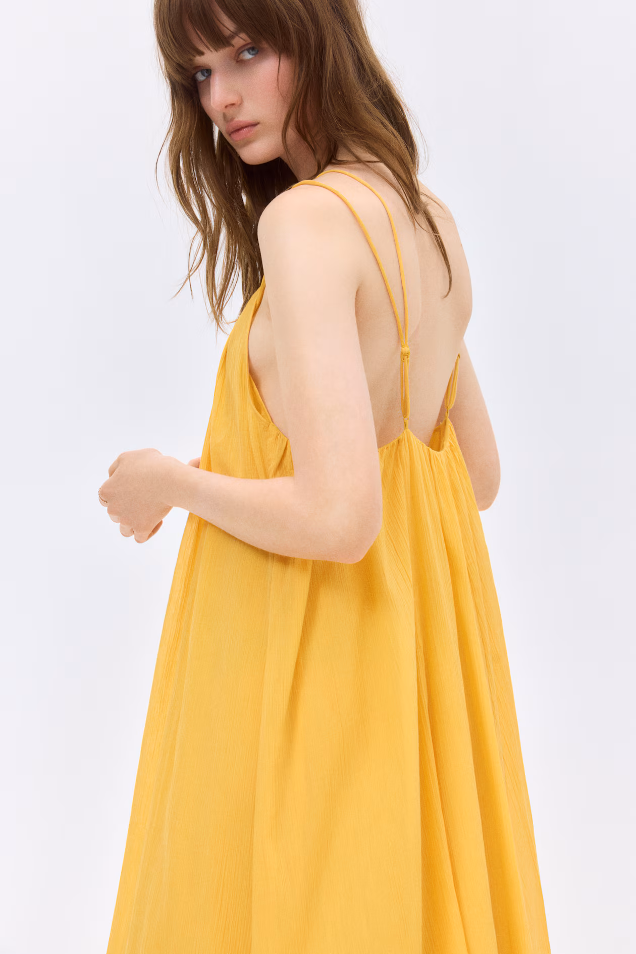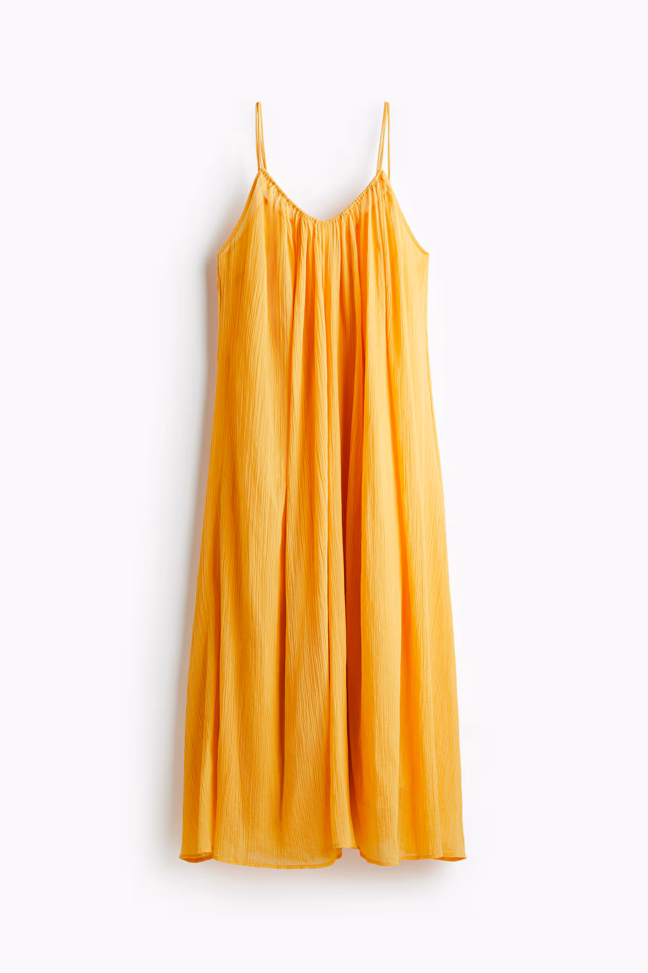 Long, loose-fit dress in woven, crinkled cotton with an airy A-line silhouette. Double, adjustable, extra-narrow shoulder straps, V-neck, gathers at top, and a scoop neckline at back. Chiffon lining.