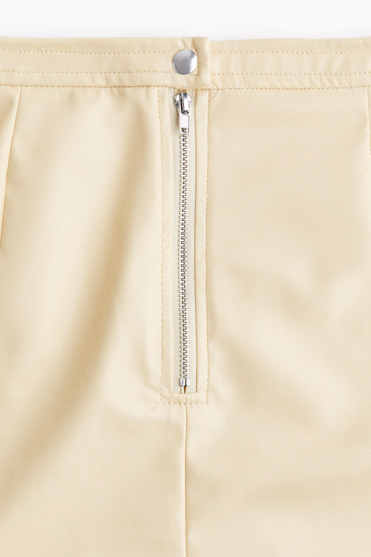 A-line mini skirt. Diagonal side pockets and a visible zipper at back with snap fastener. Unlined.
