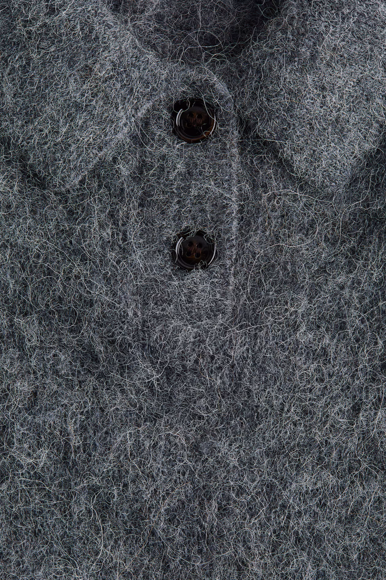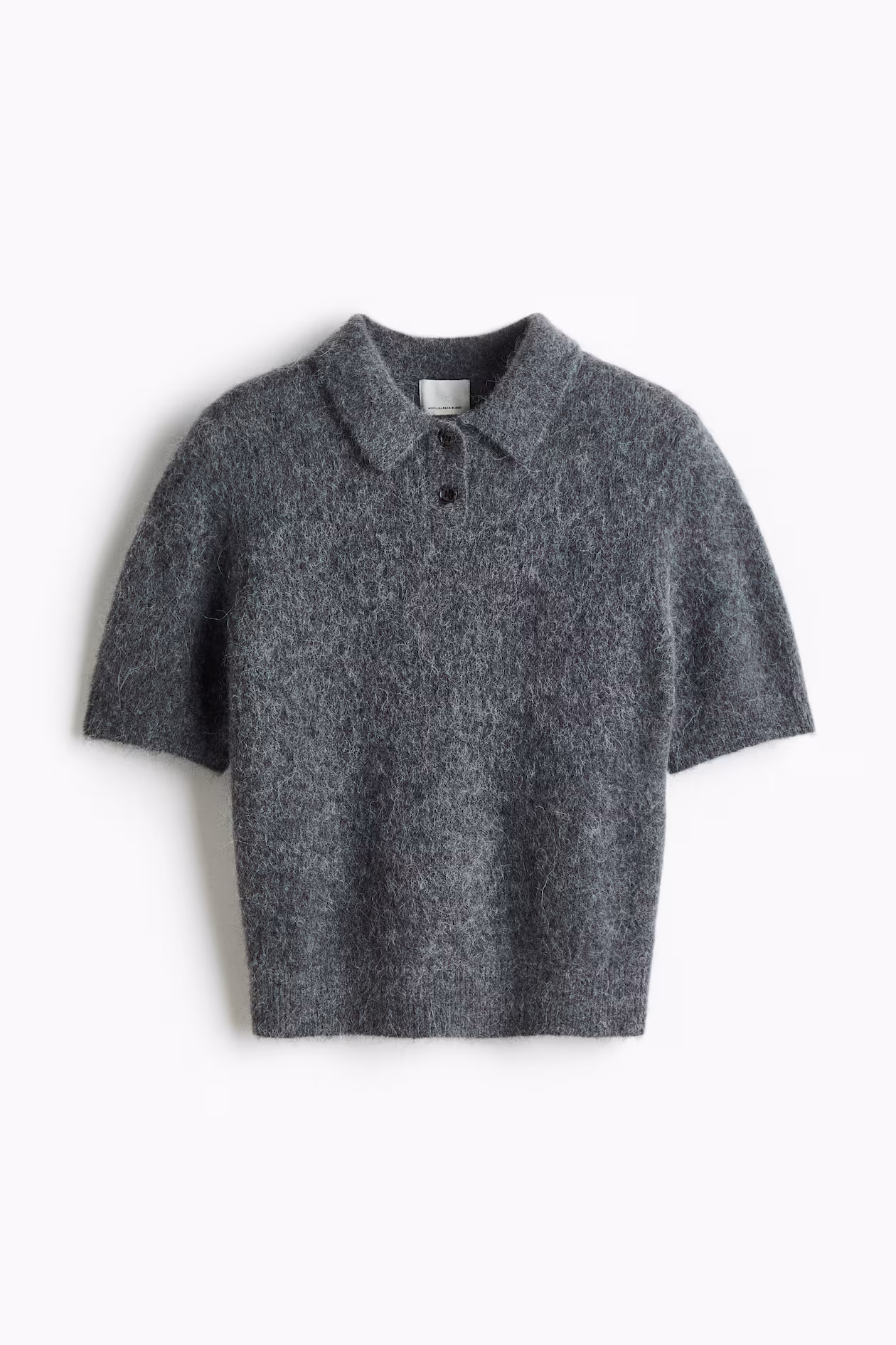Polo shirt in a soft knit with alpaca and wool content. Collar, short button placket, and short sleeves. Ribbing at cuffs and hem.