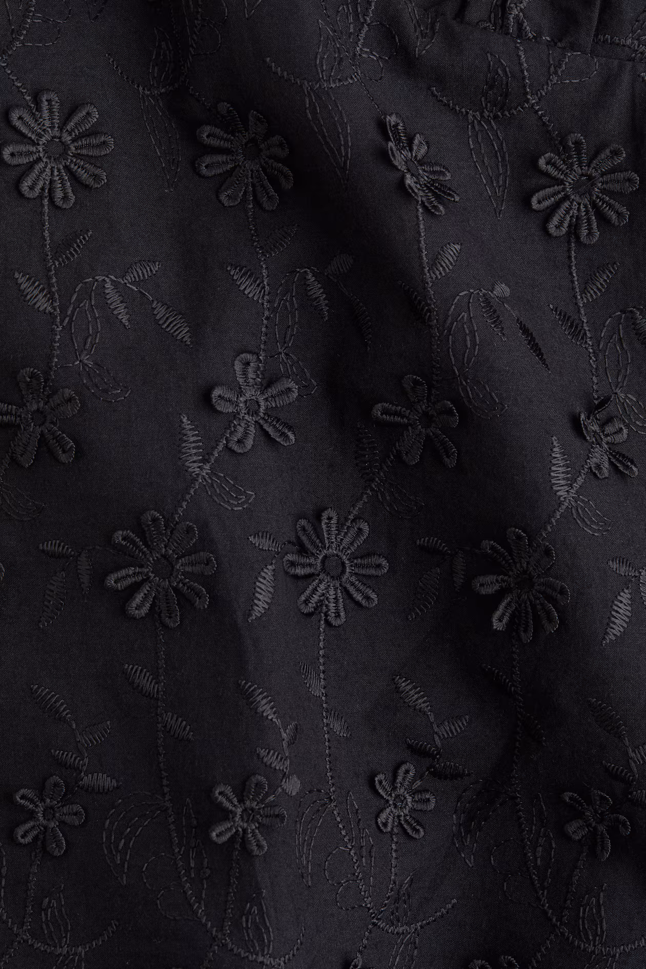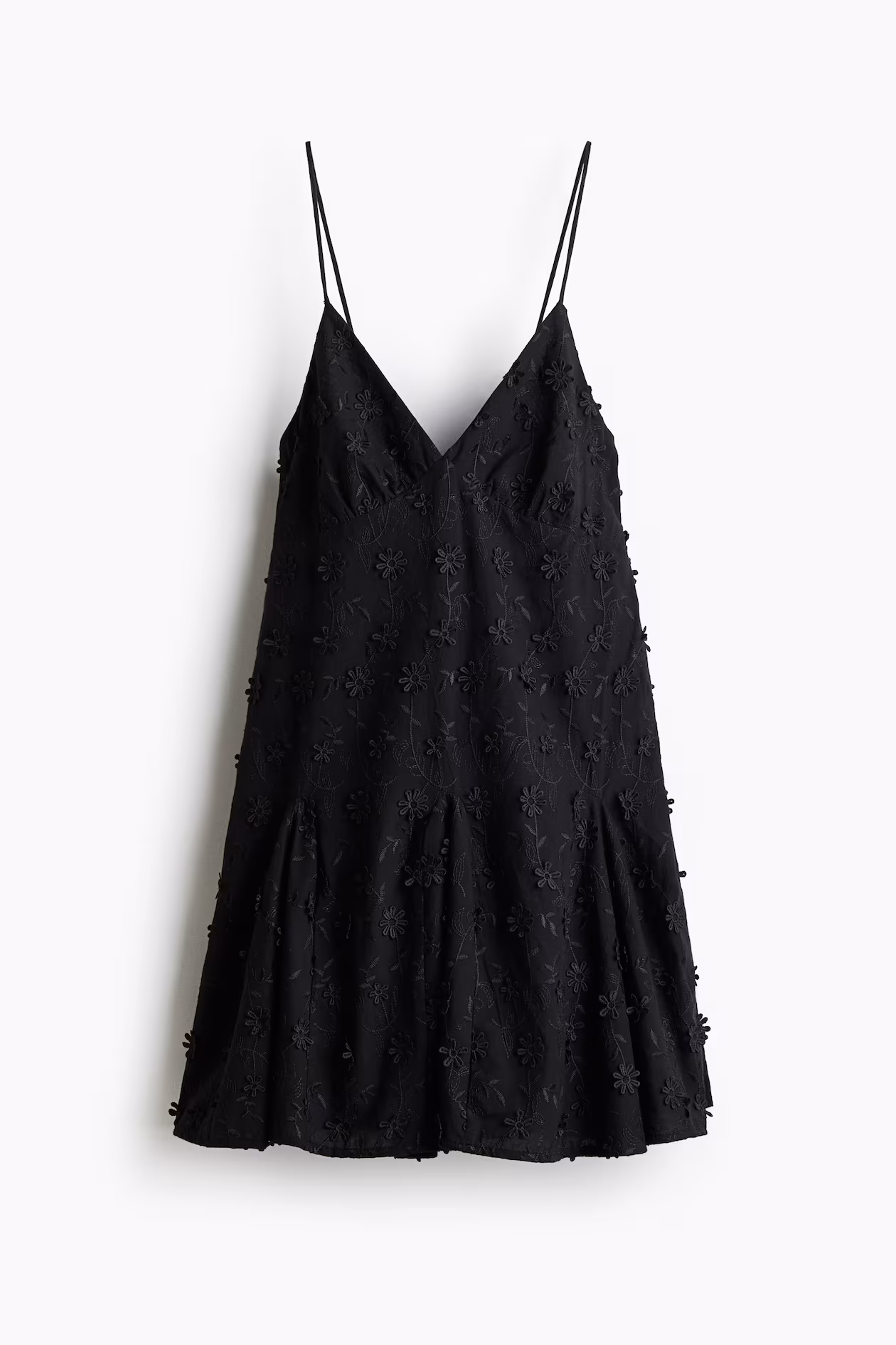 Short, A-line dress in airy, woven cotton with tone-on-tone embroidery and floral appliqués. Extra-narrow shoulder straps that thread through small loops and tie at back. V-neck at front, low-cut back, and gathered seam below bust. Narrow elastic at back and a flared skirt with godet pleats for added volume. Lined.