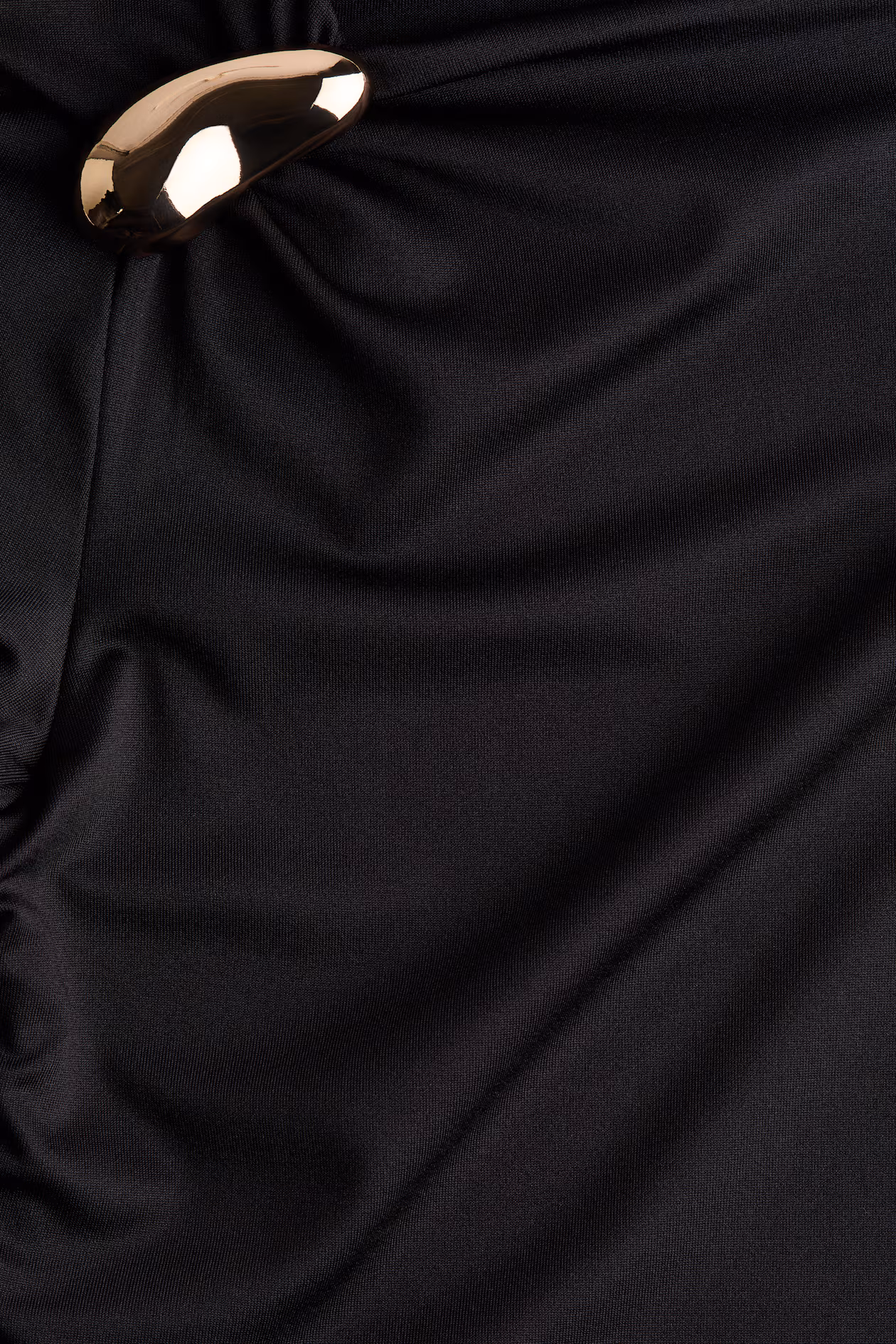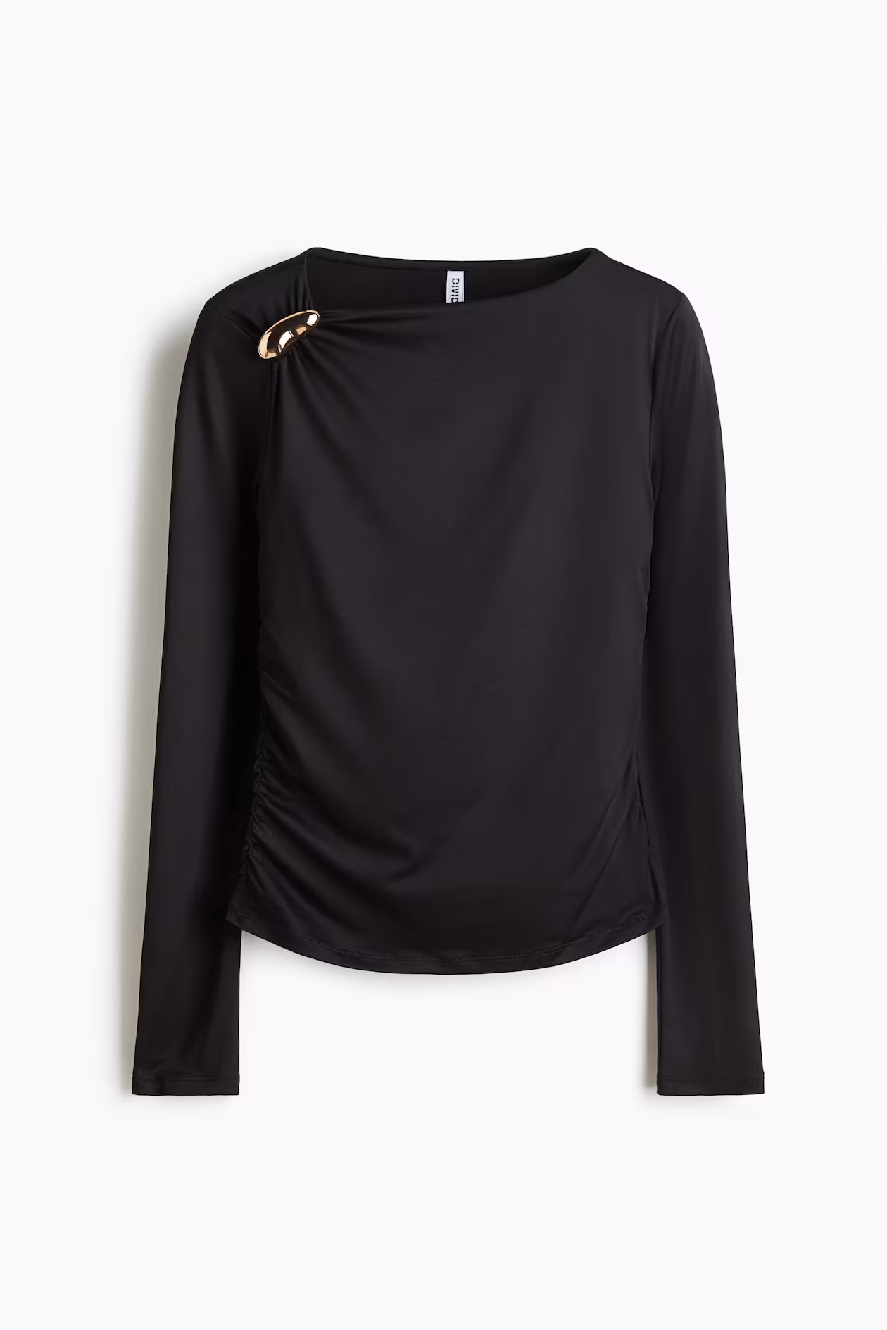 Fitted, long-sleeved top in soft jersey. Asymmetric neckline with gathers and a decorative metal detail at one side. Gathers at sides for a gently draped effect.
