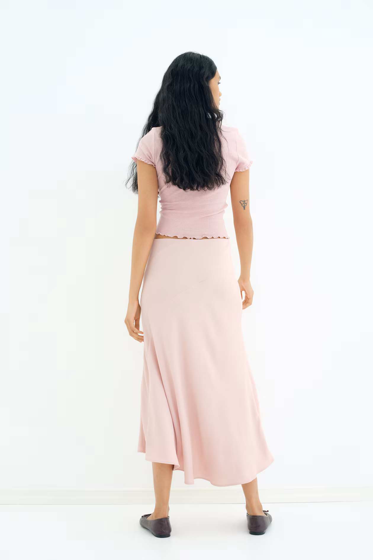Calf-length skirt in woven fabric. Covered elastic at waistband, diagonal seams at front and back of waist extending to knee level, and a flared, asymmetric hem.