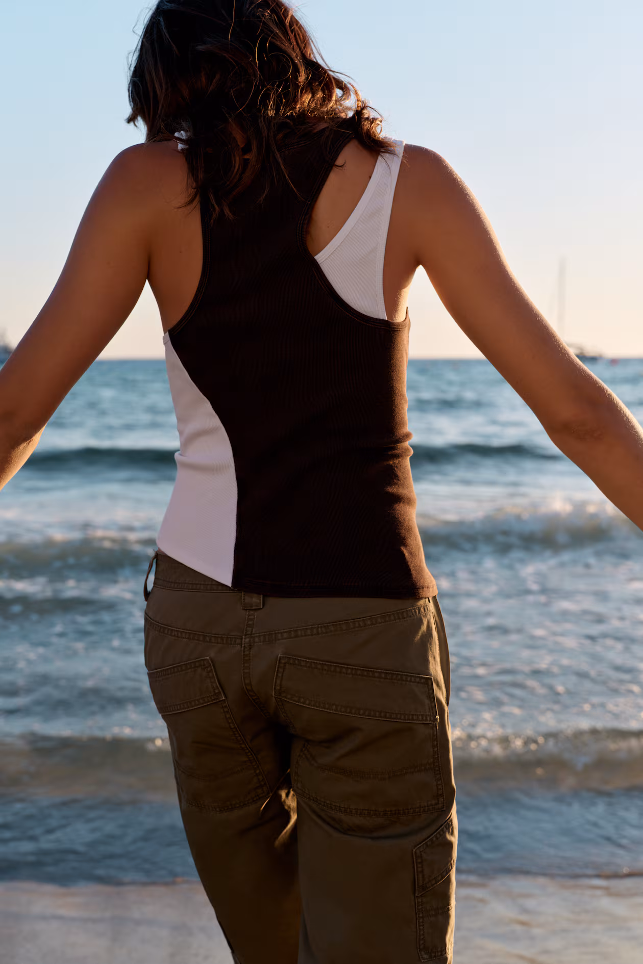 Racerback tank top in ribbed cotton jersey with contrasting washed-look sections. Two shoulder straps at one side. One shoulder strap extends to a diagonal seam at front, finishing in a slit at hem with narrow ties. Classic round neckline and an asymmetric hem.