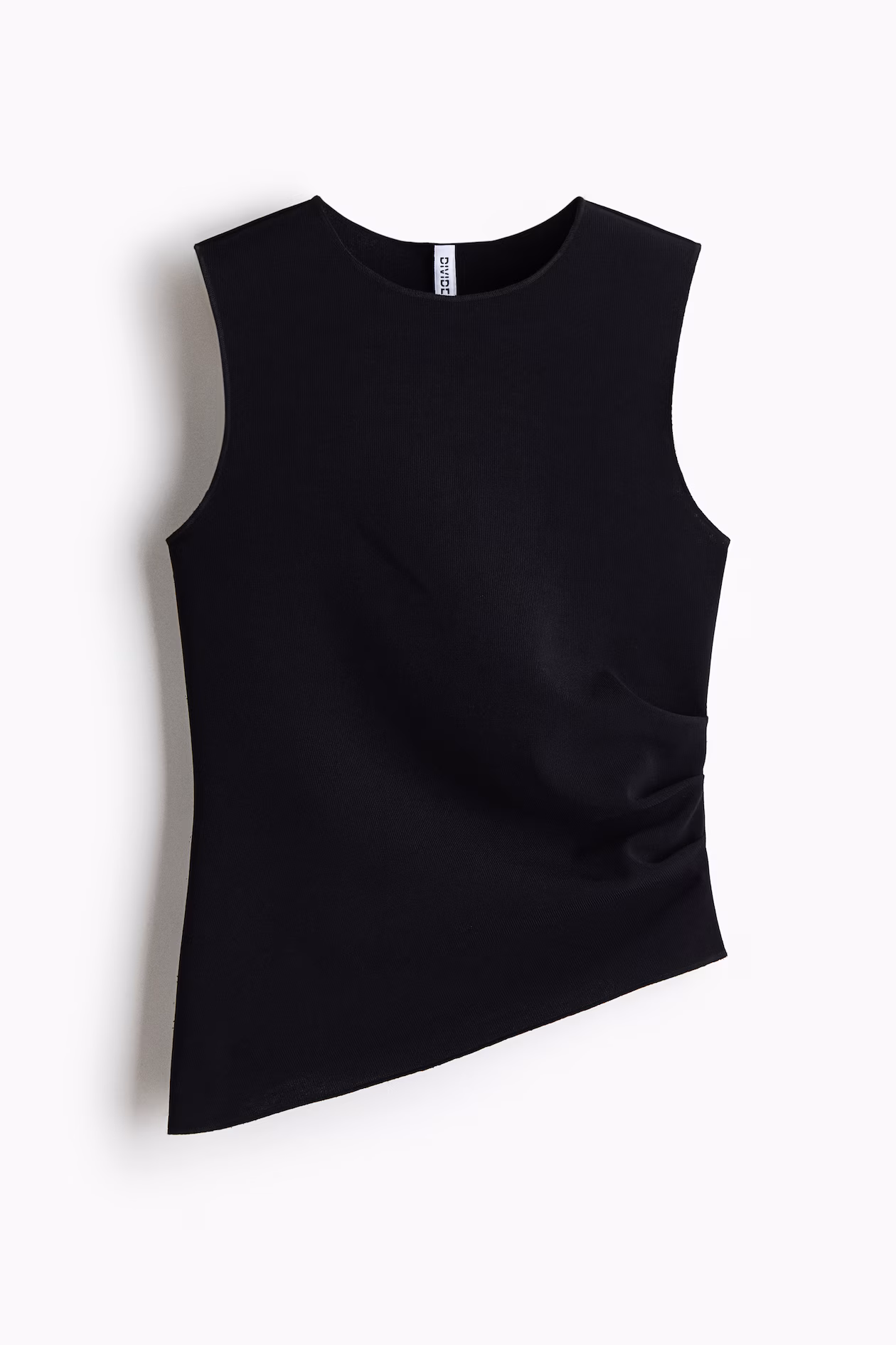 Fitted, sleeveless top in thick jersey. Round neckline, pleats at one side, and an asymmetric hem.