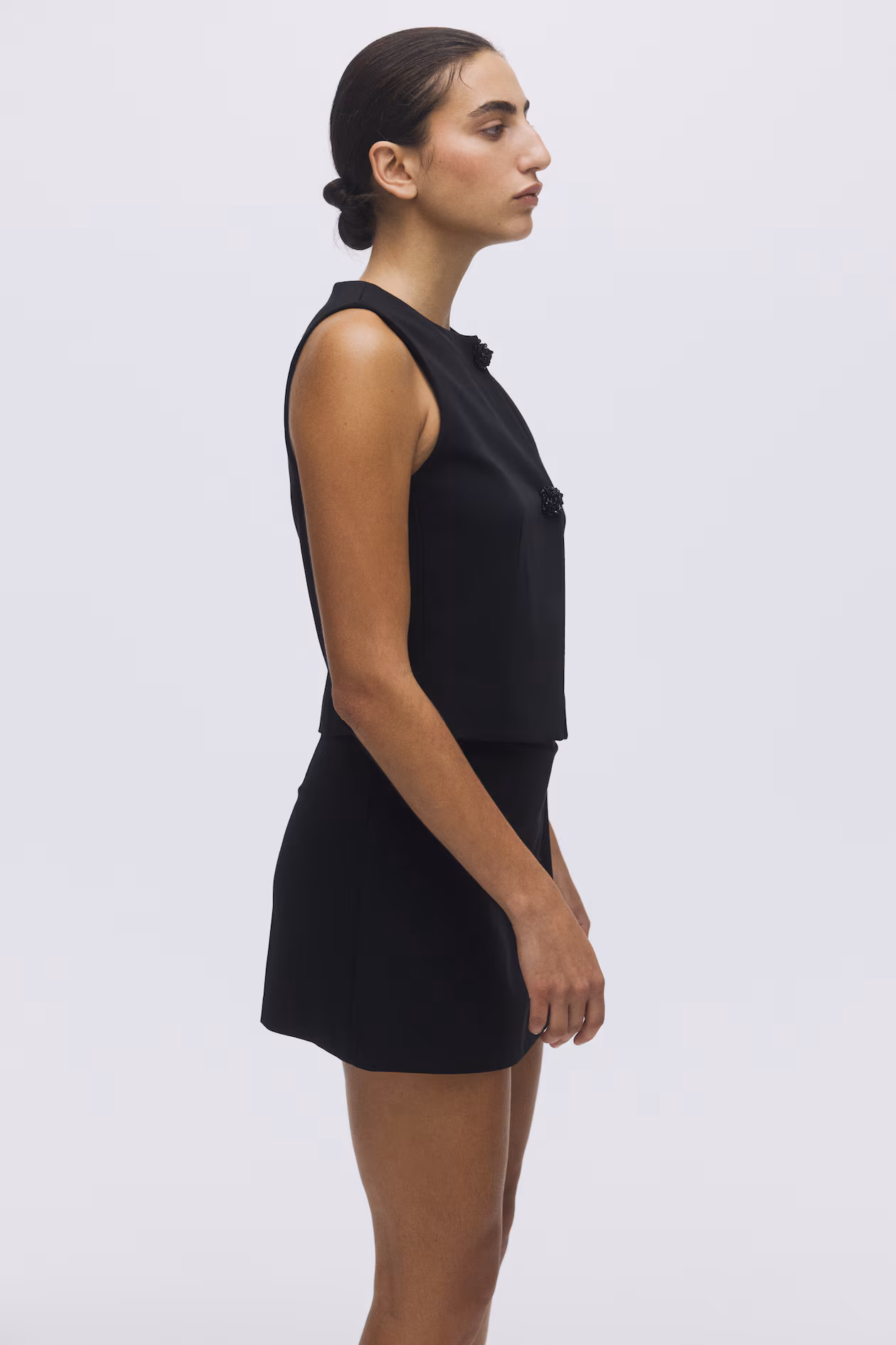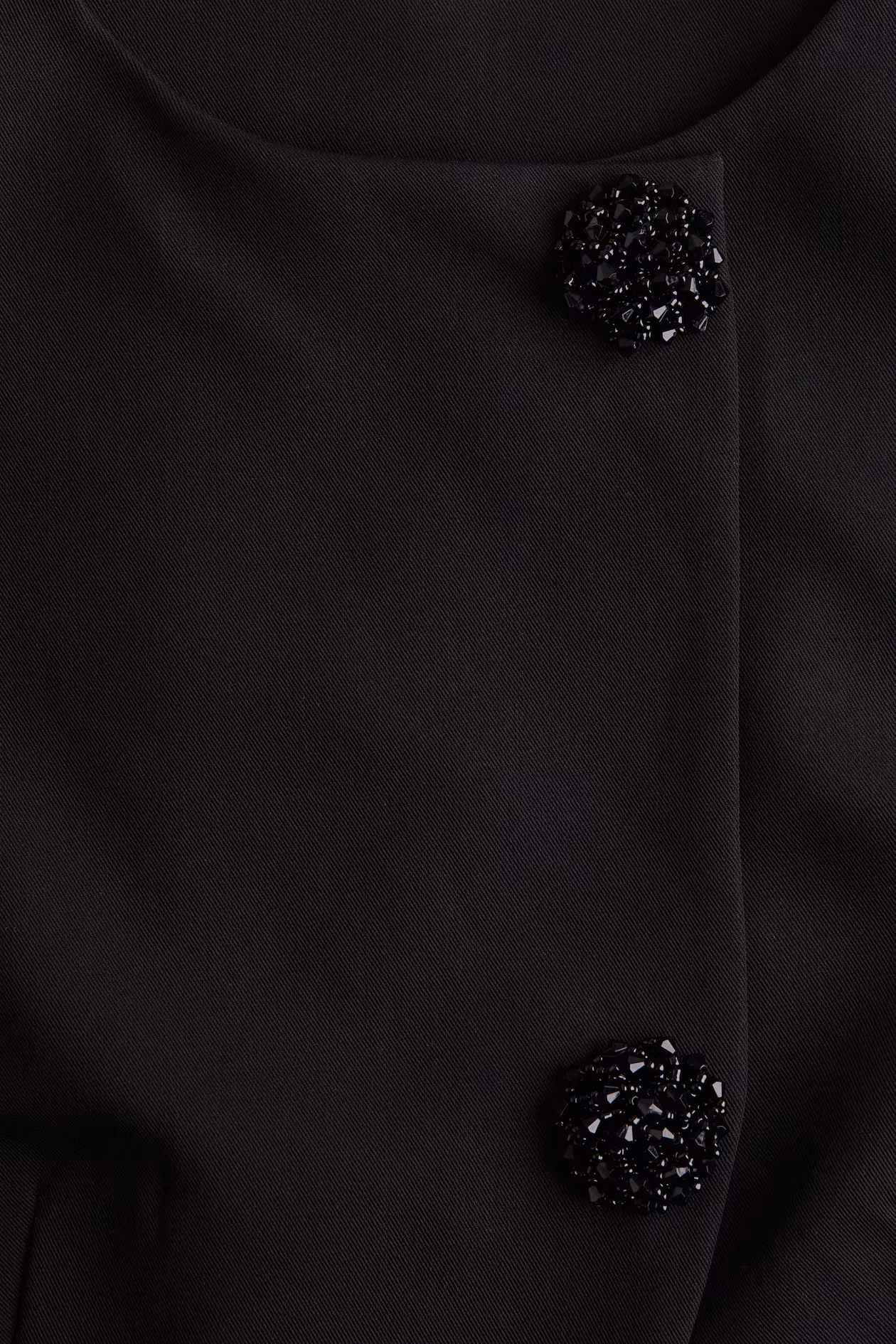 Short vest in cotton-blend twill with a round neckline. Asymmetric wrapover front with snap fasteners at top. Lined.