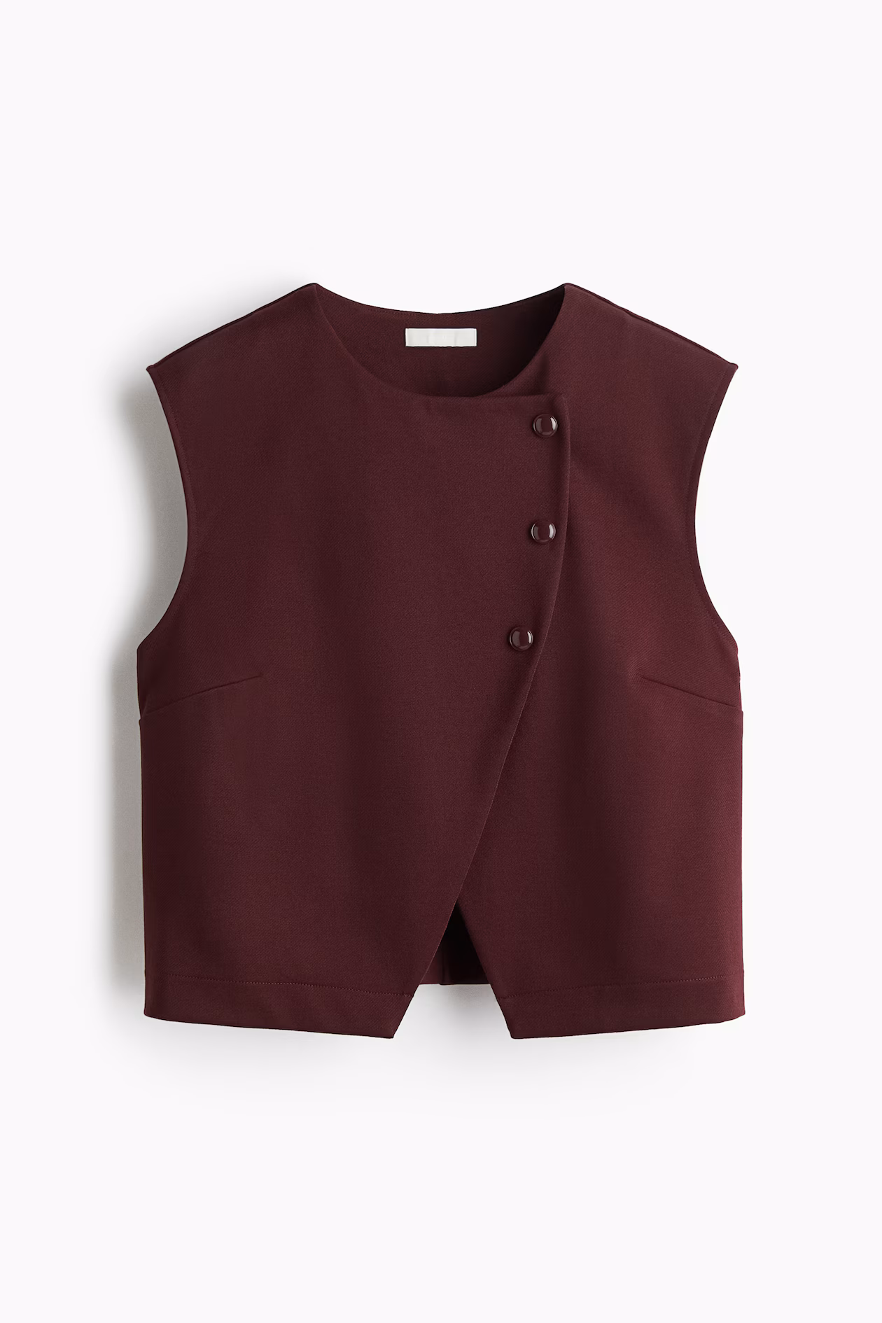 Short vest in thick jersey. Round neckline, asymmetric wrapover front, and snap fasteners at top.